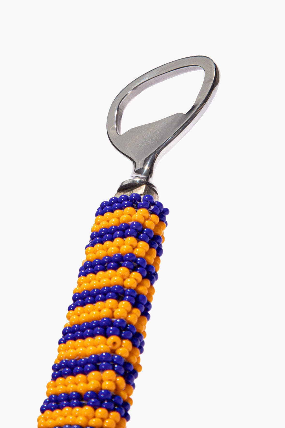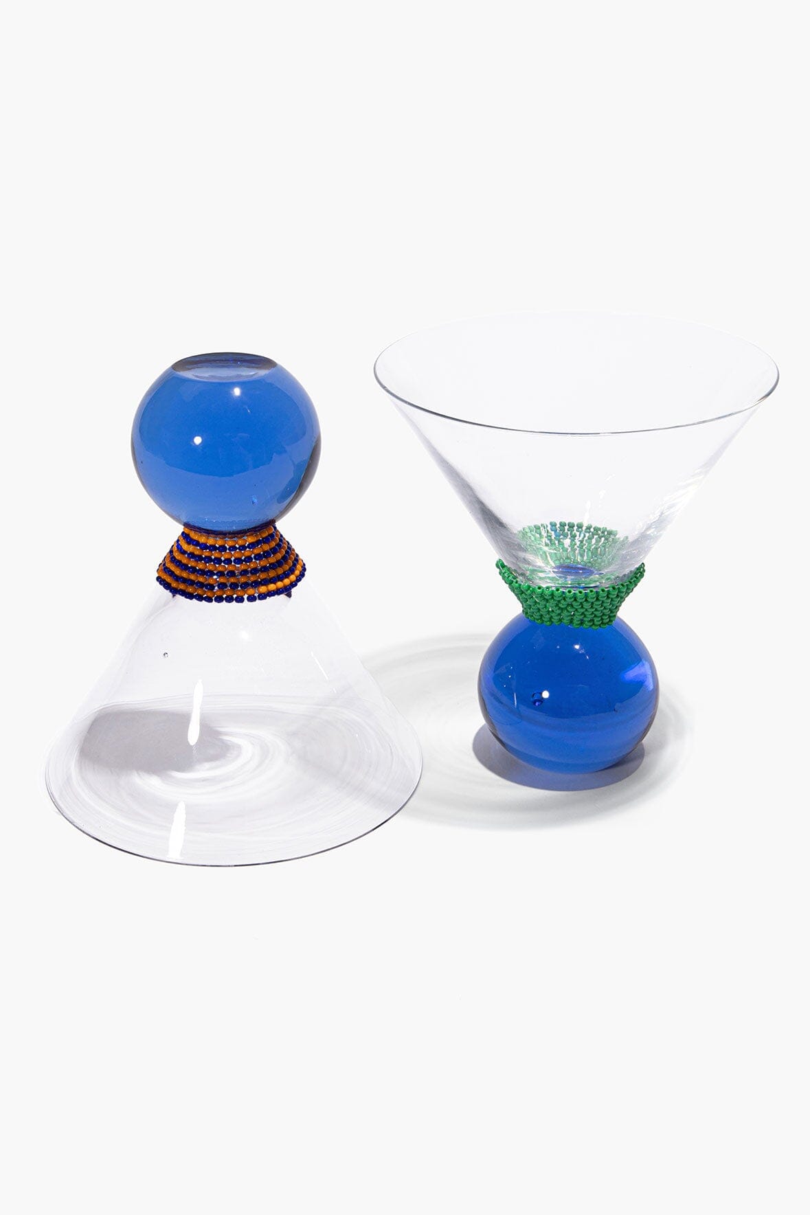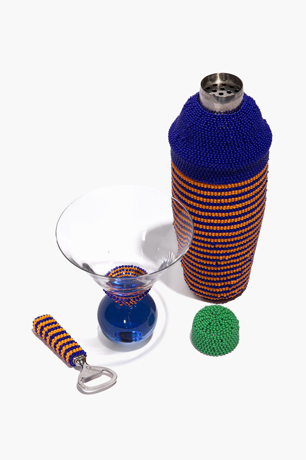 A one-of-a-kind Martini Bar Set is wrapped in Pacific-blue and citrus beadwork. The intricate surface transforms a classic bar set into a centerpiece. This set includes one cocktail shaker, one bottle opener, and two martini glasses.