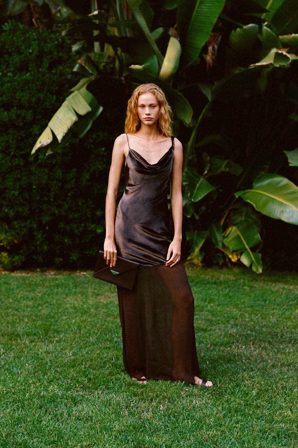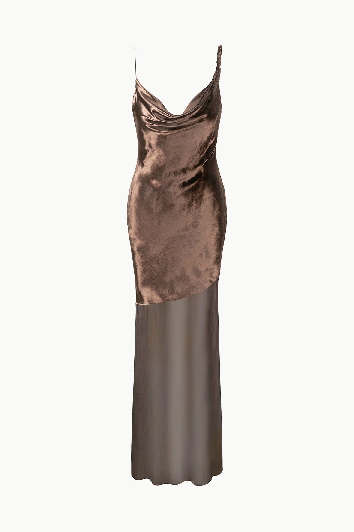 The Beaton Dress is an asymmetrical maxi-length dress with a velvet bodice that flows into a sheer crinkle chiffon skirt. It features a cowl neckline with mismatched straps and an open upper back.