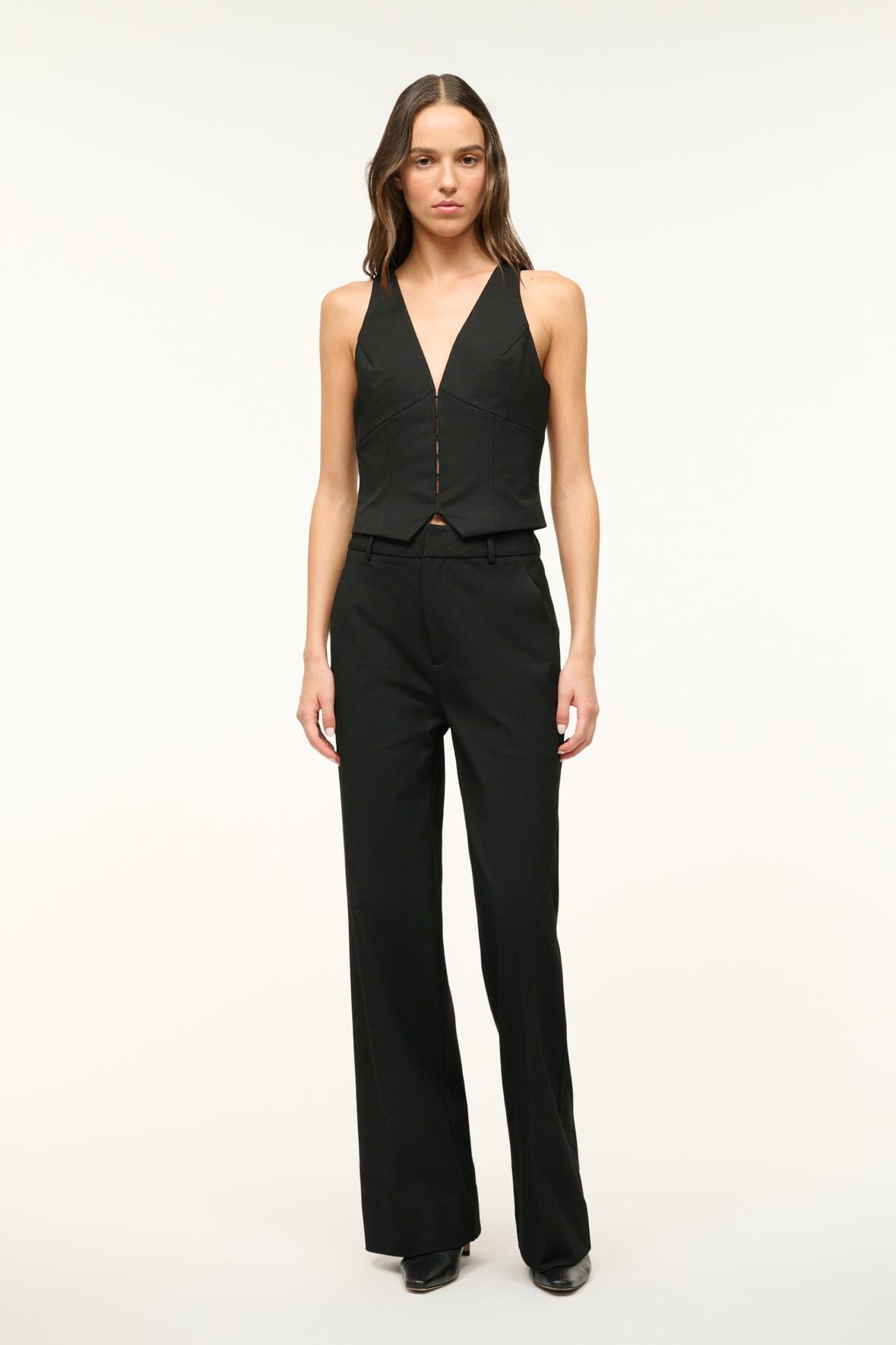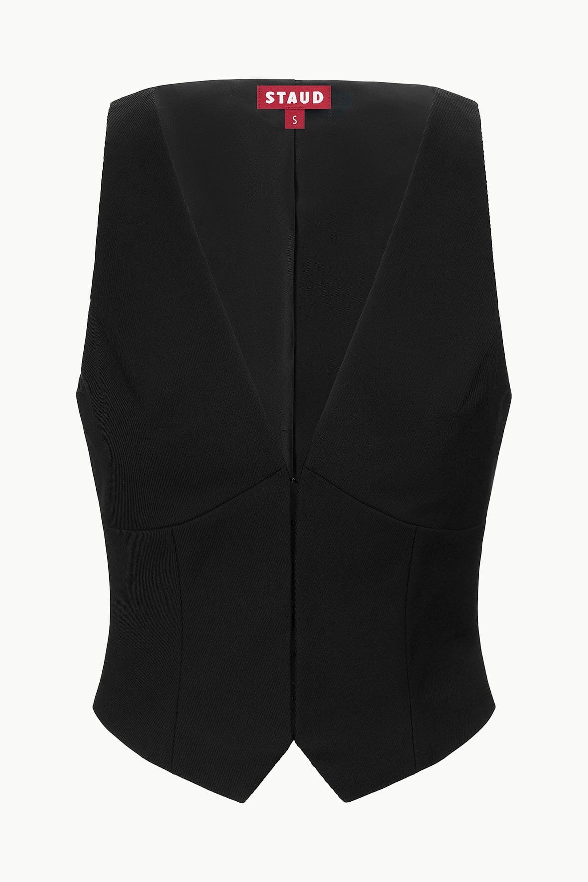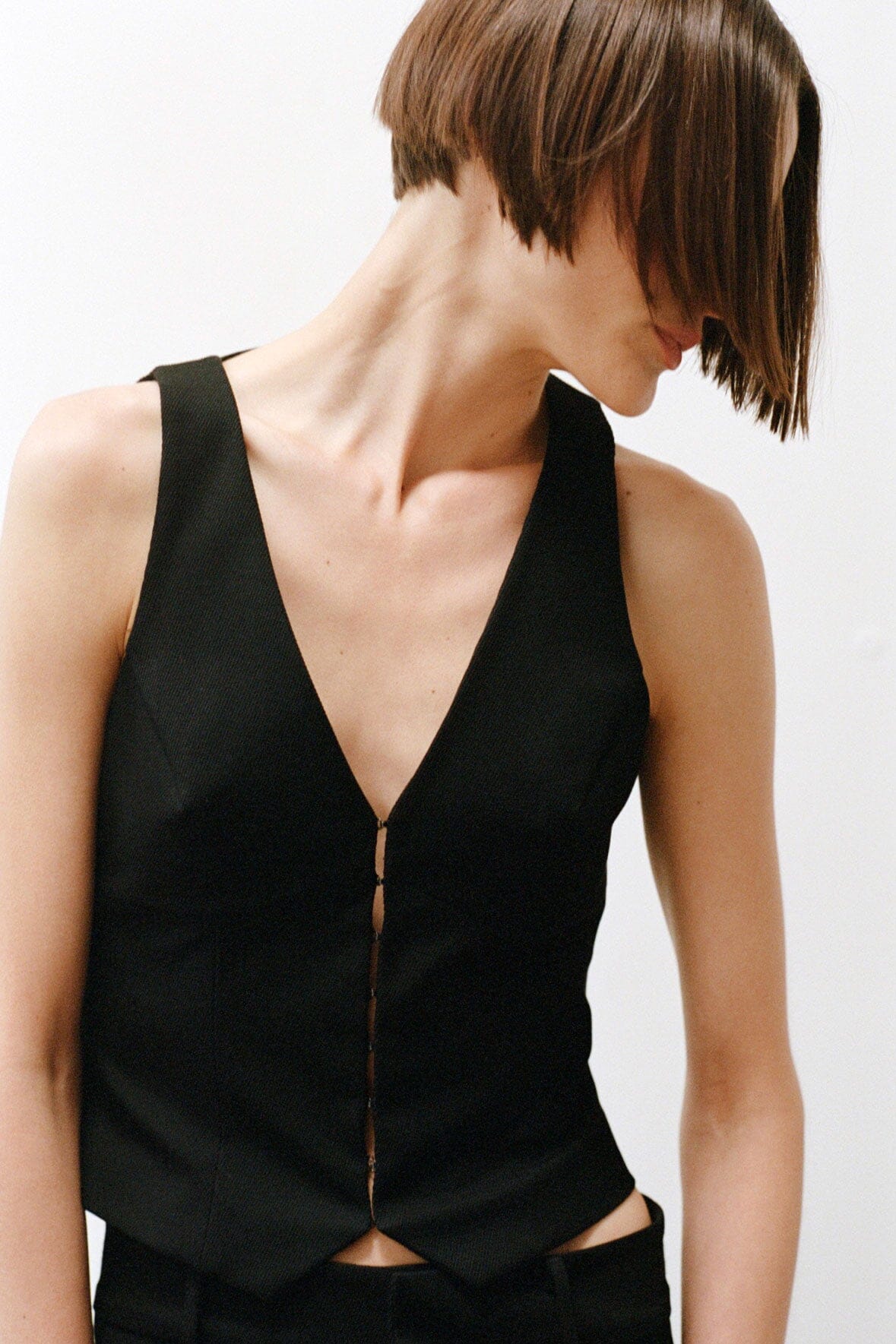 The Bevel Top is a suiting vest, updated in a stretch twill. This style is fitted throughout the body and features hook and eye closures in the front.