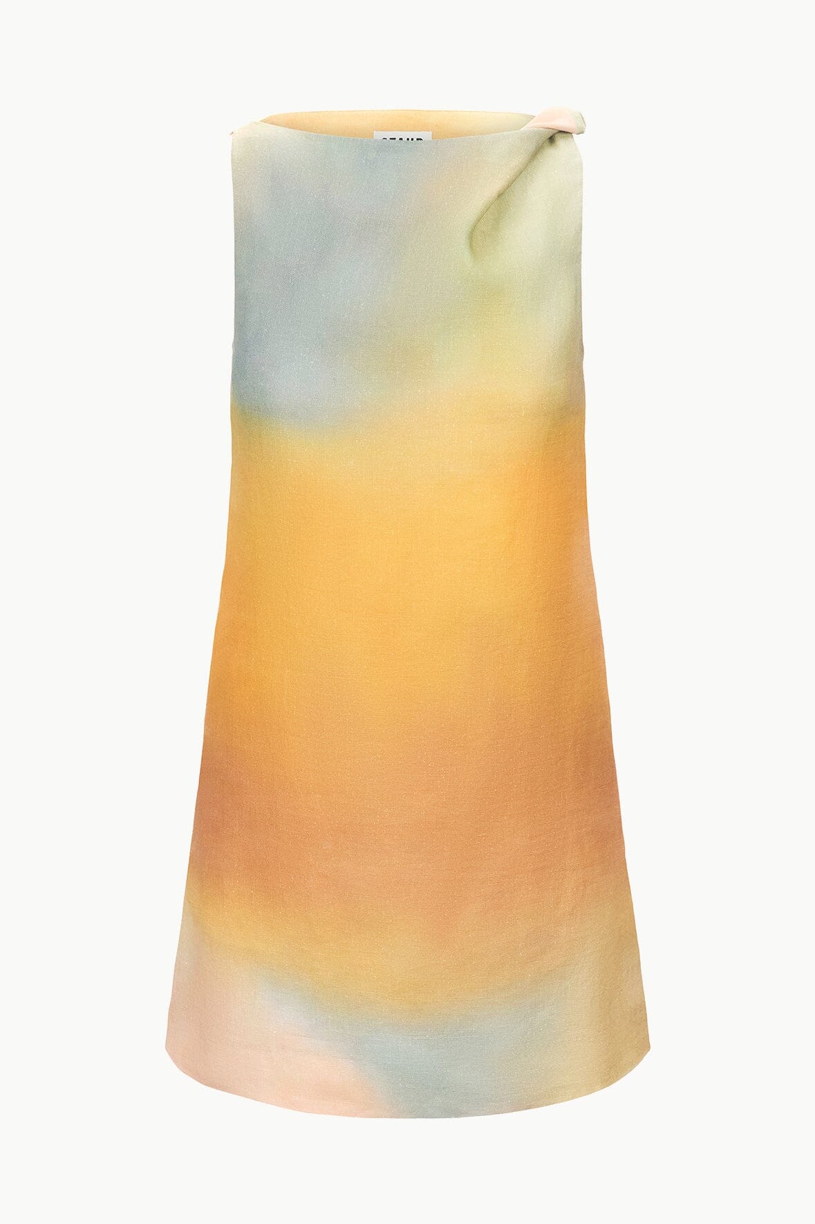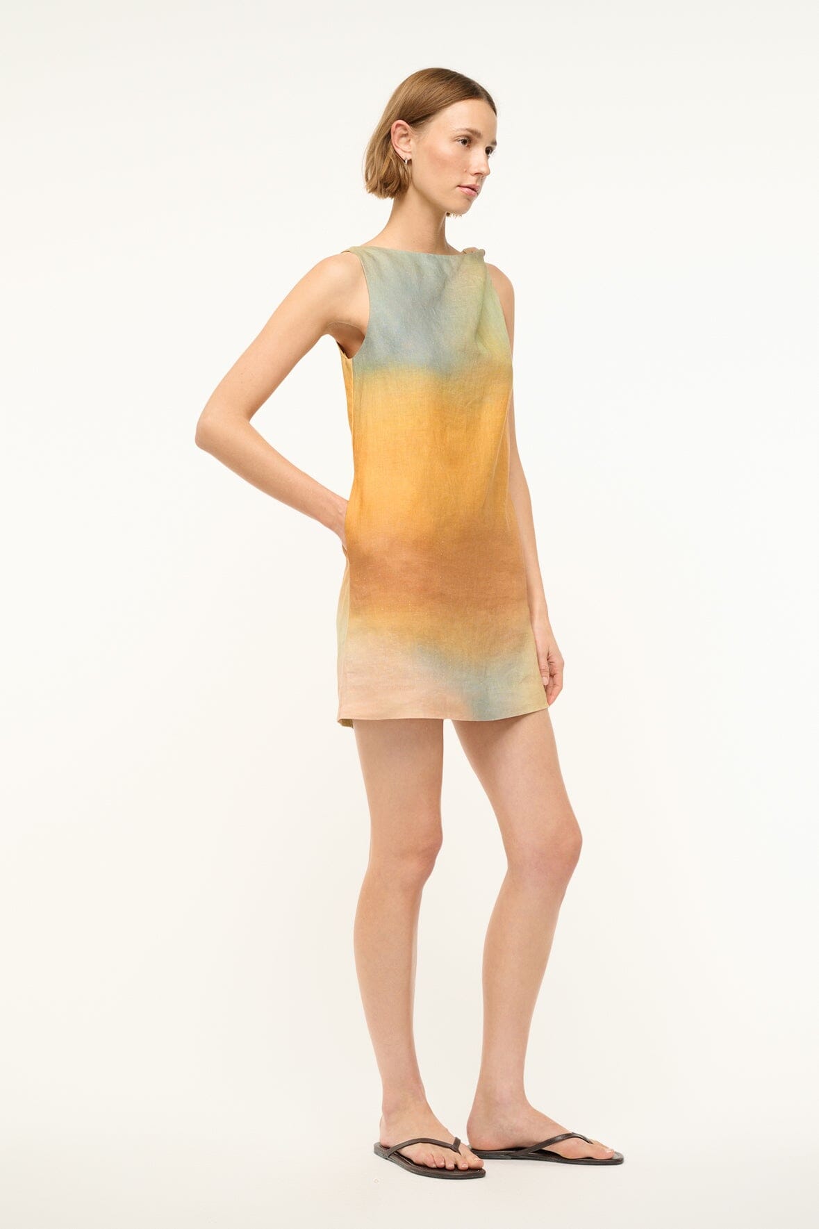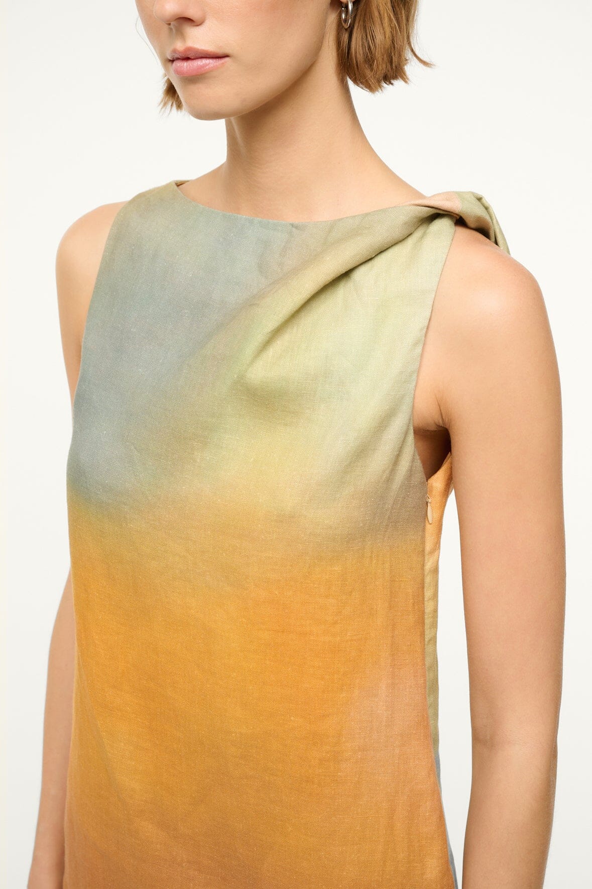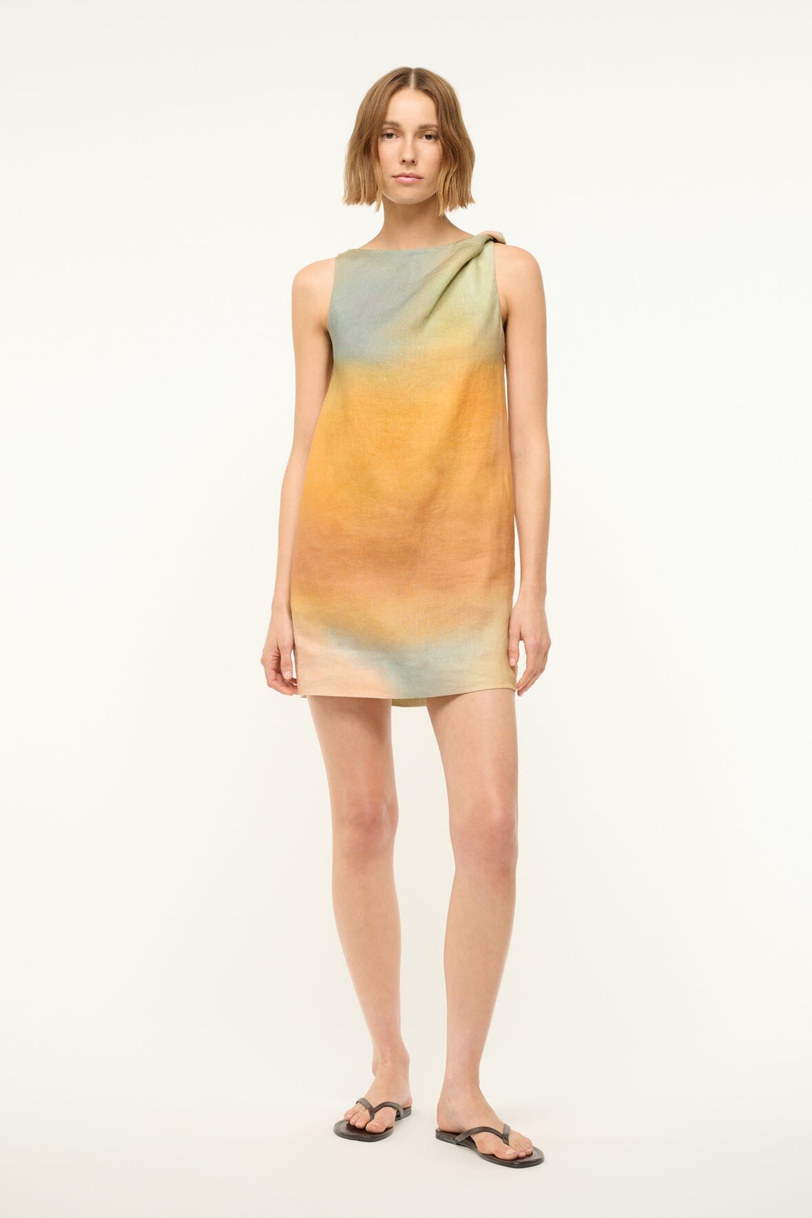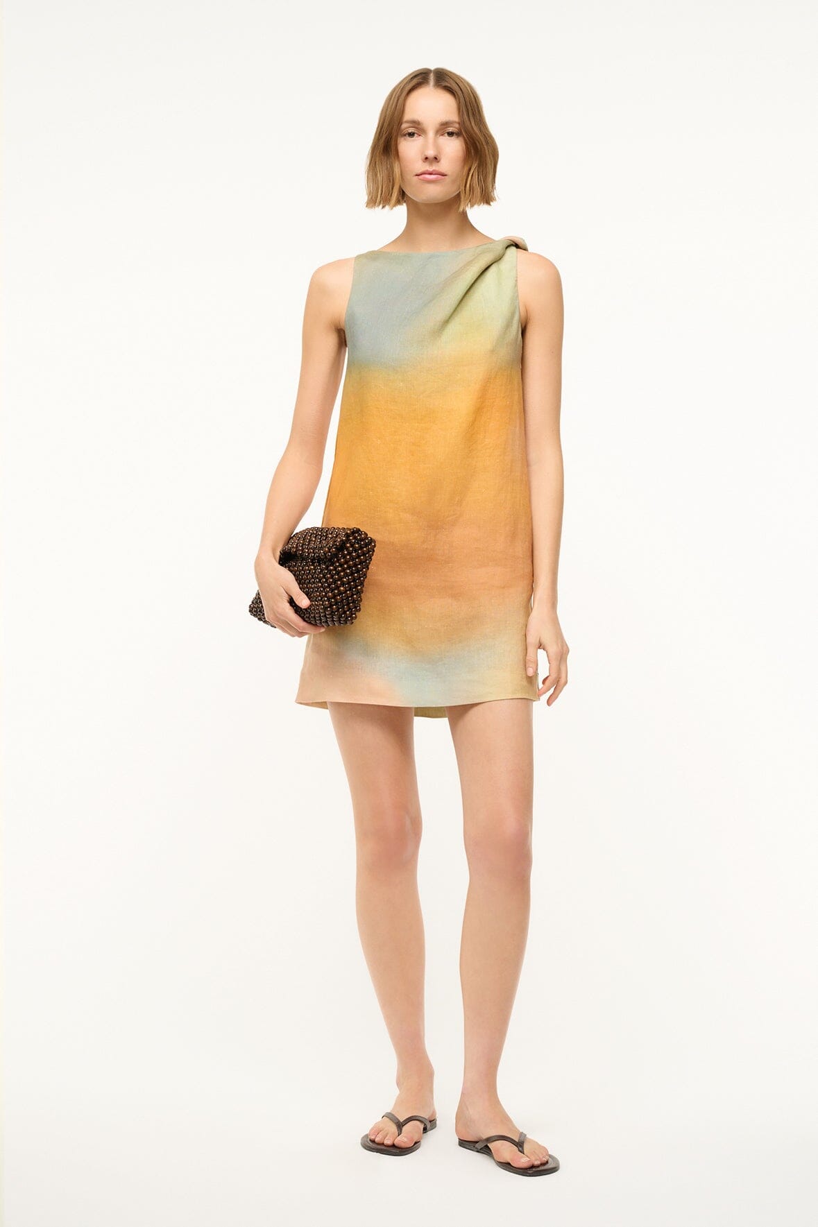 This is a mini length linen dress with a boat neck and a twist detail at the shoulder.