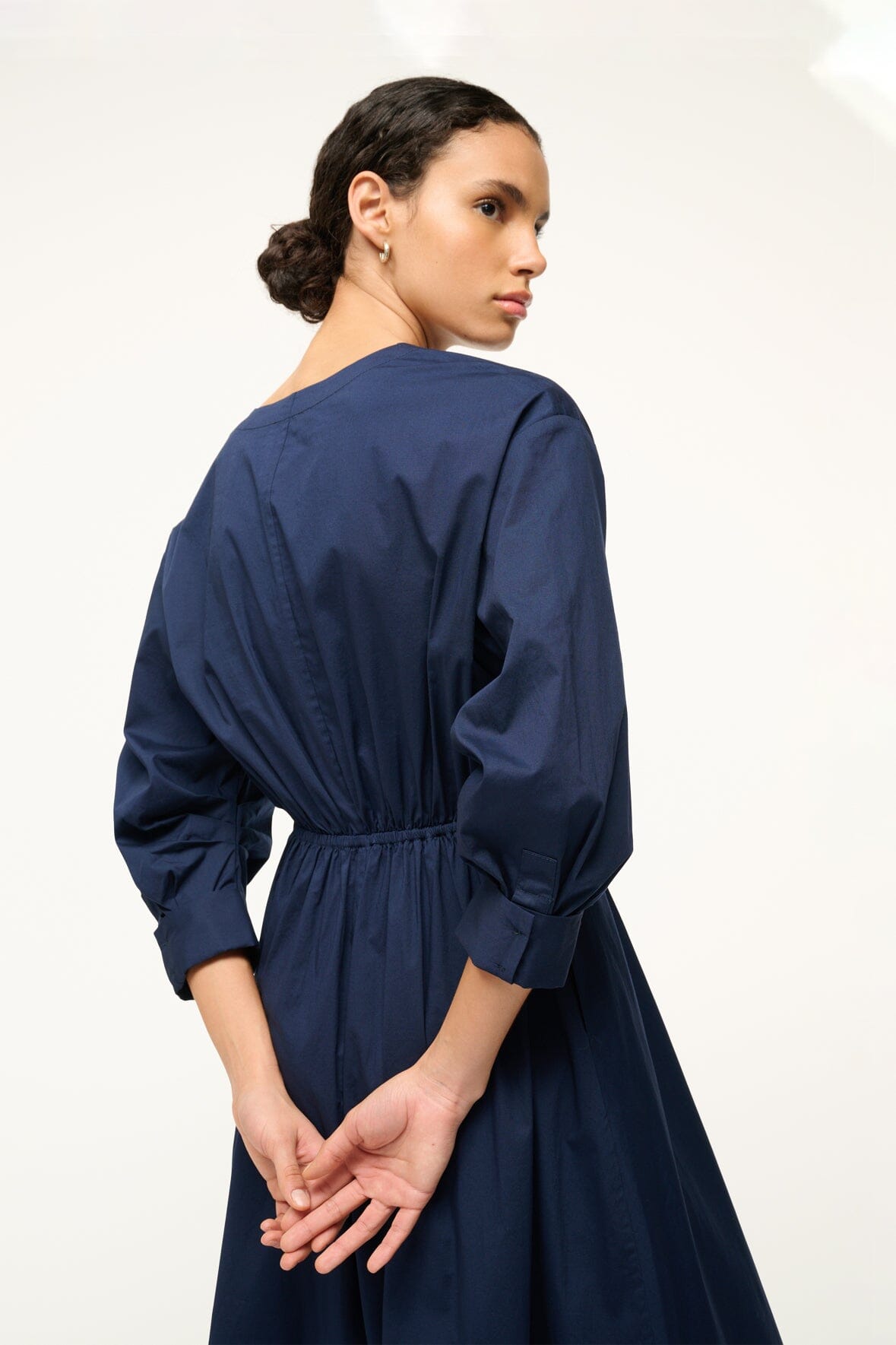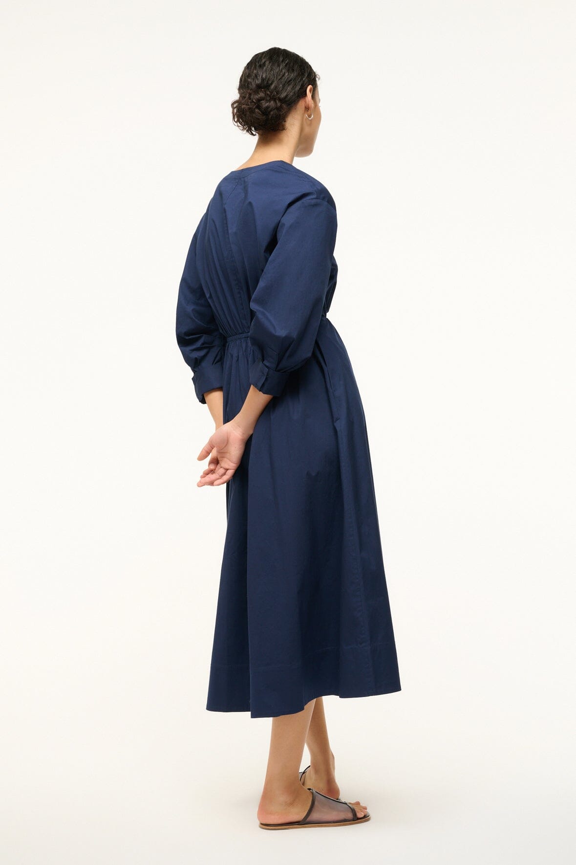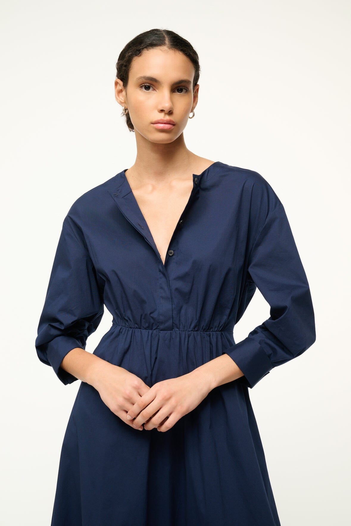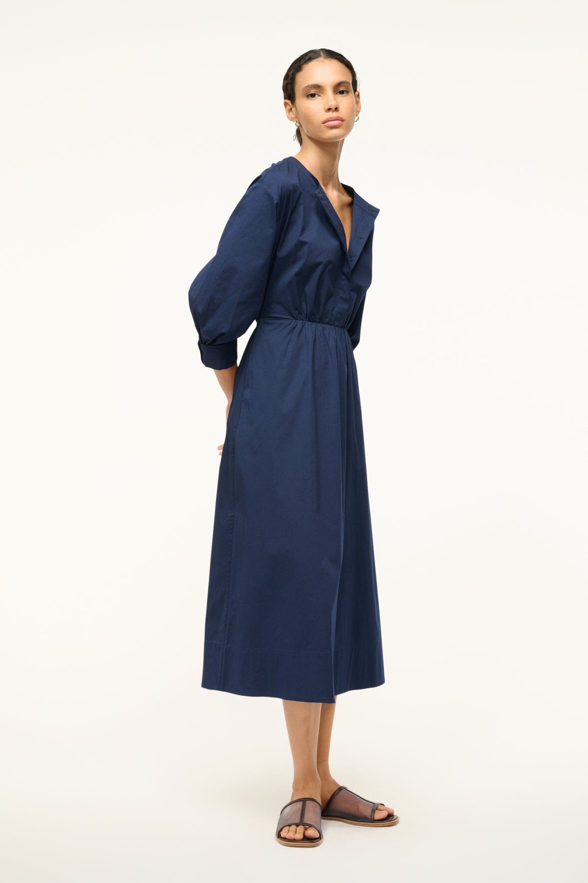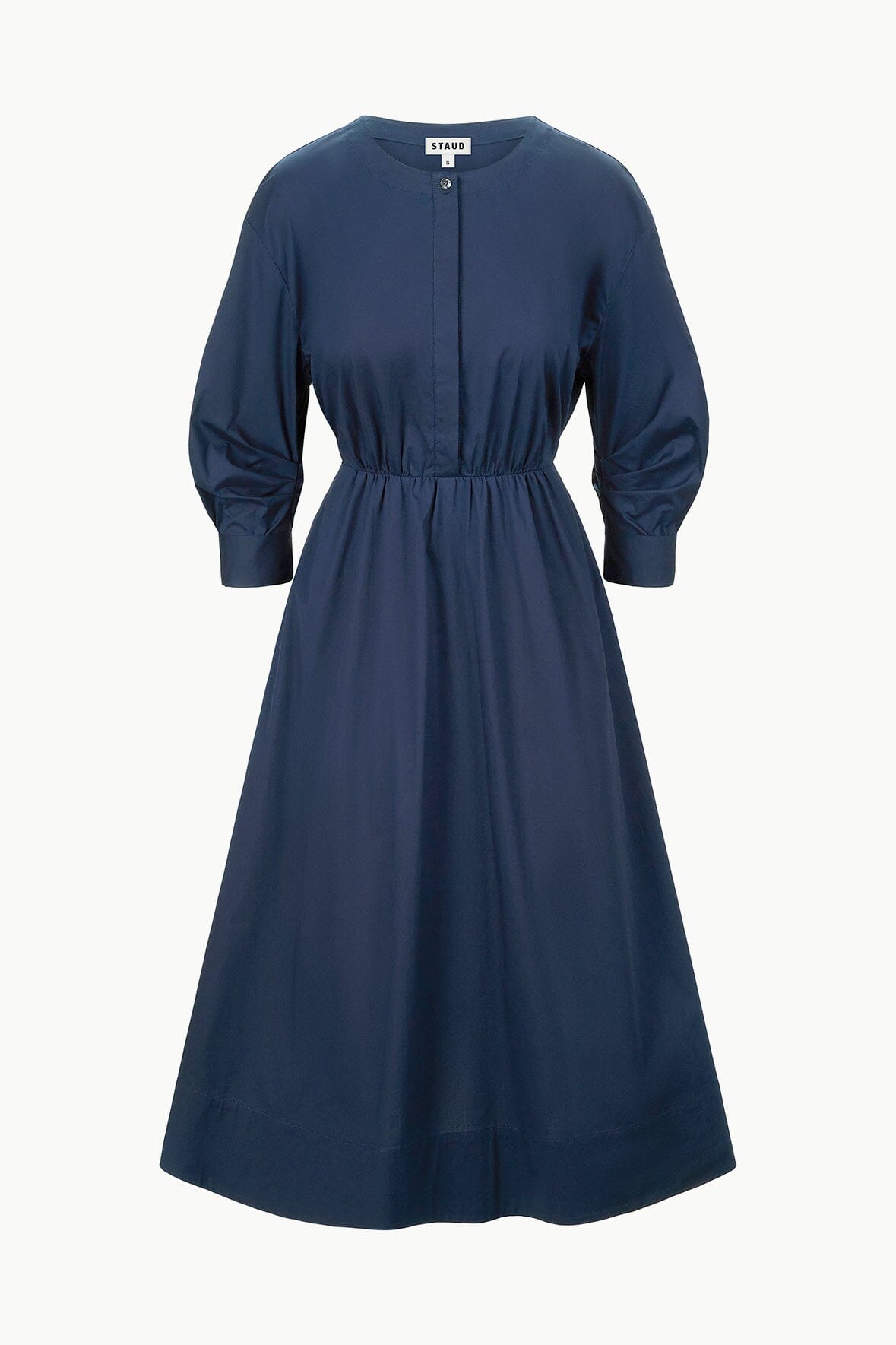 The Cafu is a midi length dress with a crew neckline, center front buttons and a fitted waist. It features pre-rolled sleeves and an a-line skirt.