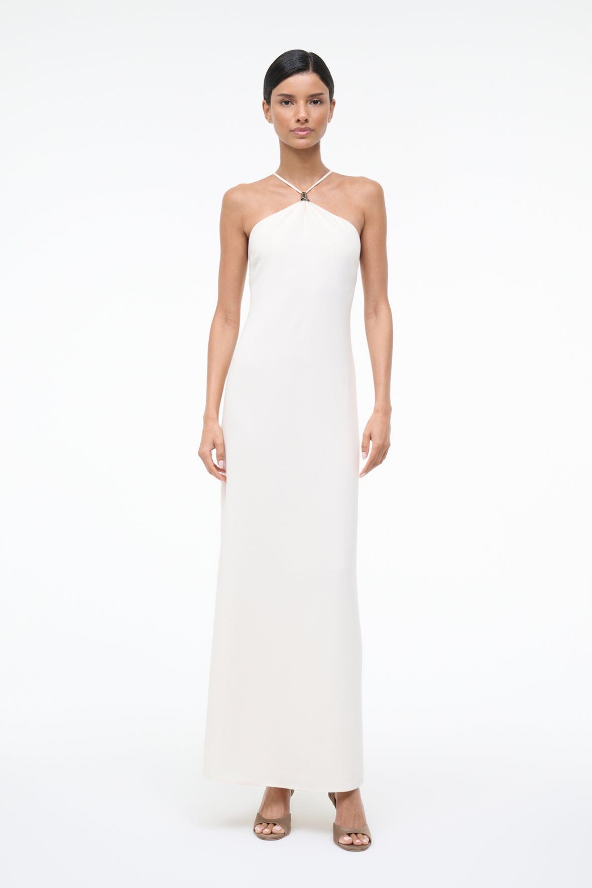 The Calla Dress in ivory features an elegant halter neckline with polished metal hardware detailing. A subtle back slit adds movement and sophistication, making it perfect for evening events and special occasions. Timeless and refined.