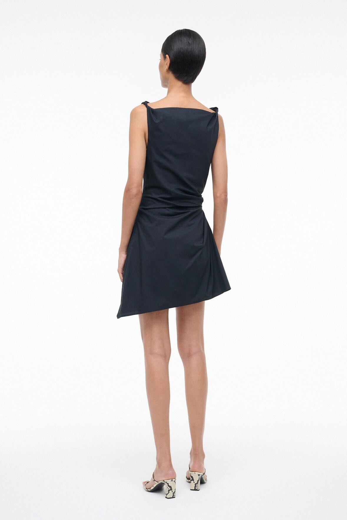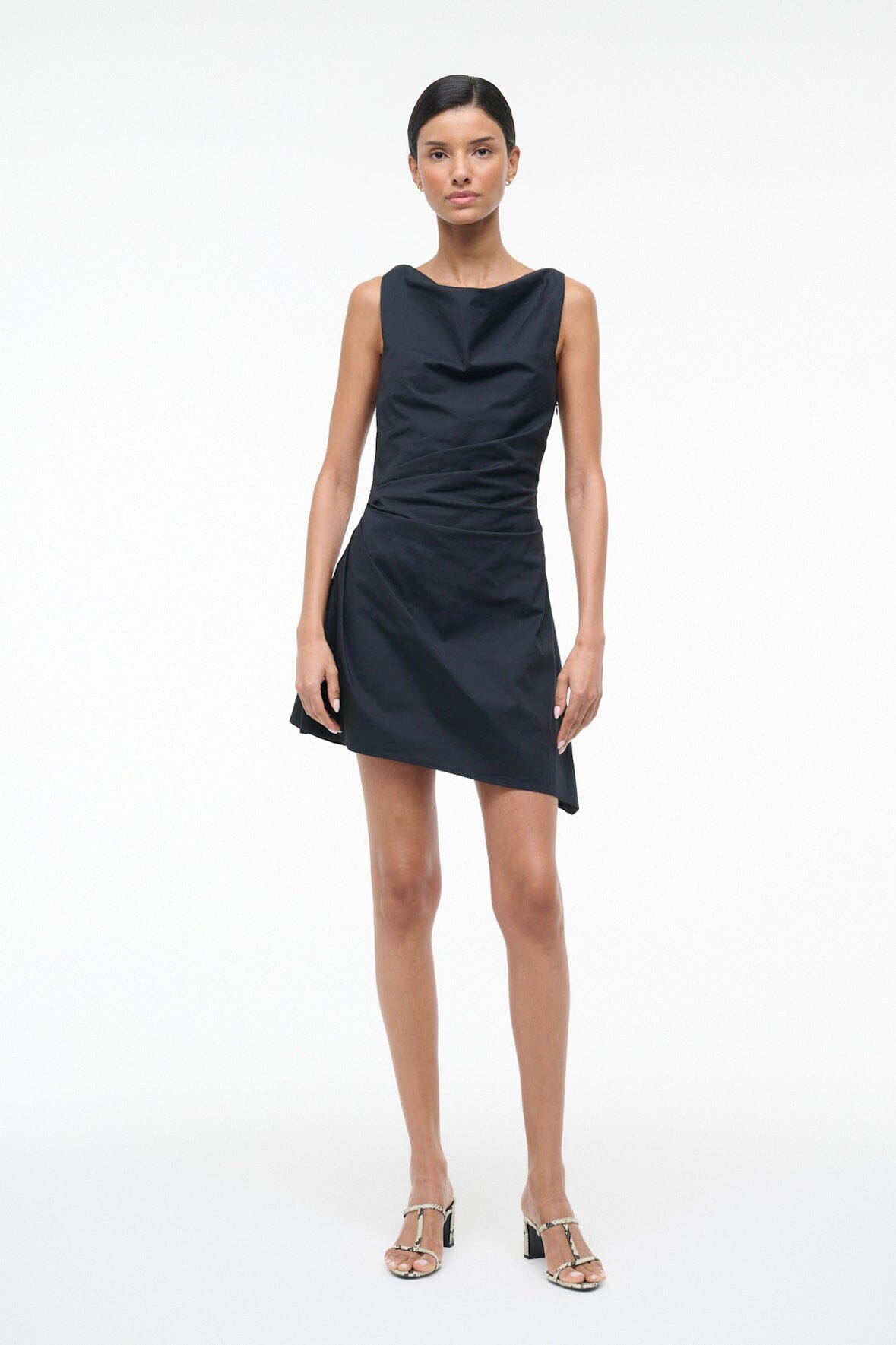 The Callie Mini Dress features a high neckline with ruched waist detailing and twisted sleeves for a modern silhouette. A back zip closure ensures easy wear, while the asymmetrical hem adds an unexpected edge. Perfect for elevated everyday styling.