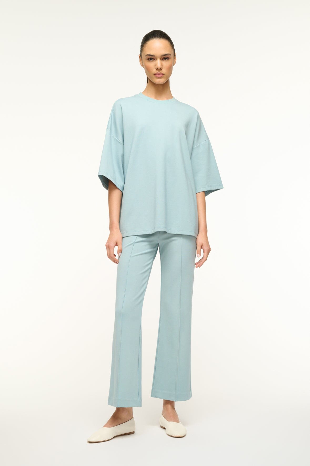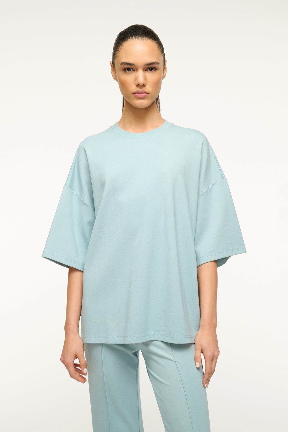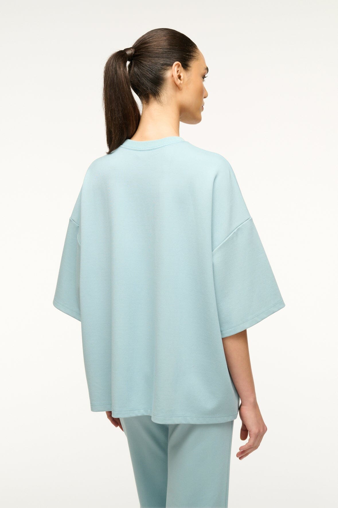 An oversized crewneck shirt in our ponte fabric with a rib neck trim. The Capsule Top is a perfect travel day essential.