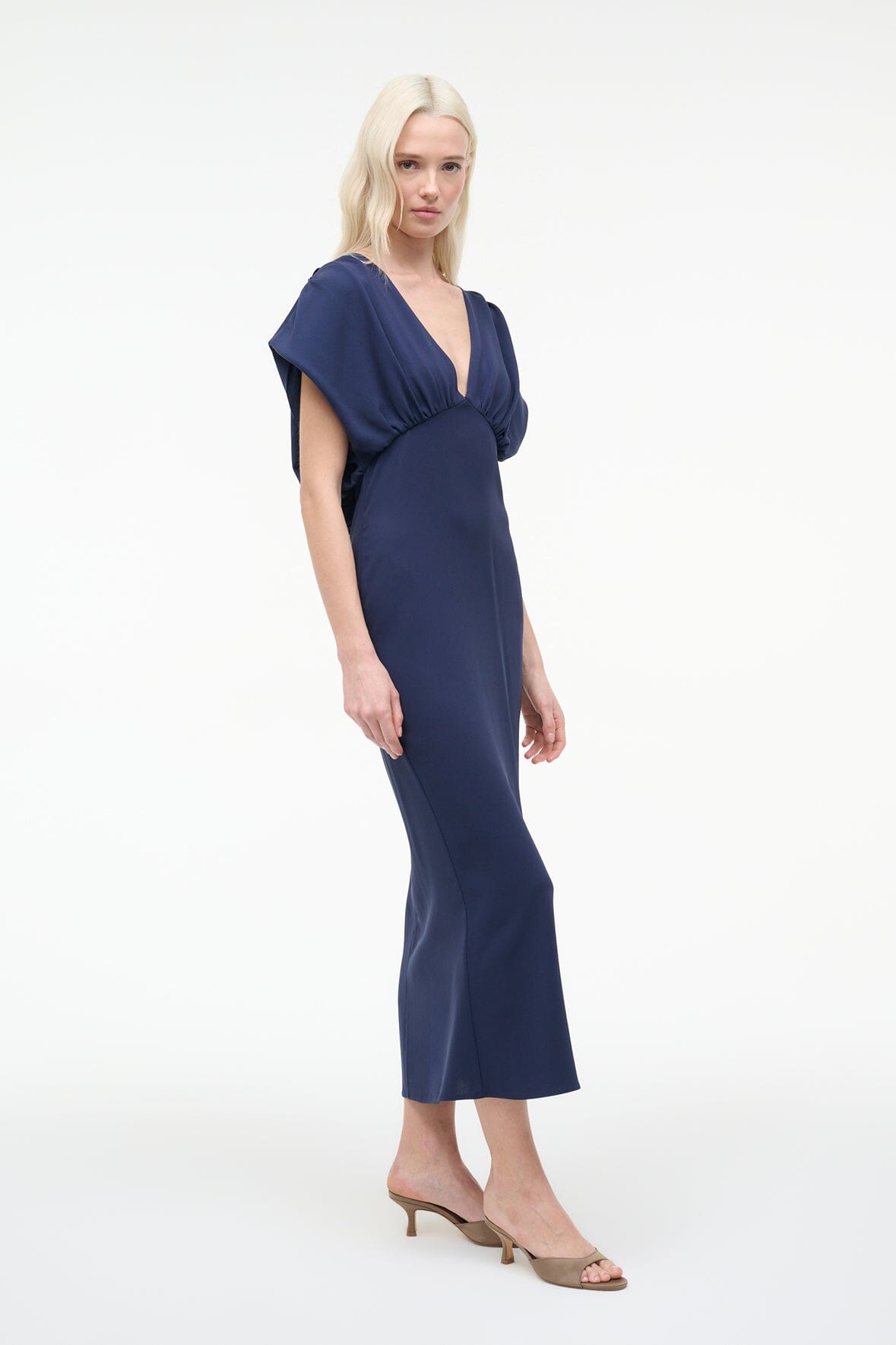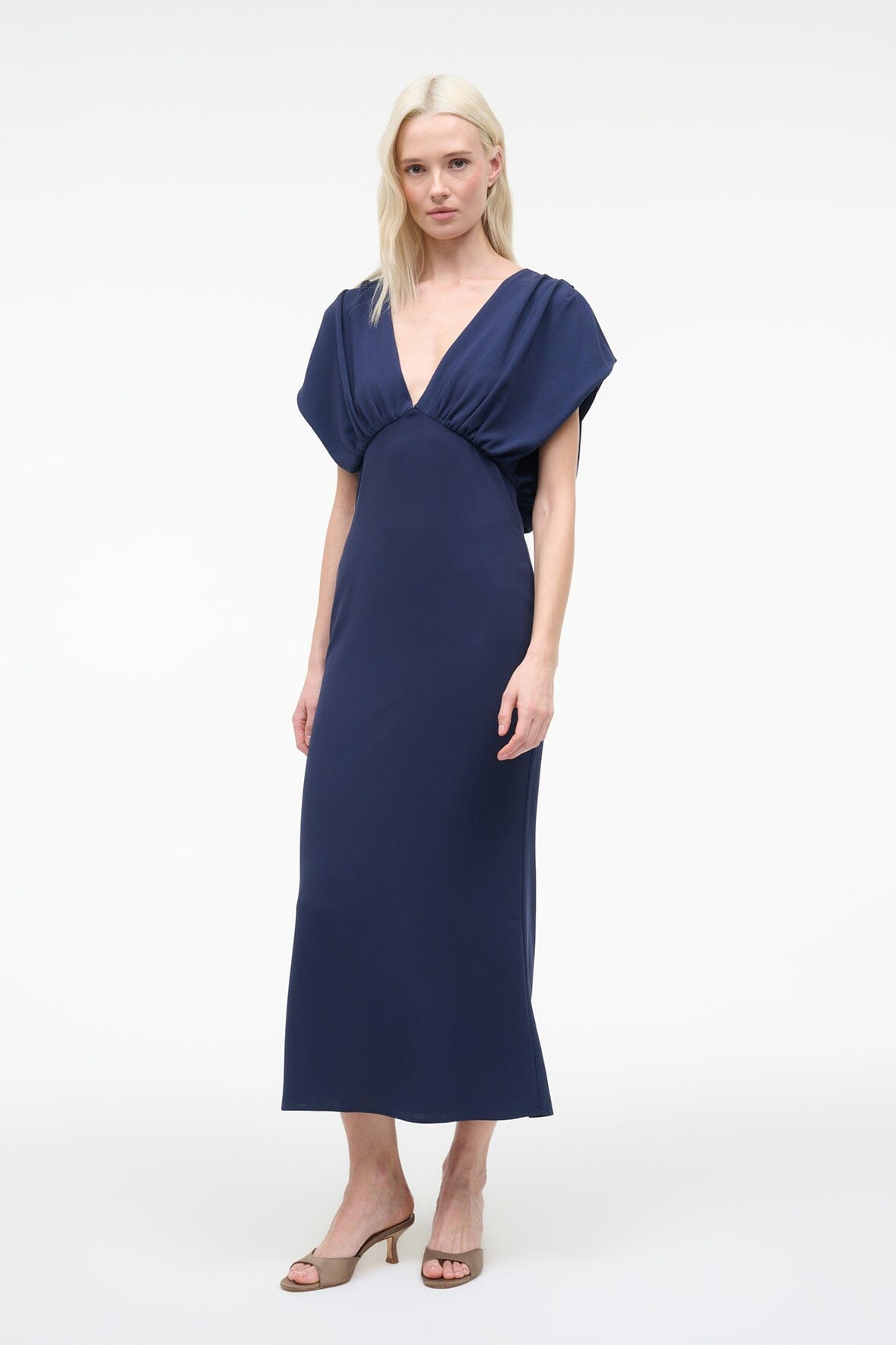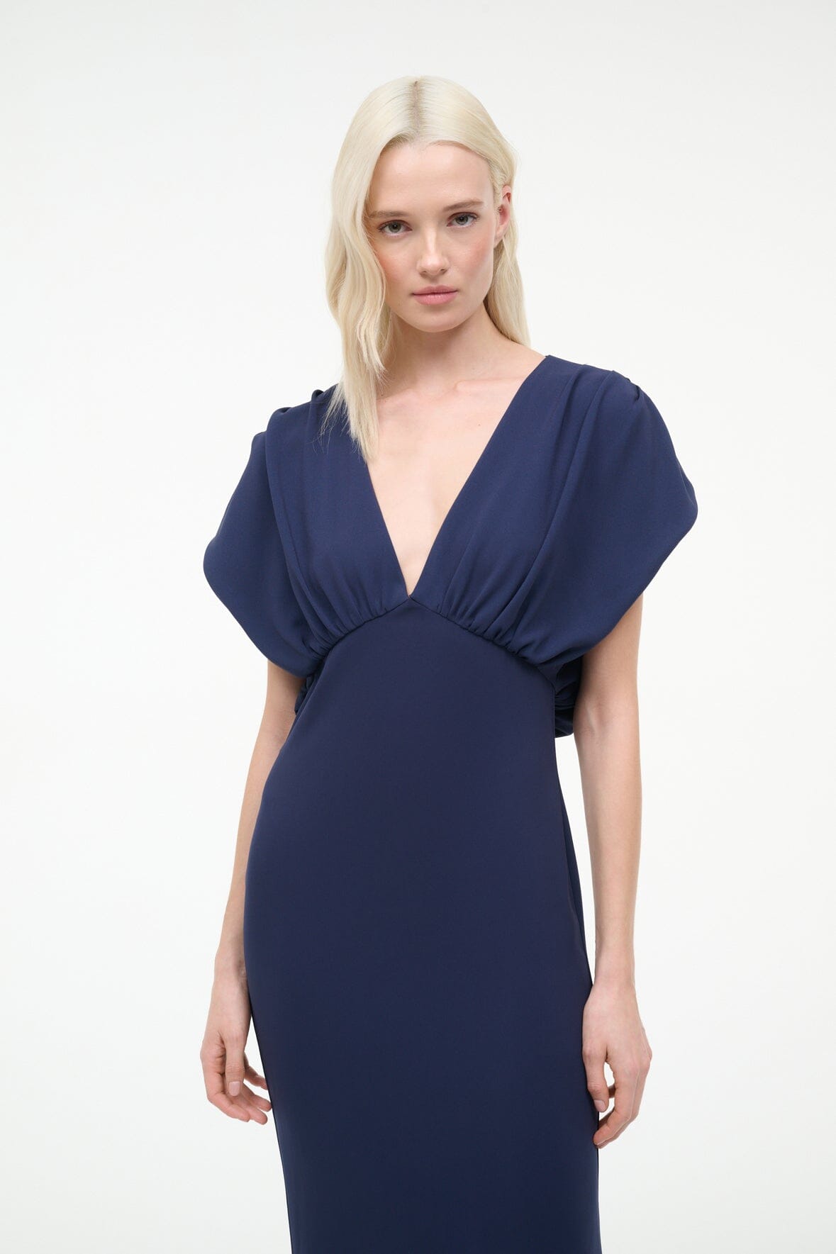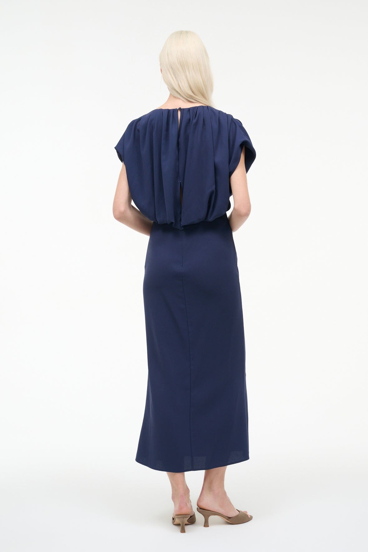 The Char Dress in navy features a flattering V-neckline and voluminous short sleeves that frame the shoulders beautifully. This midi silhouette showcases a back blouson detail with a single-button closure and delicate keyhole cutout. Crafted from luxurious triacetate crepe, it drapes elegantly for a refined, effortless look.