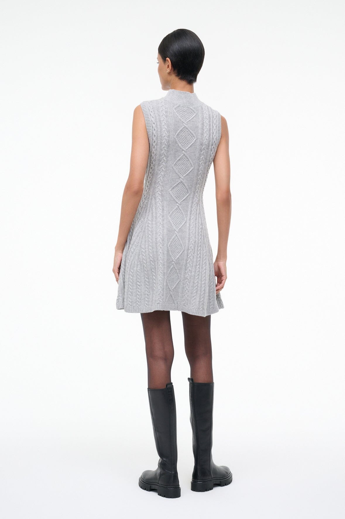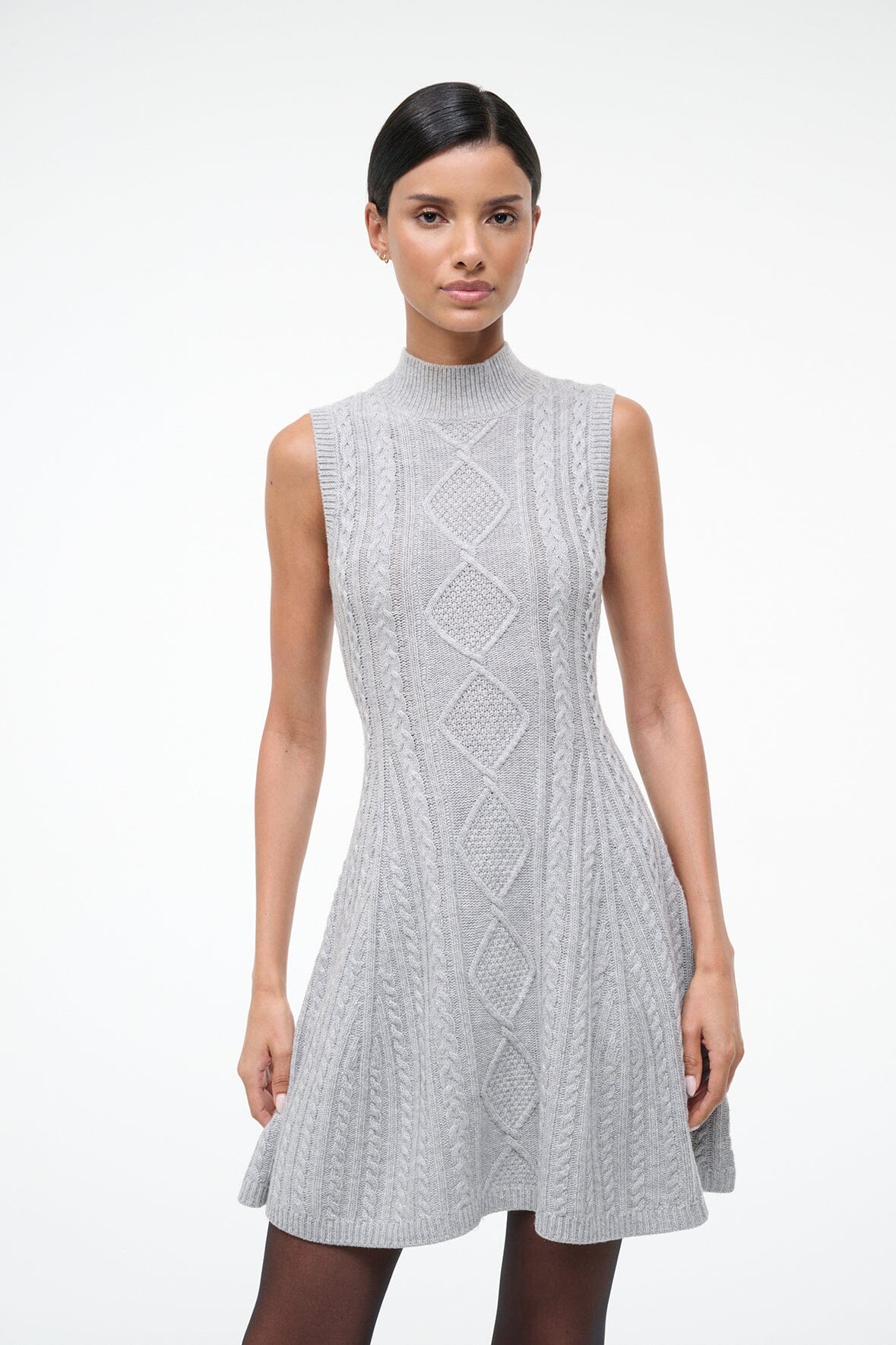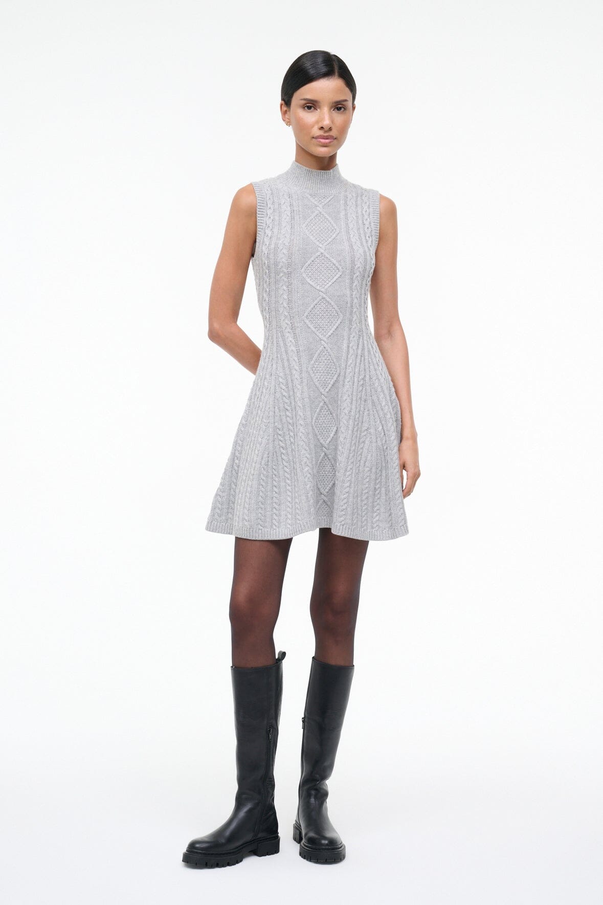 The Charade Dress is a mini length cable knit dress with a mock neck and full skirt.