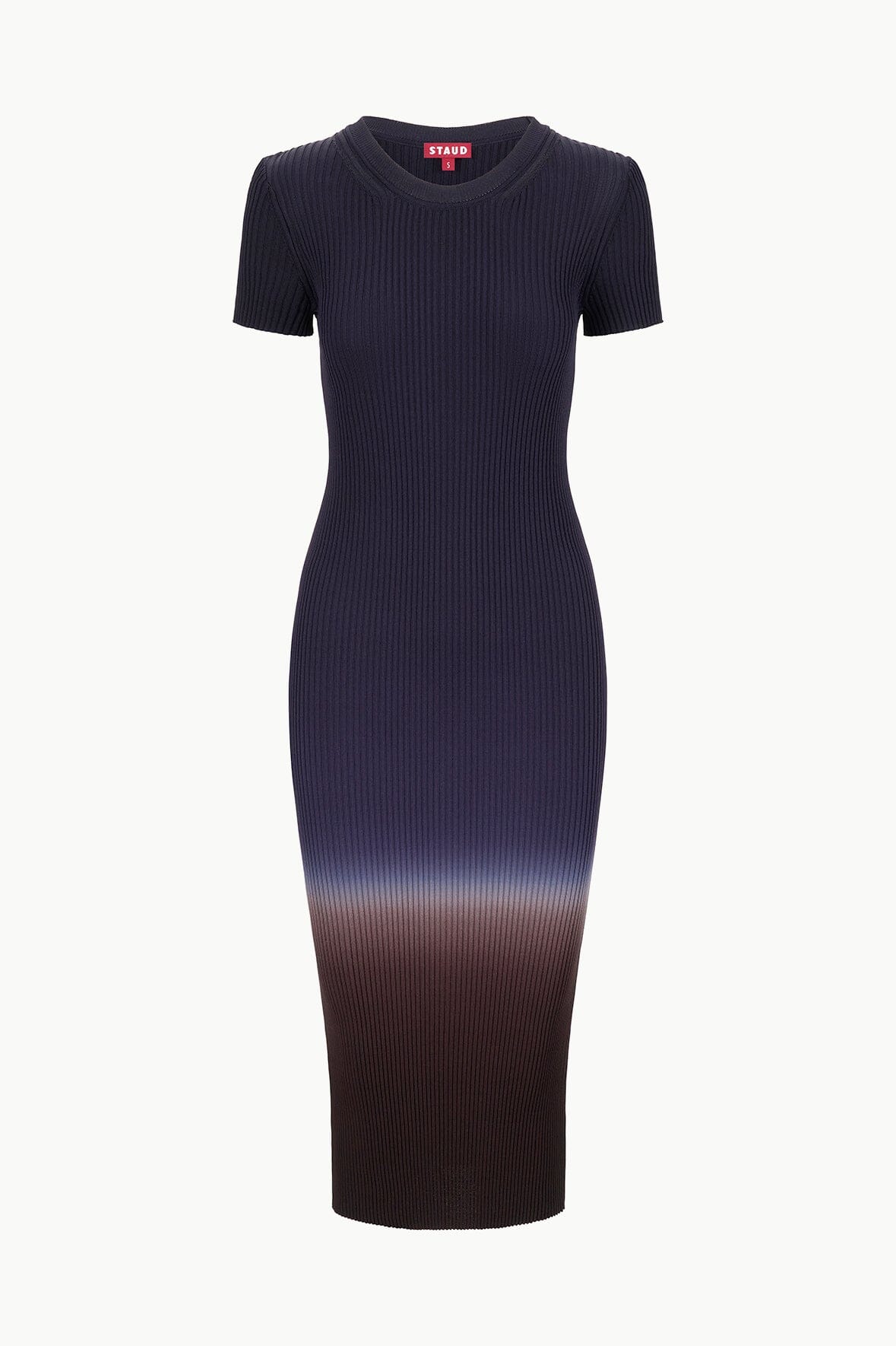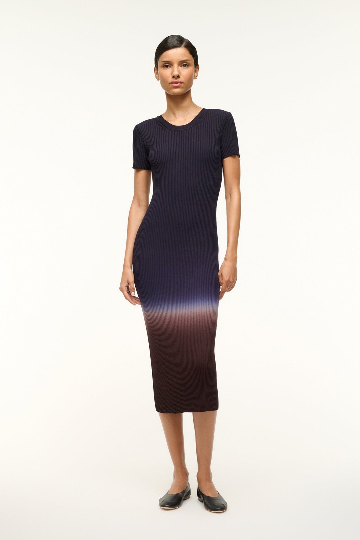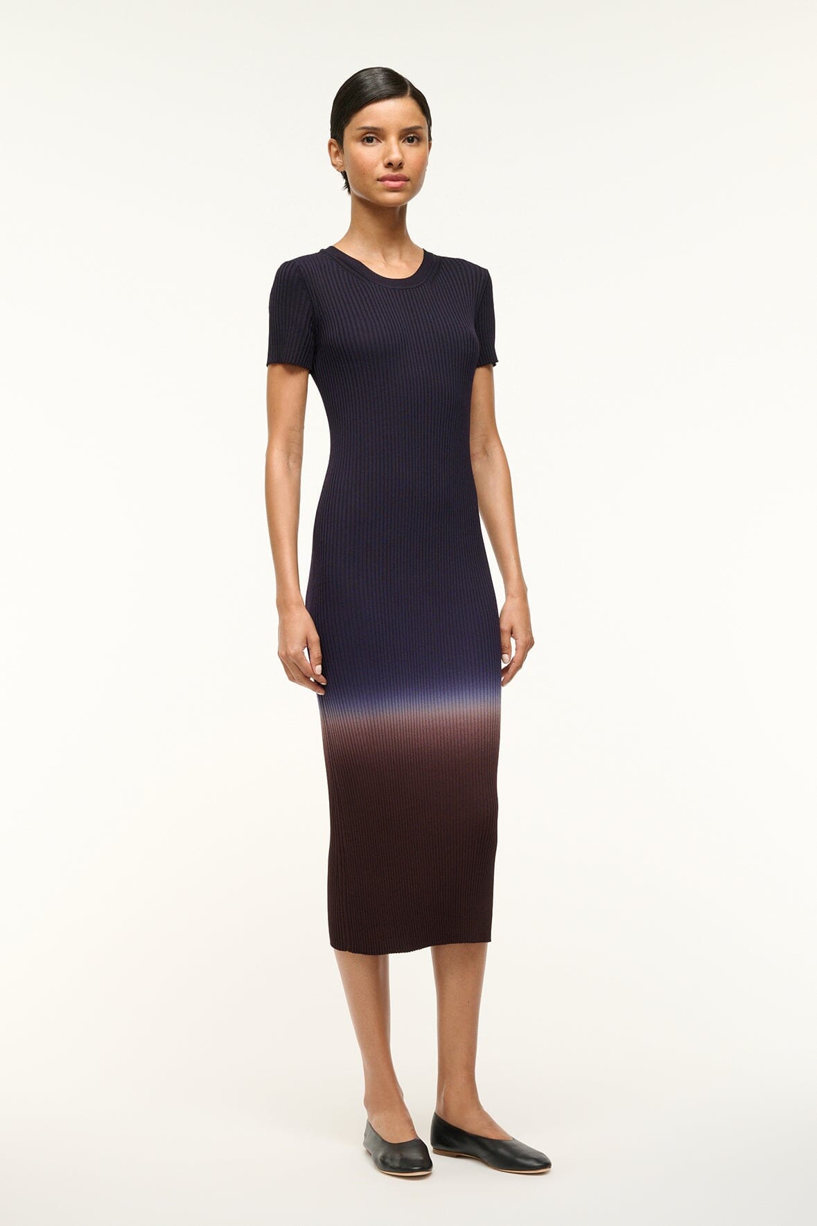The Colleen dress is a fitted short sleeve dress constructed out of our signature rib knit fabric in a dip dye ombre design.