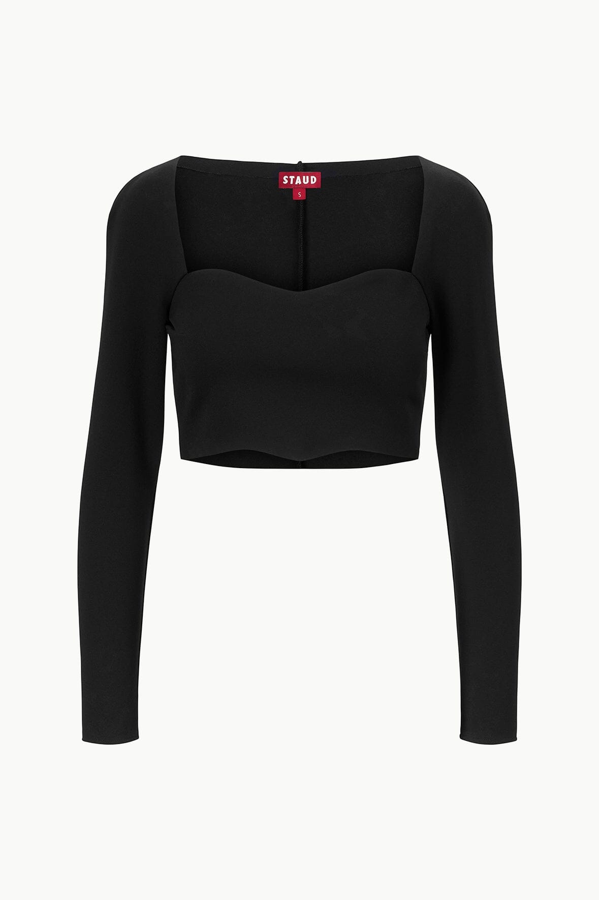 A long-sleeved crop top made from a stretchy ponte fabric. This style features a wave details at the neck and hem, and invisible zipper closure down the back.