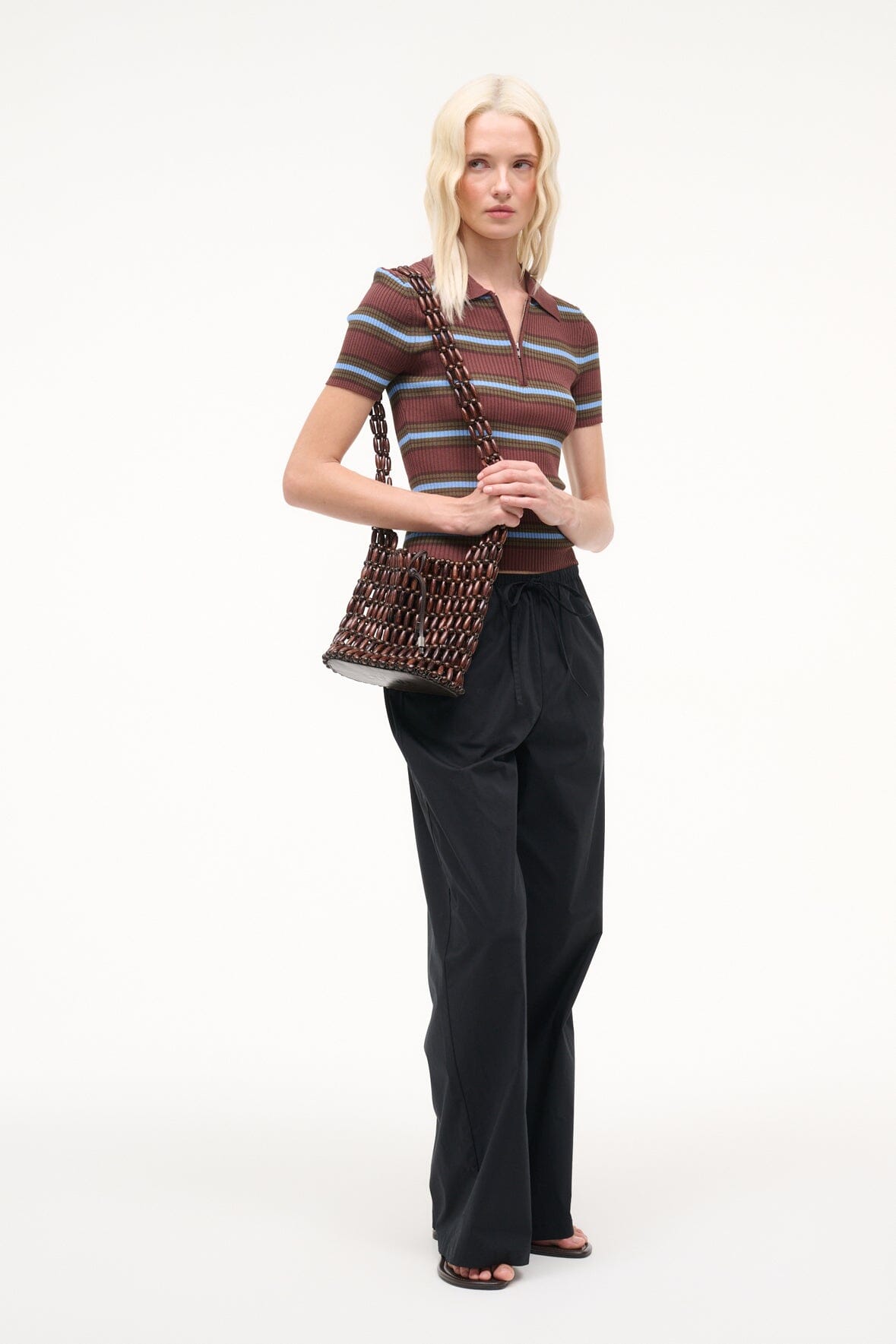 Handcrafted medium tote entirely composed of natural wood beads with a leather closure detail. The unlined construction reveals the meticulous beadwork from every angle. A textured, one-of-a-kind piece that brings organic sophistication to your everyday style.