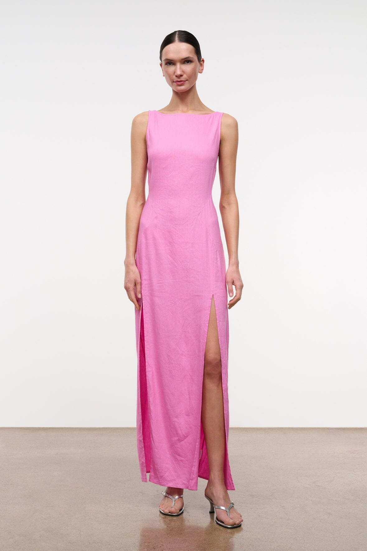 The Costa Linen Dress features double front leg slits, high neckline, and back zip closure. Perfect for transitioning from day to night dressing.