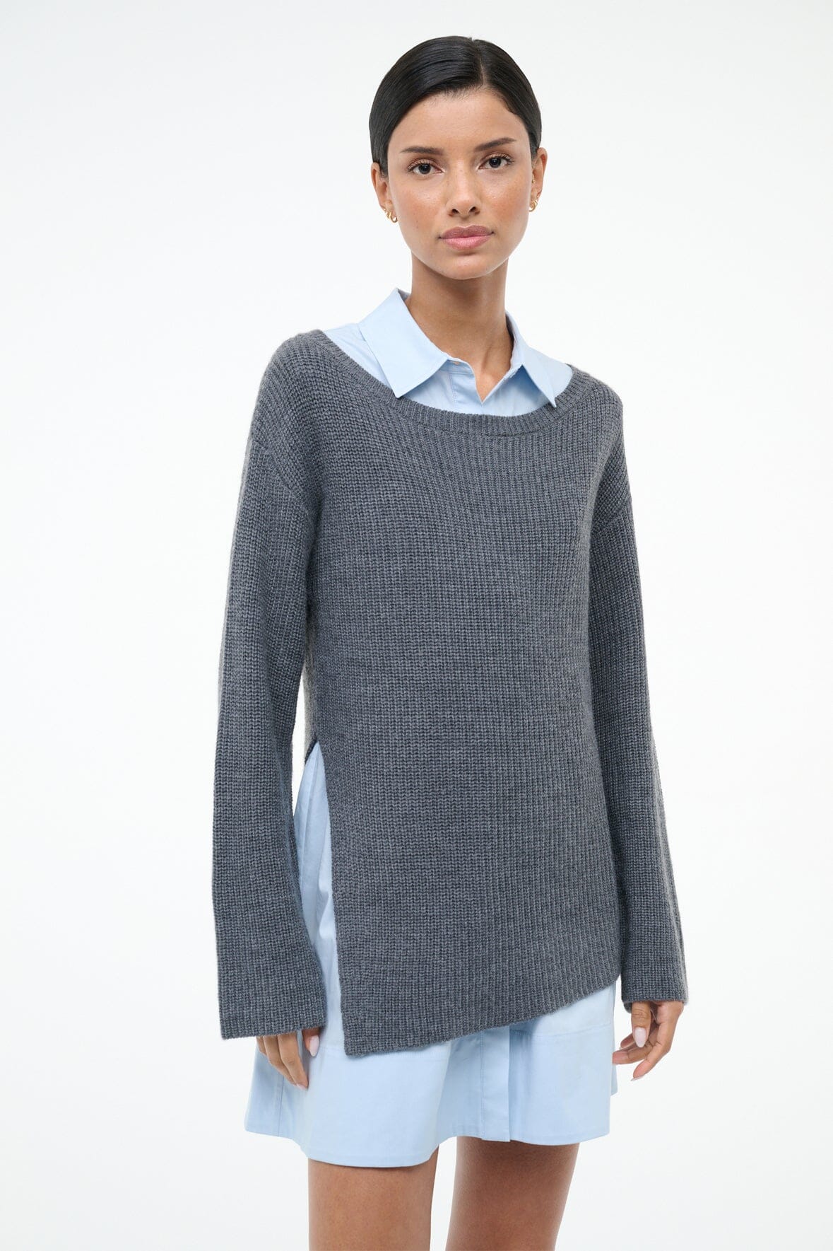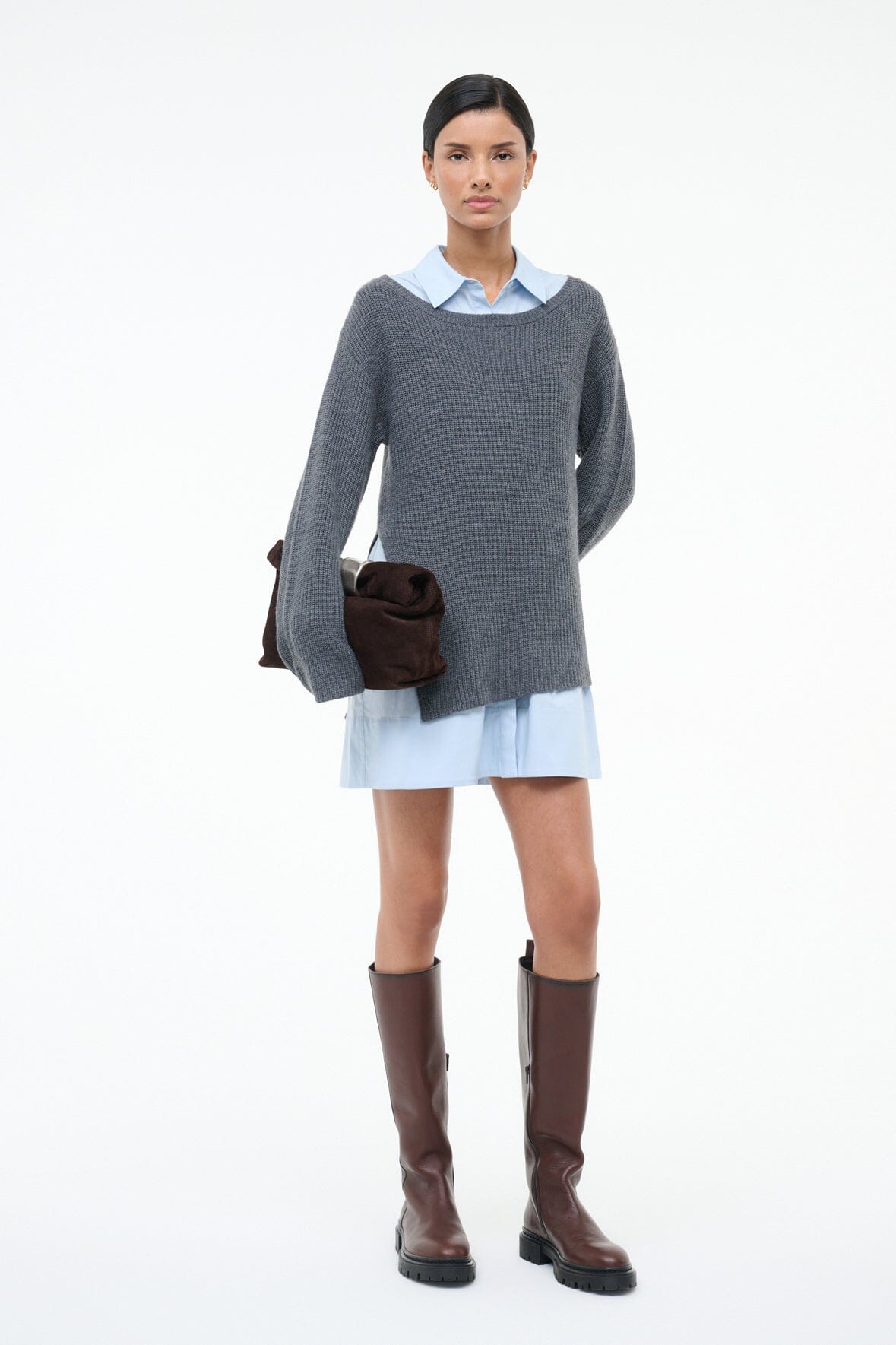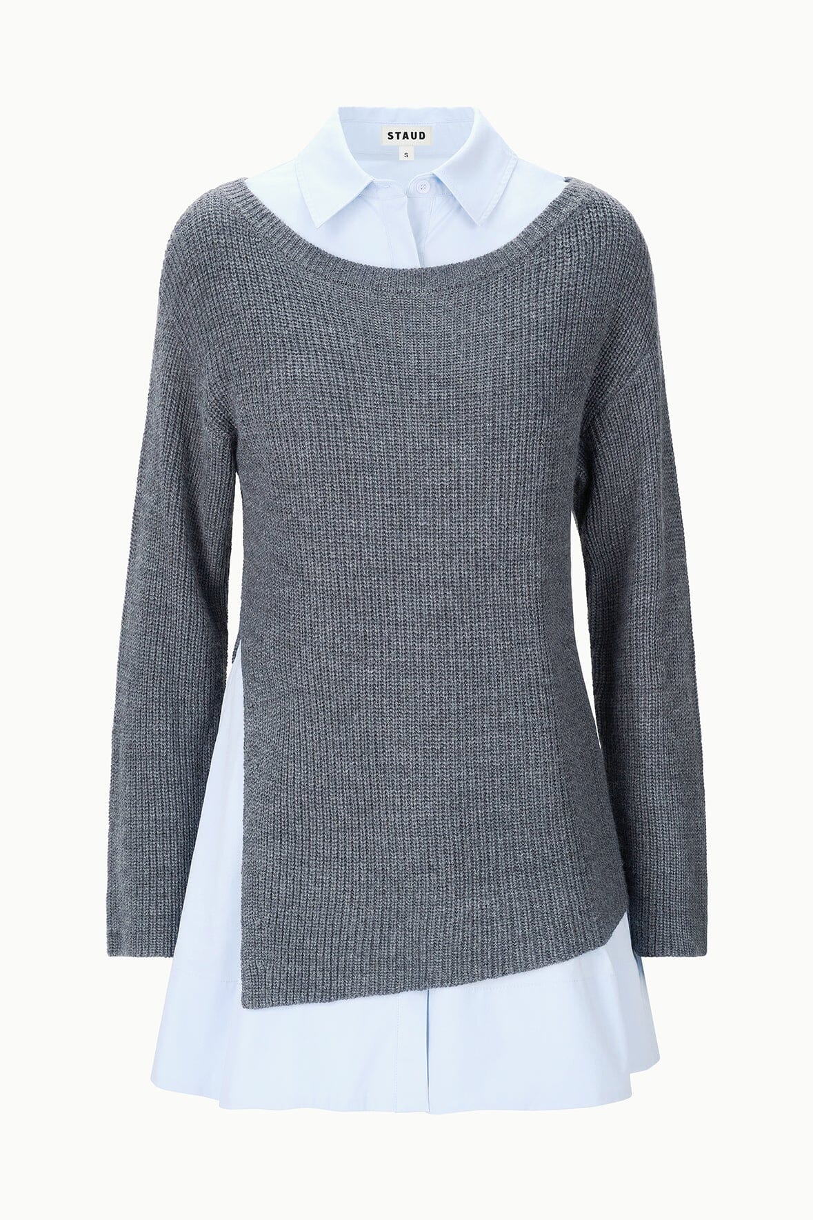 The Dane Dress is a mixed media mini dress with a merino wool knit body and crisp cotton poplin contrast allowing for visual interest and structure. A versatile mini dress that works solo or styled over basics for added dimension.
