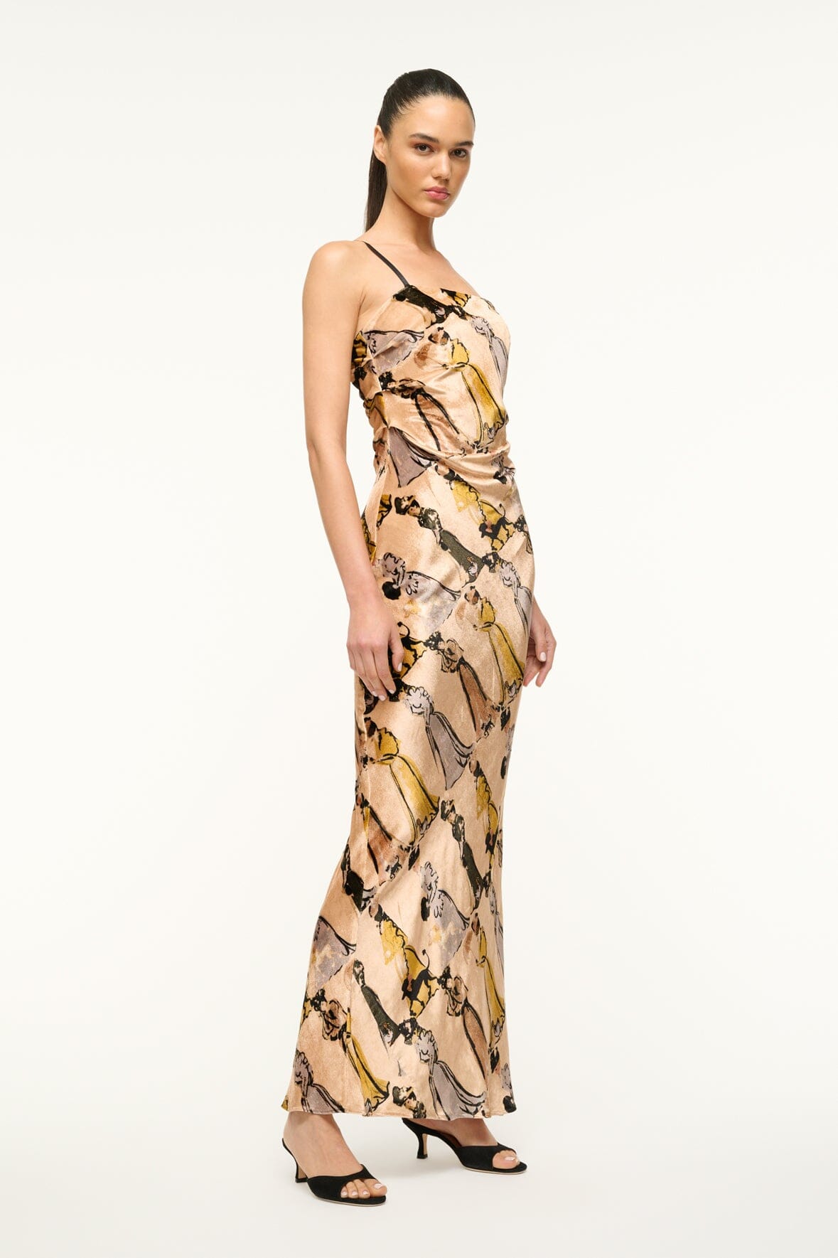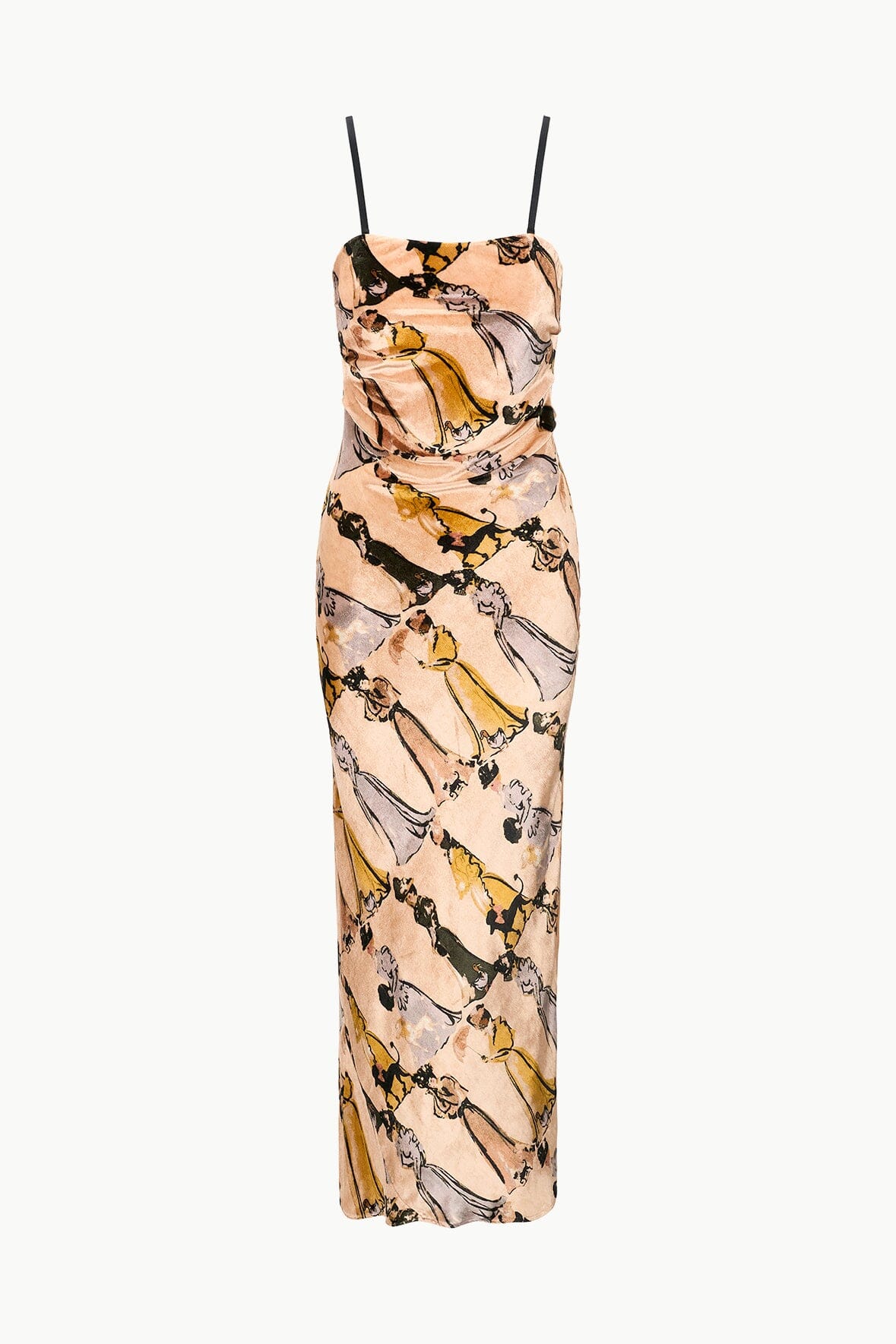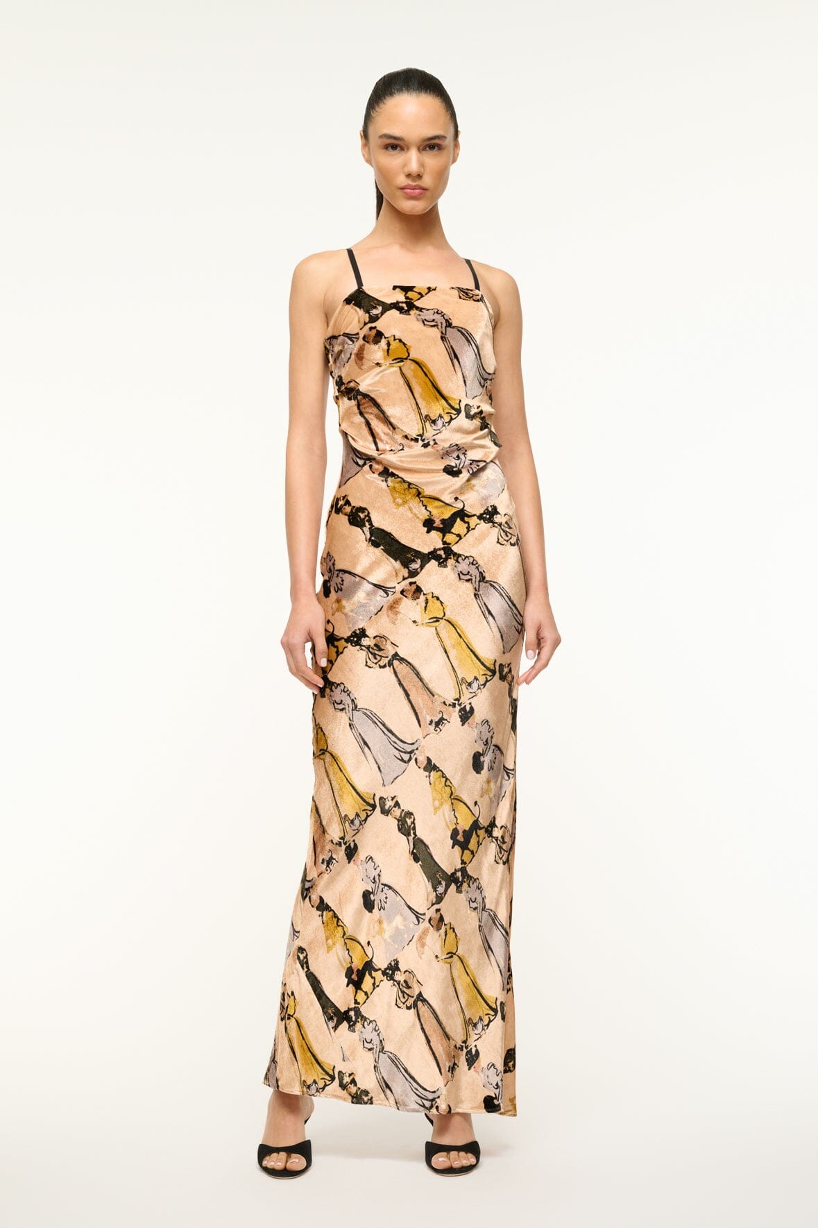 The Ella Dress is velvet maxi-length dress with a ruched bodice and center back slit. It features an interior corset and detachable straps.