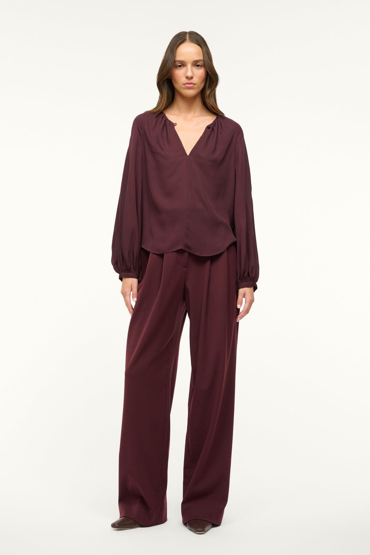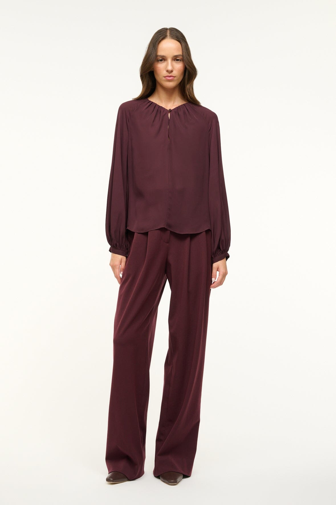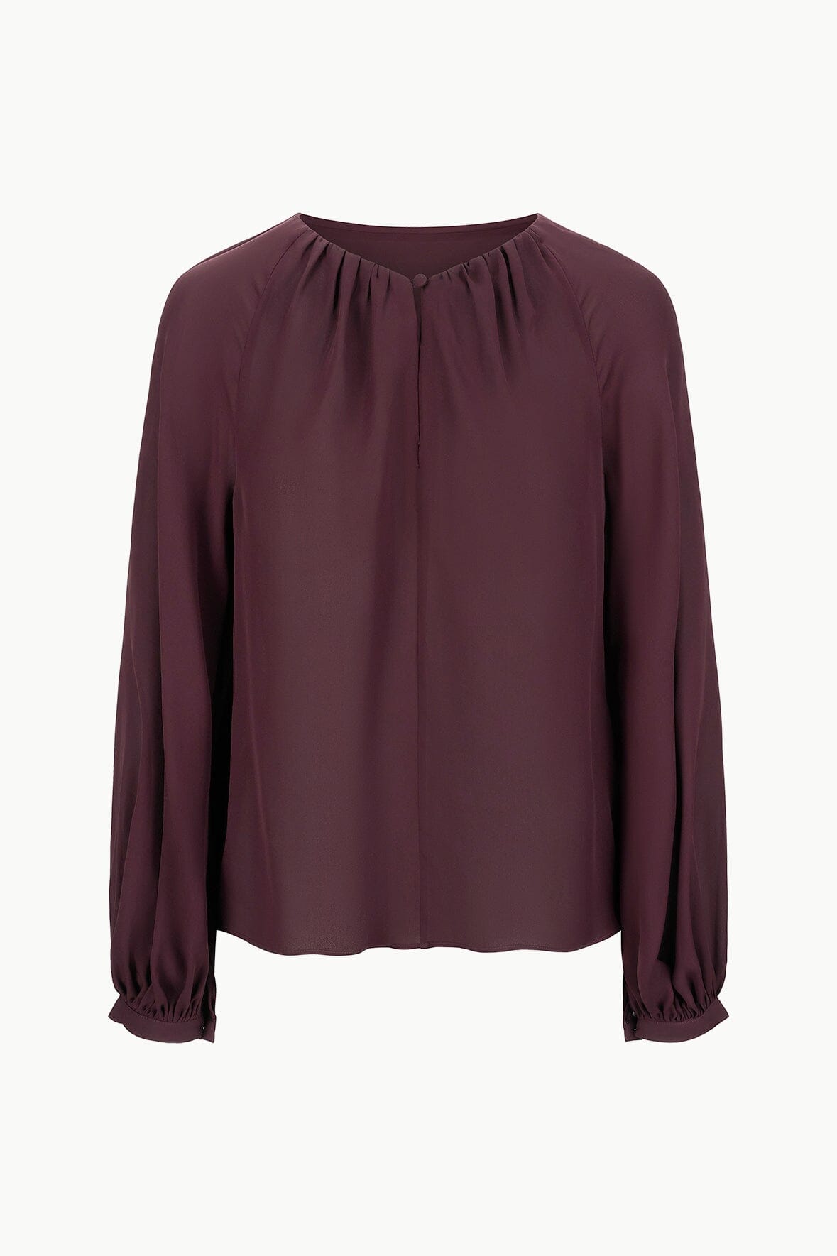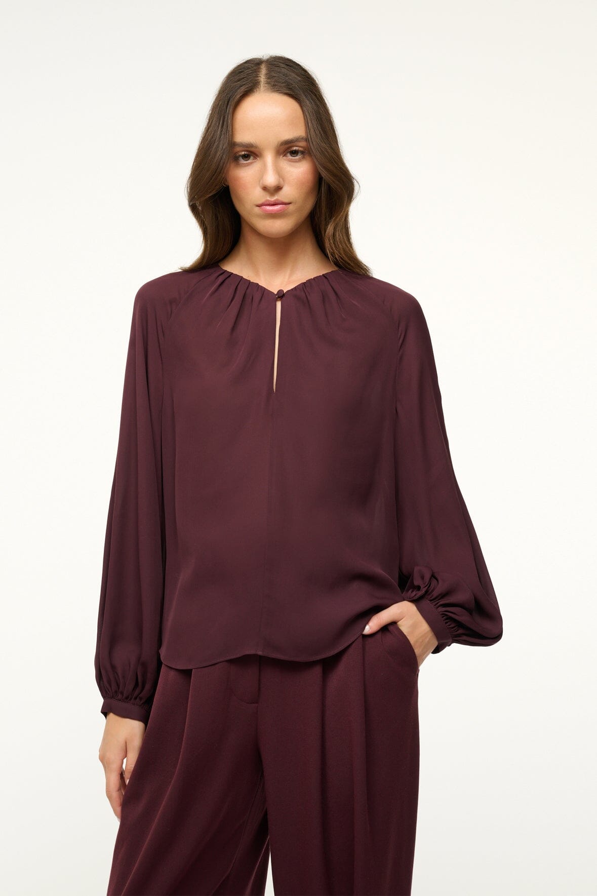 Inspired by the classic poet blouse, this style features billowy sleeves and a button keyhole detail at the neckline.