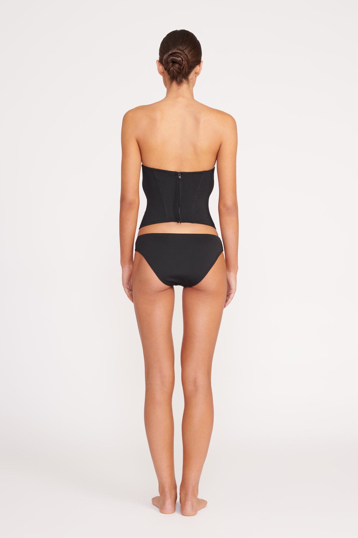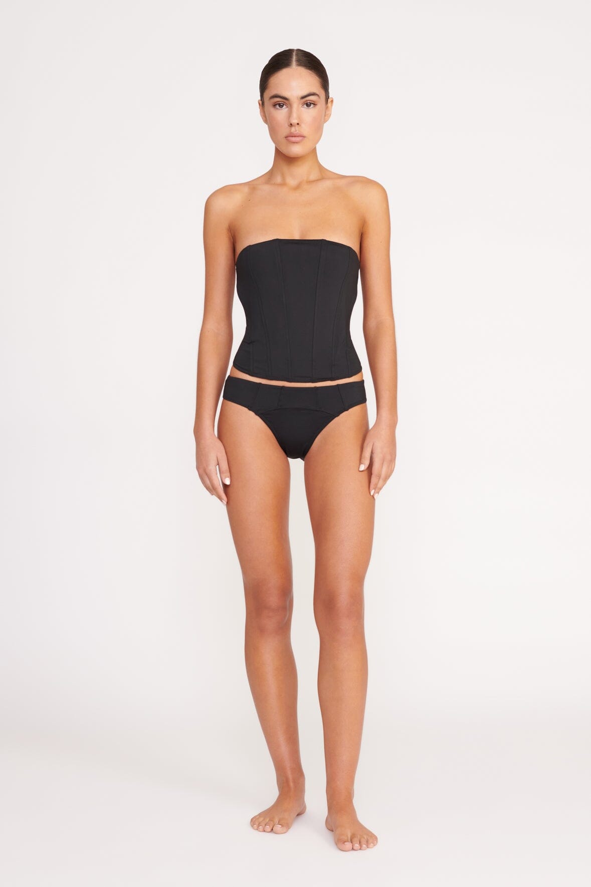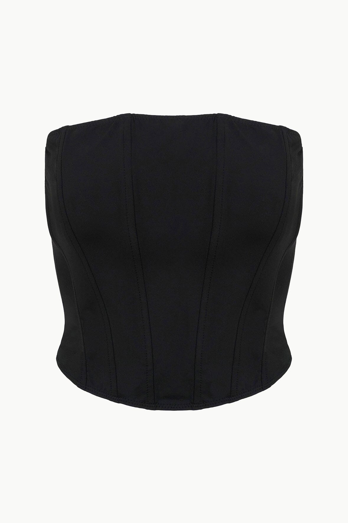 The Francesca Top is a corset-inspired swim top with boning throughout the bodice and a zipper at the back. This style is strapless and offers torso coverage as an alternate to a bikini top.