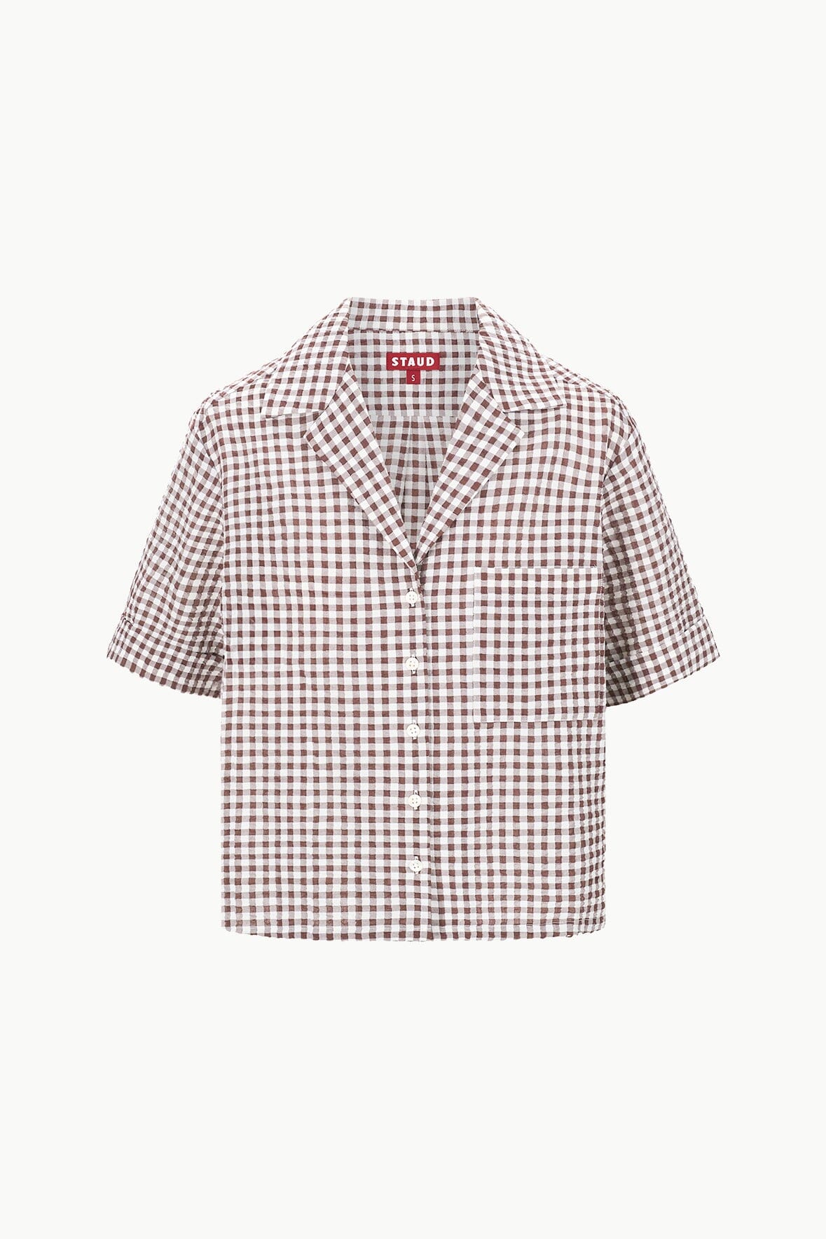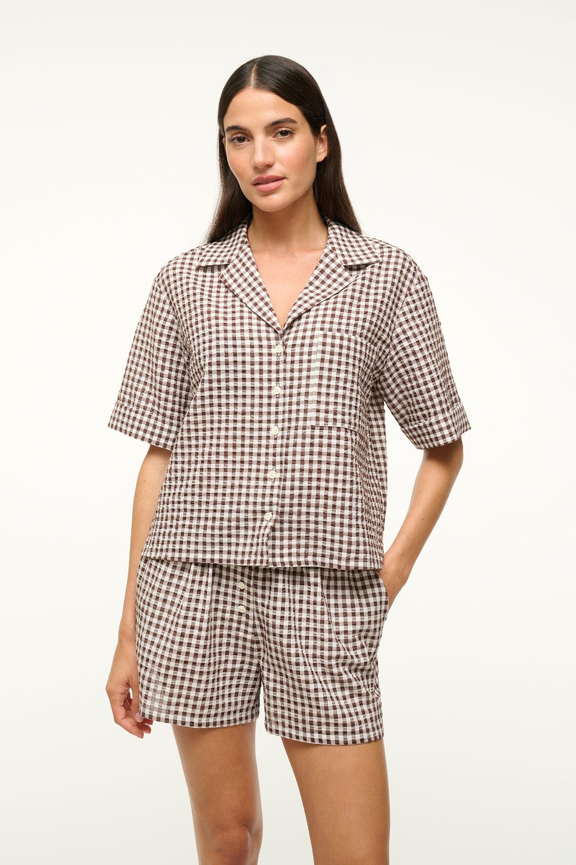 A seersucker coverup button down shirt that pairs with our Gabi Short. This style features a boxy fit, a front pocket, and button detailing at the front so it can be worn open or closed.