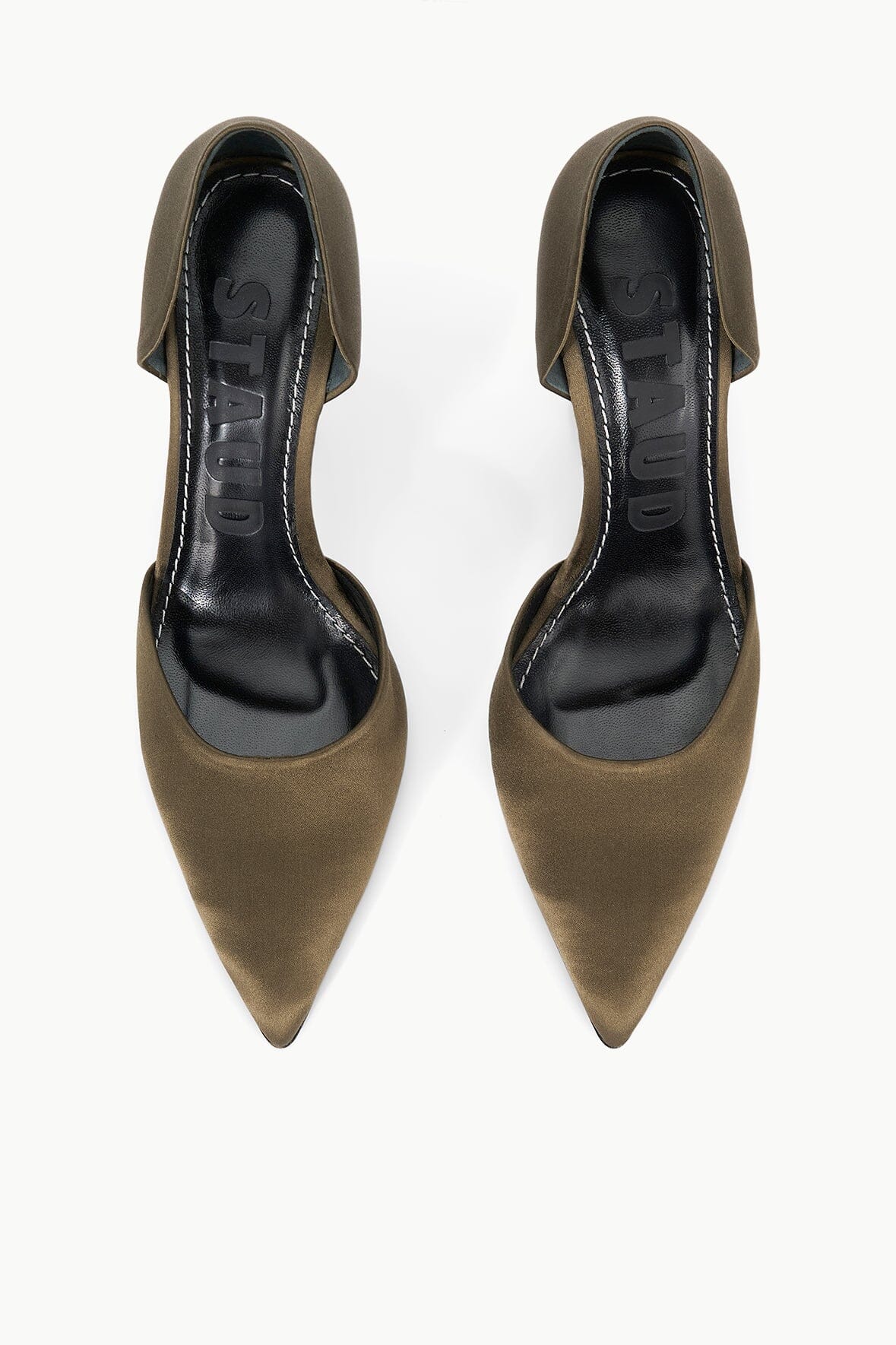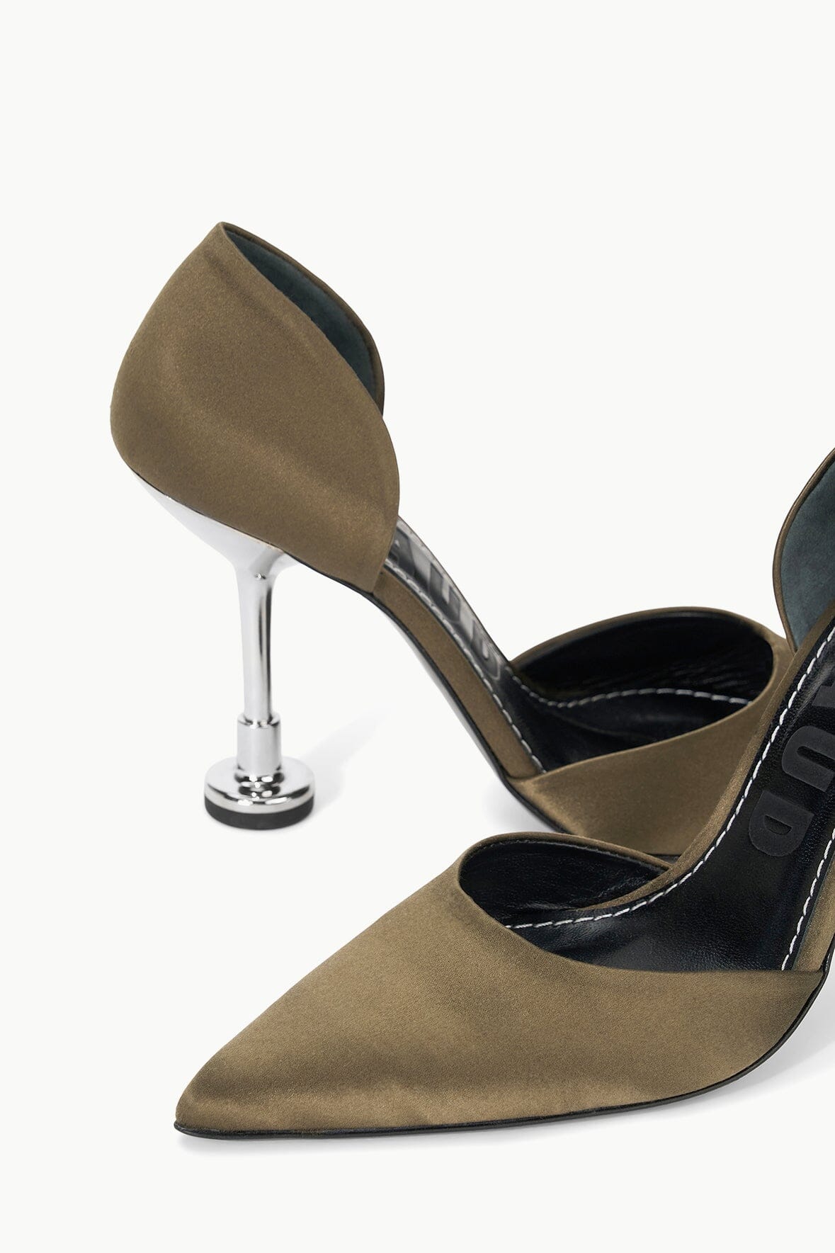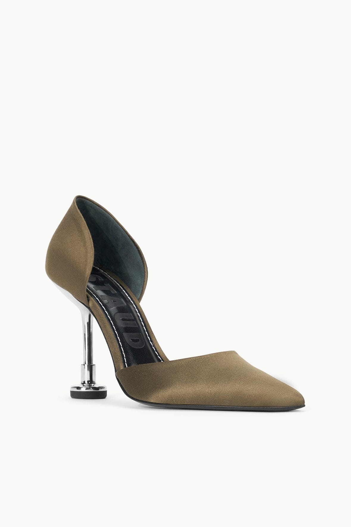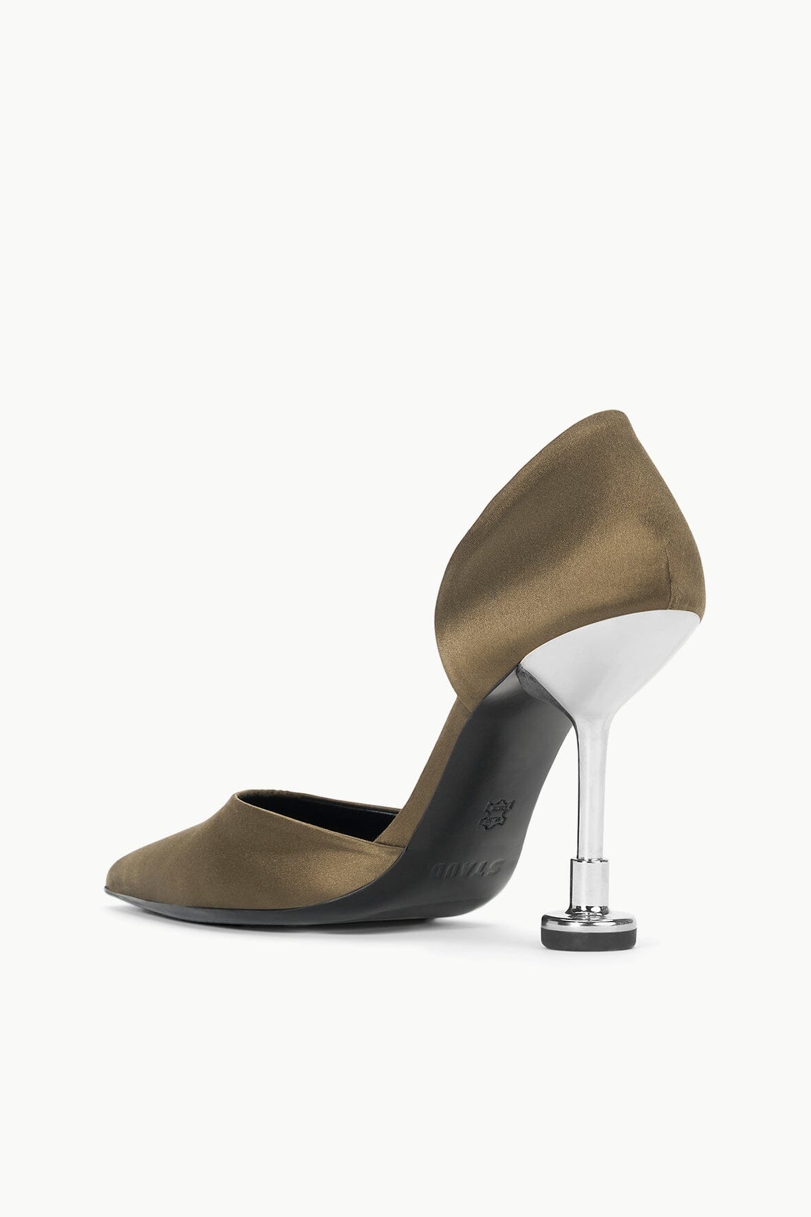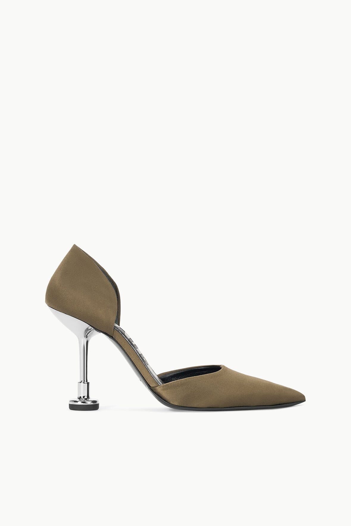 The Gardening Pump is a satin pump with a pointed toe and metal heel. The heel features a stopper making them perfect for your next garden party.