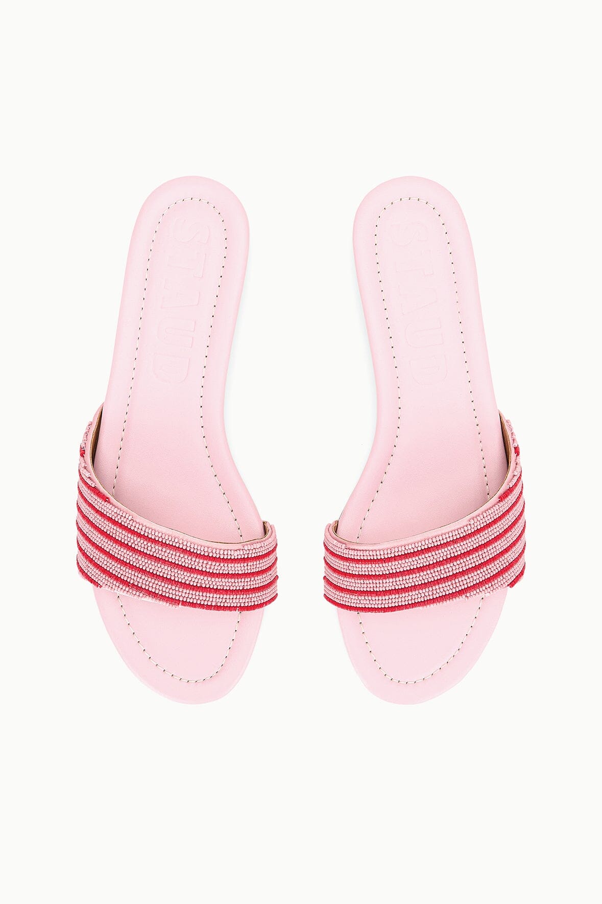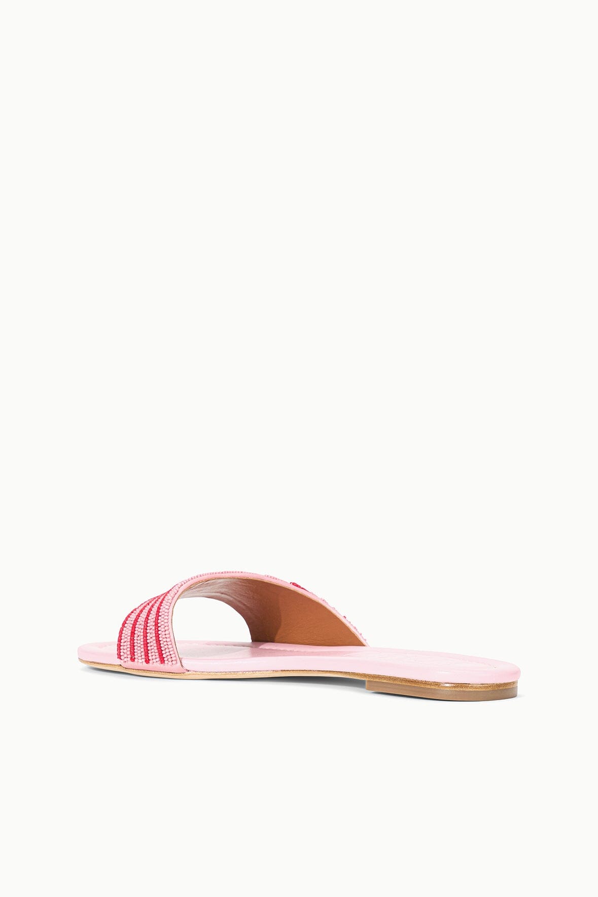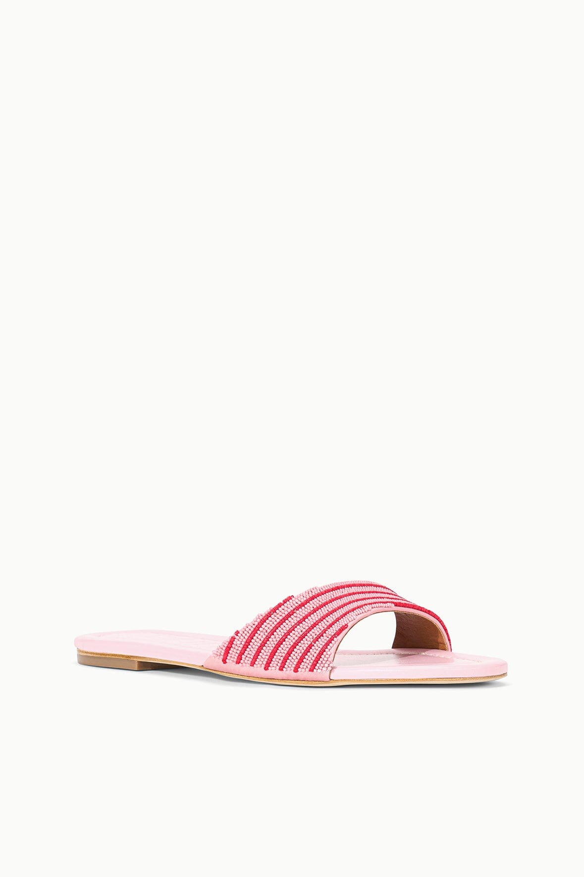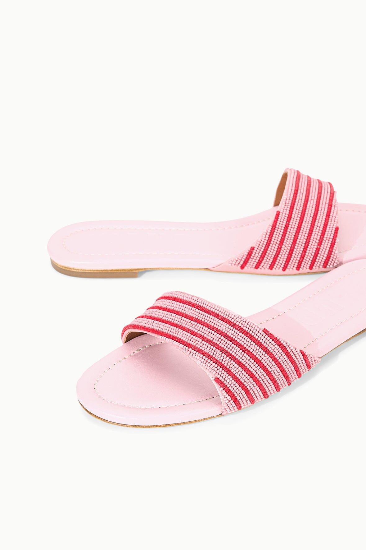 The Gracie Flat is a playful Summer slide featuring our seasonal Montauk Stripe pattern. This style features a fully beaded upper.