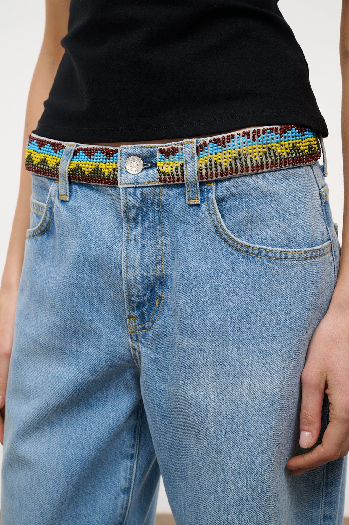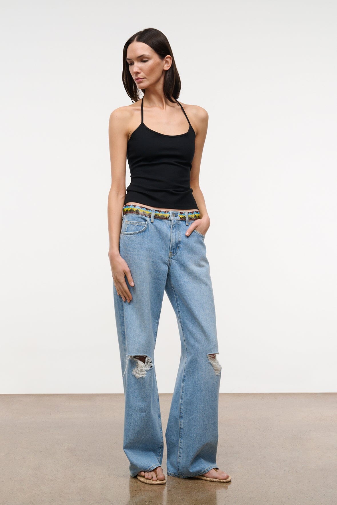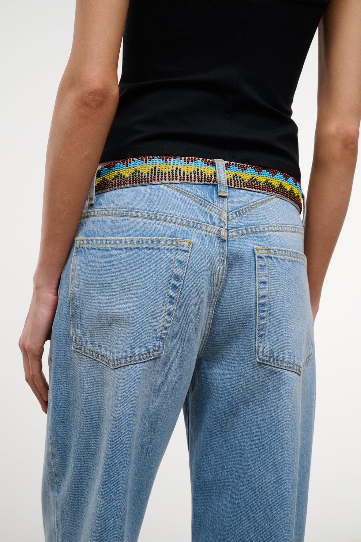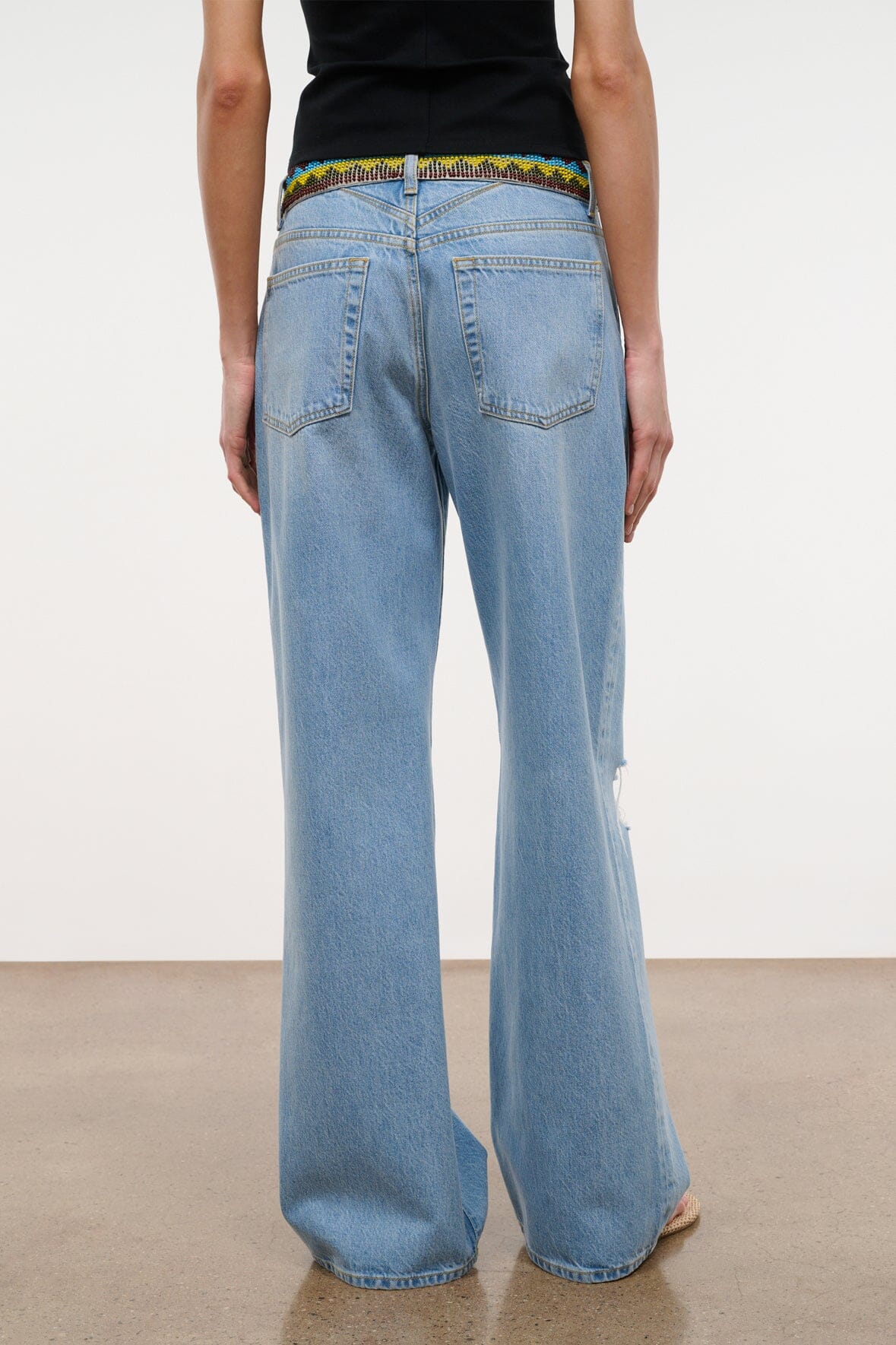 Updated for the season with a hacky sack inspired beaded waistband, the Gus Jean has a slouchy, relaxed fit with a ‘90s-inspired mid rise waist and a slight drop crotch. Cut from Italian rigid denim, it’s designed with an extended 33" inseam for pooling over heels or cuffing. Complete with flattering V-shaped yoke at the back, antique-finish hardware and logo-embroidered zip fly.