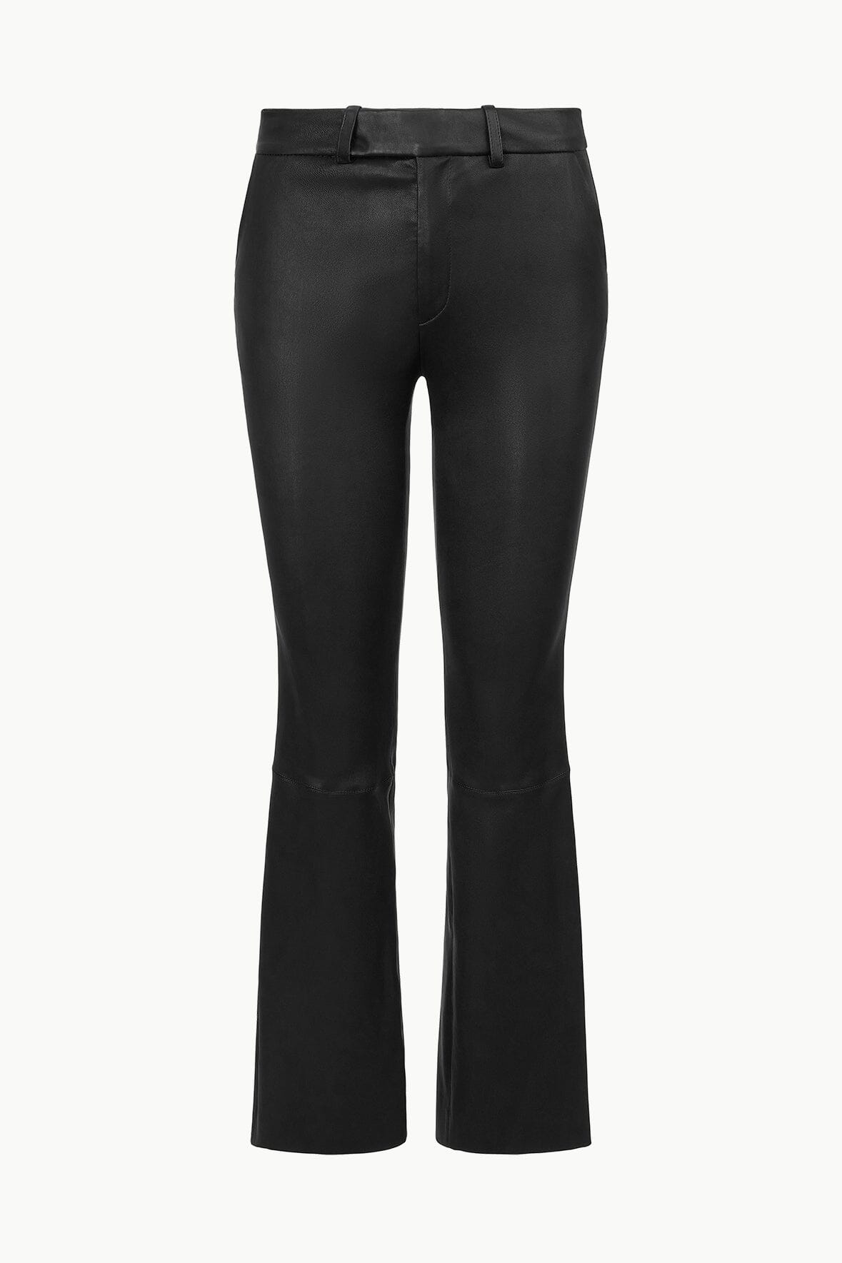 A boot cut trouser crafted from a soft, stretchy lamb leather. The Hanover features a mid rise with zipper fly and back welt pocket.
