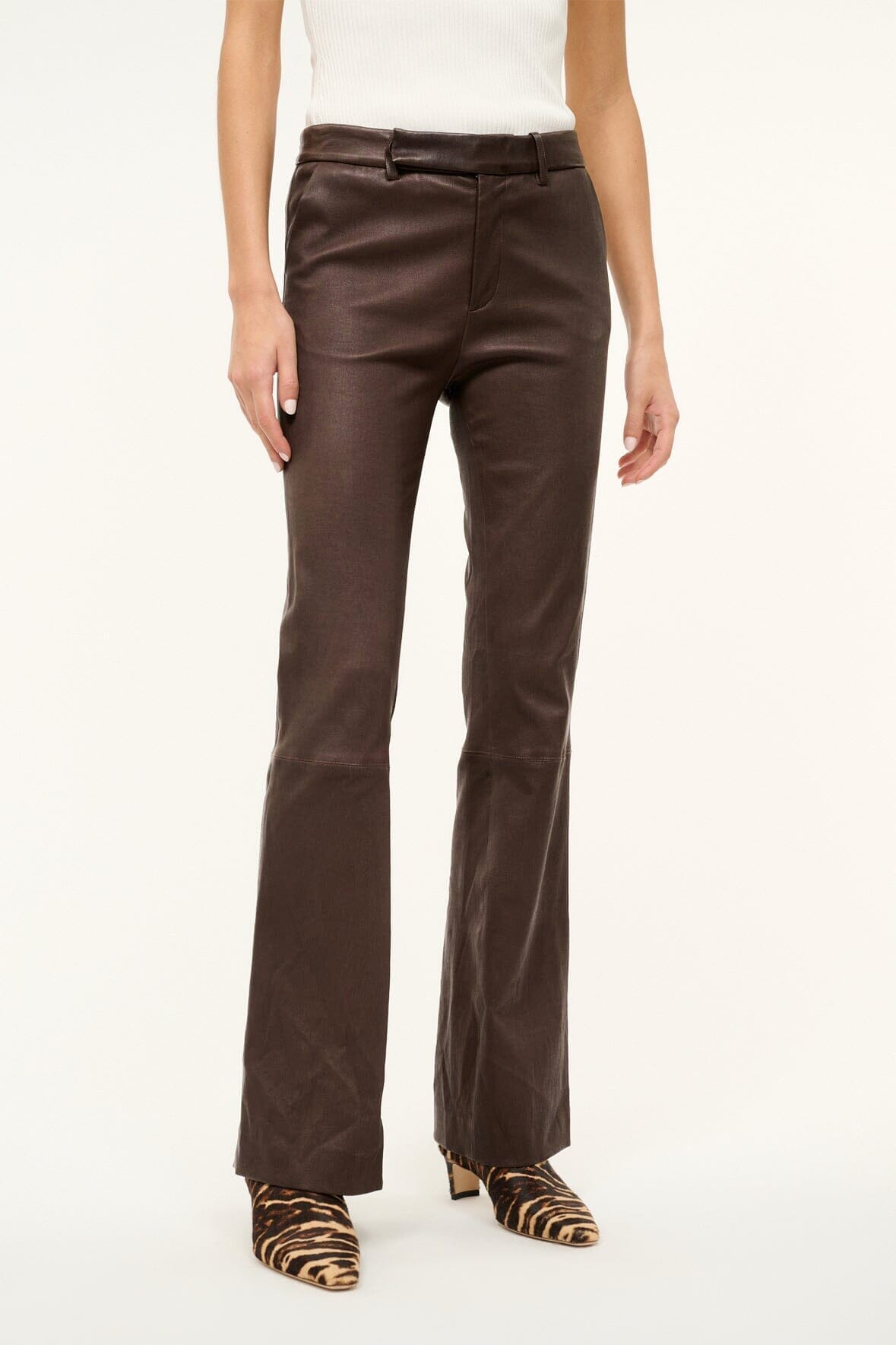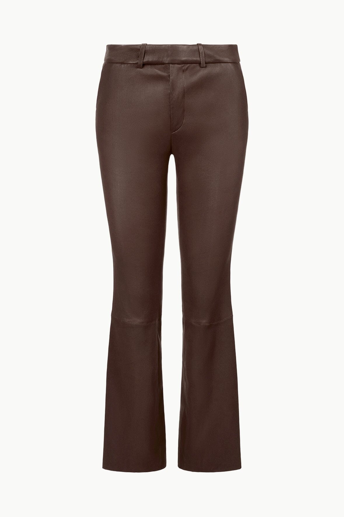 A boot cut trouser crafted from a soft, stretchy lamb leather. The Hanover features a mid rise with zipper fly and back welt pocket.