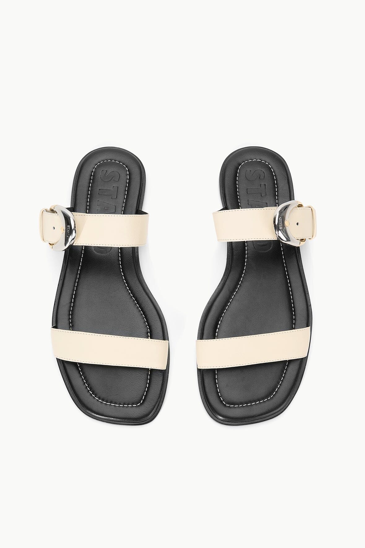 Our newest footwear family, the Harlow is offered in a flat slip-on sandal featuring our moon buckle detailing on an adjustable strap.