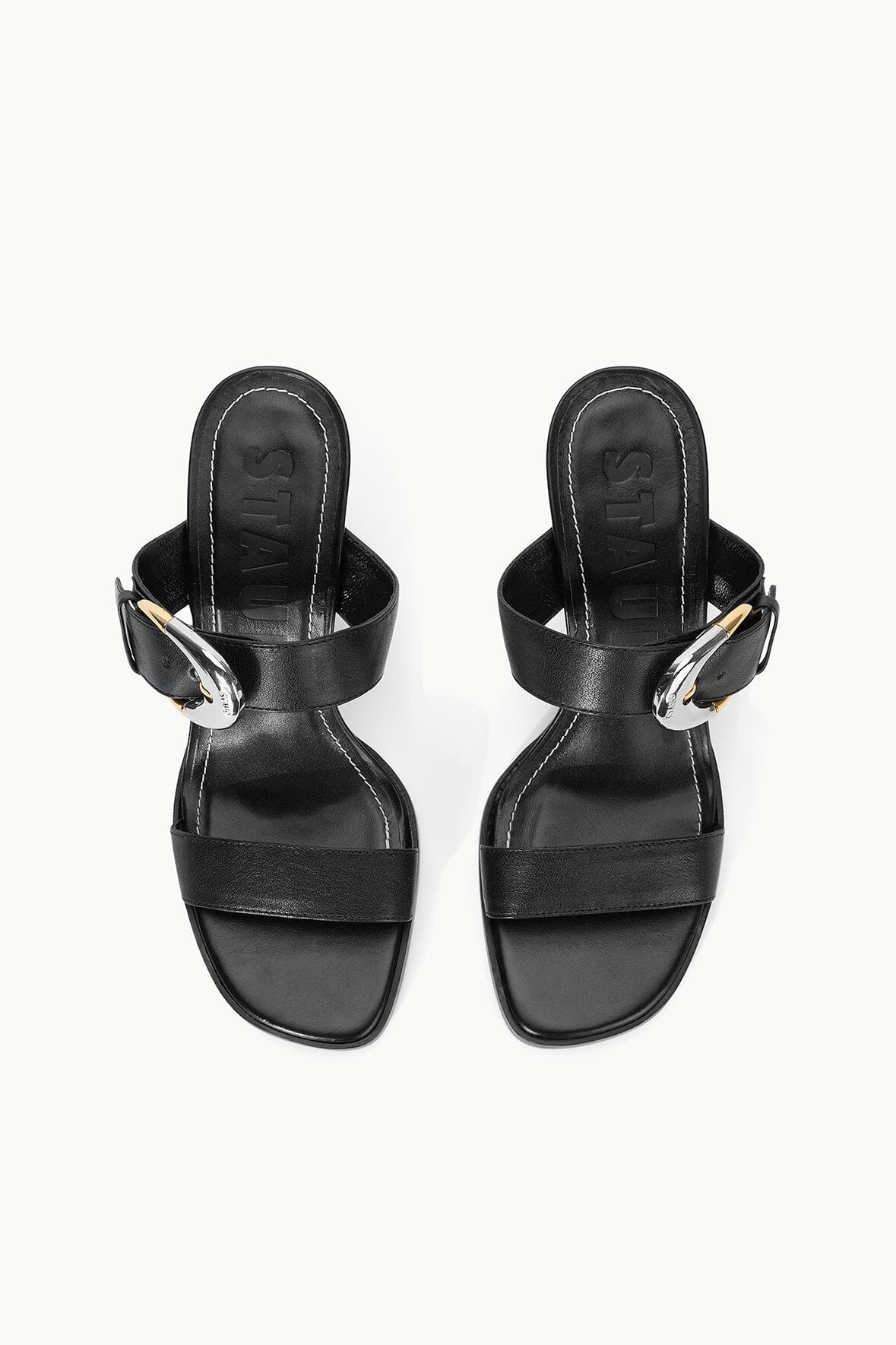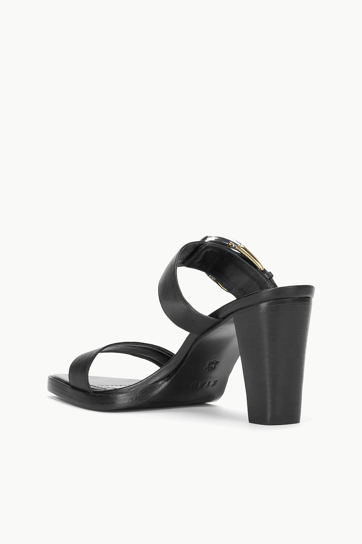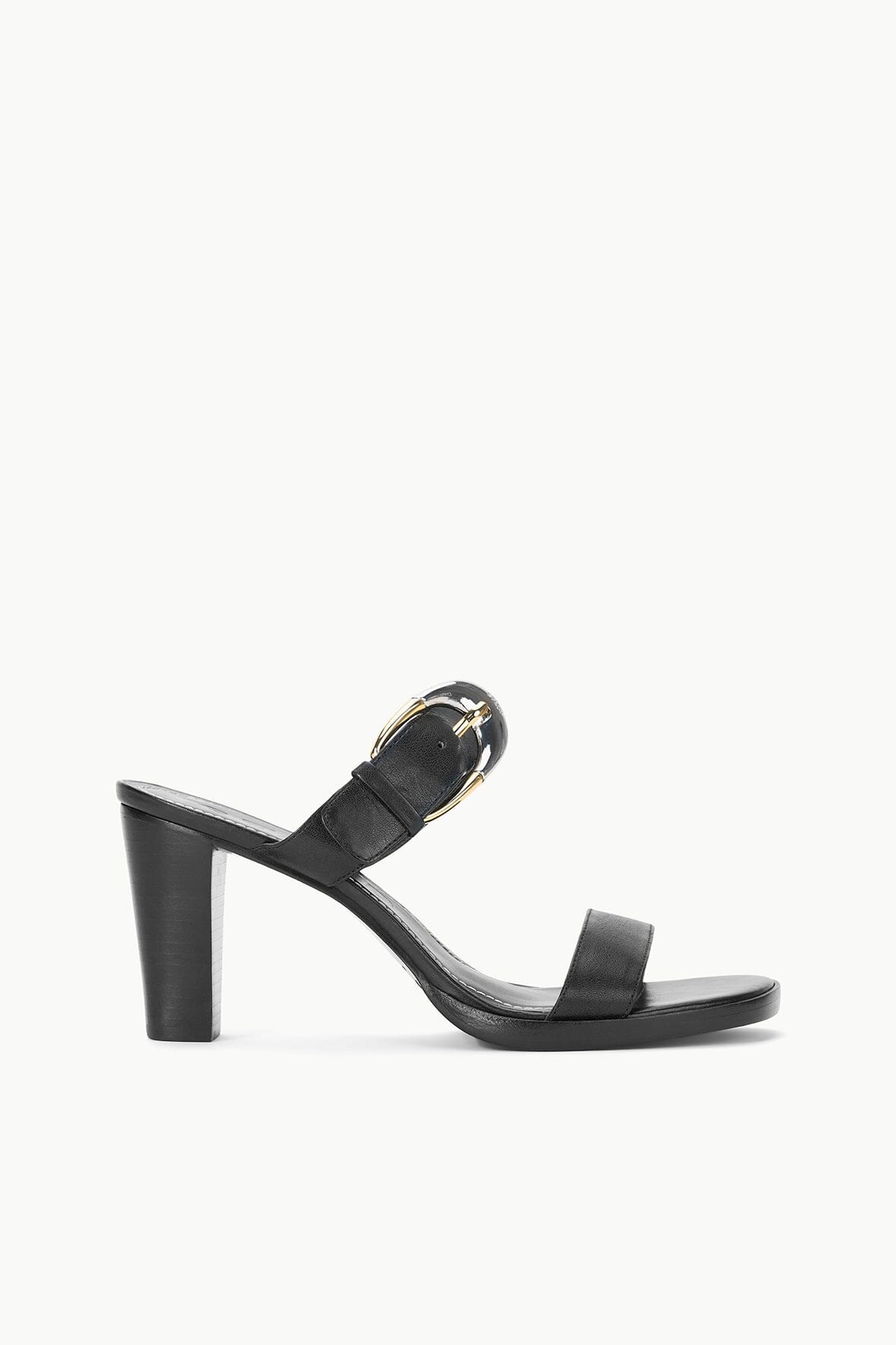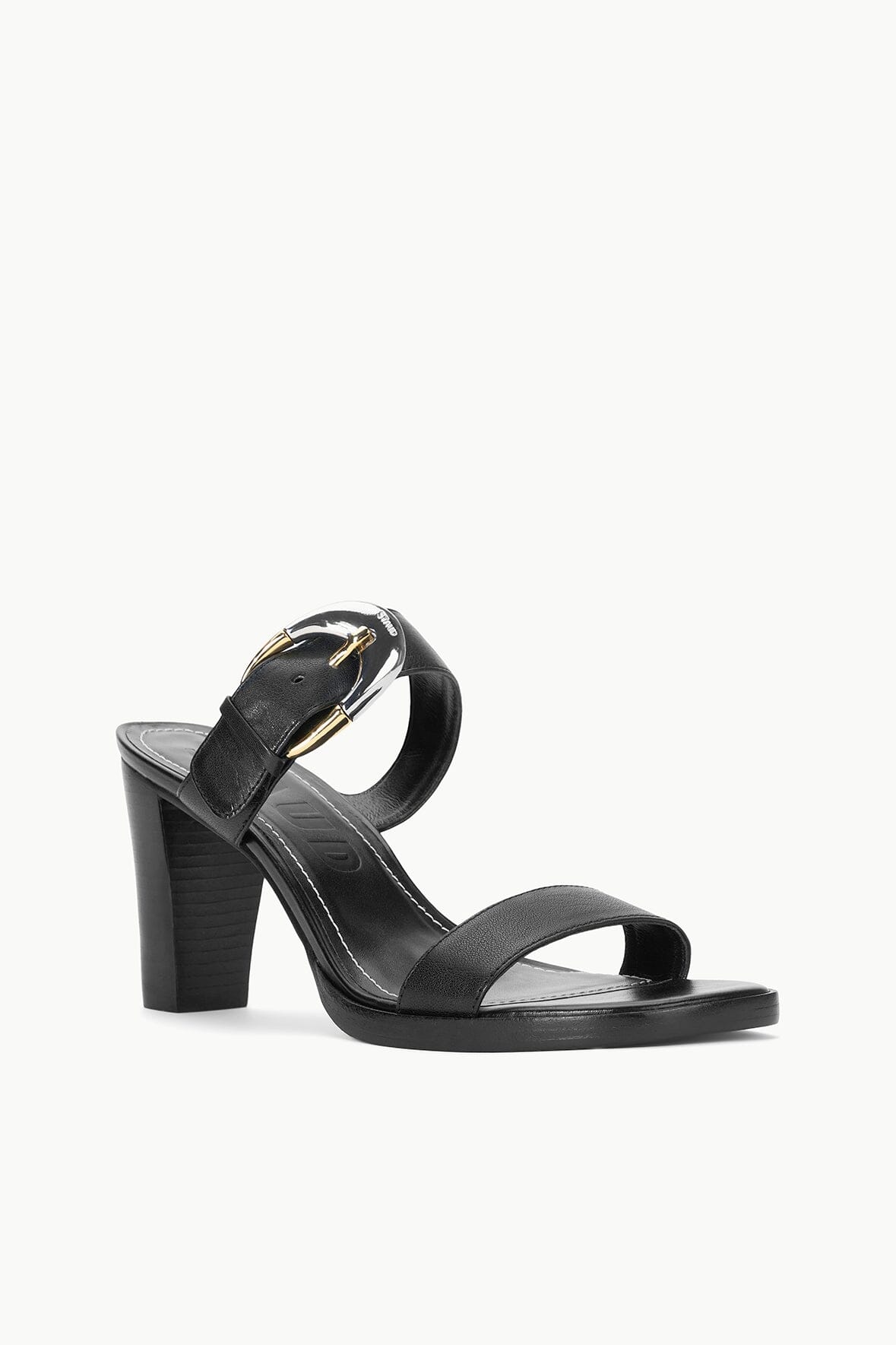 A stacked leather heel with double strap upper, the Harlow High Heel features moon buckle details on adjustable leather straps and leather lining for added comfort.