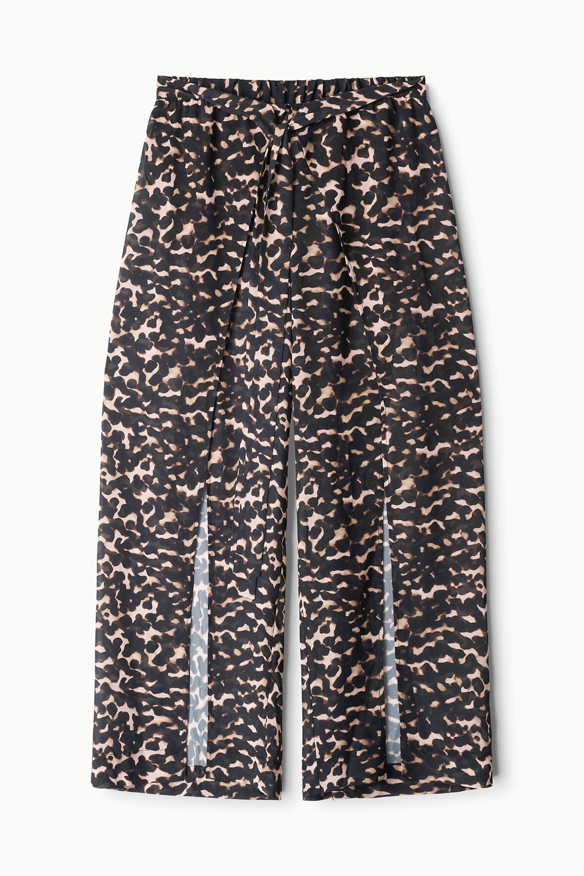 Sheer chiffon wide-leg pant in a tortoise print with dramatic high side slits. Layer it over your swimsuit for an effortless beach look, or wear solo for a breezy, versatile piece that transitions from day to night.