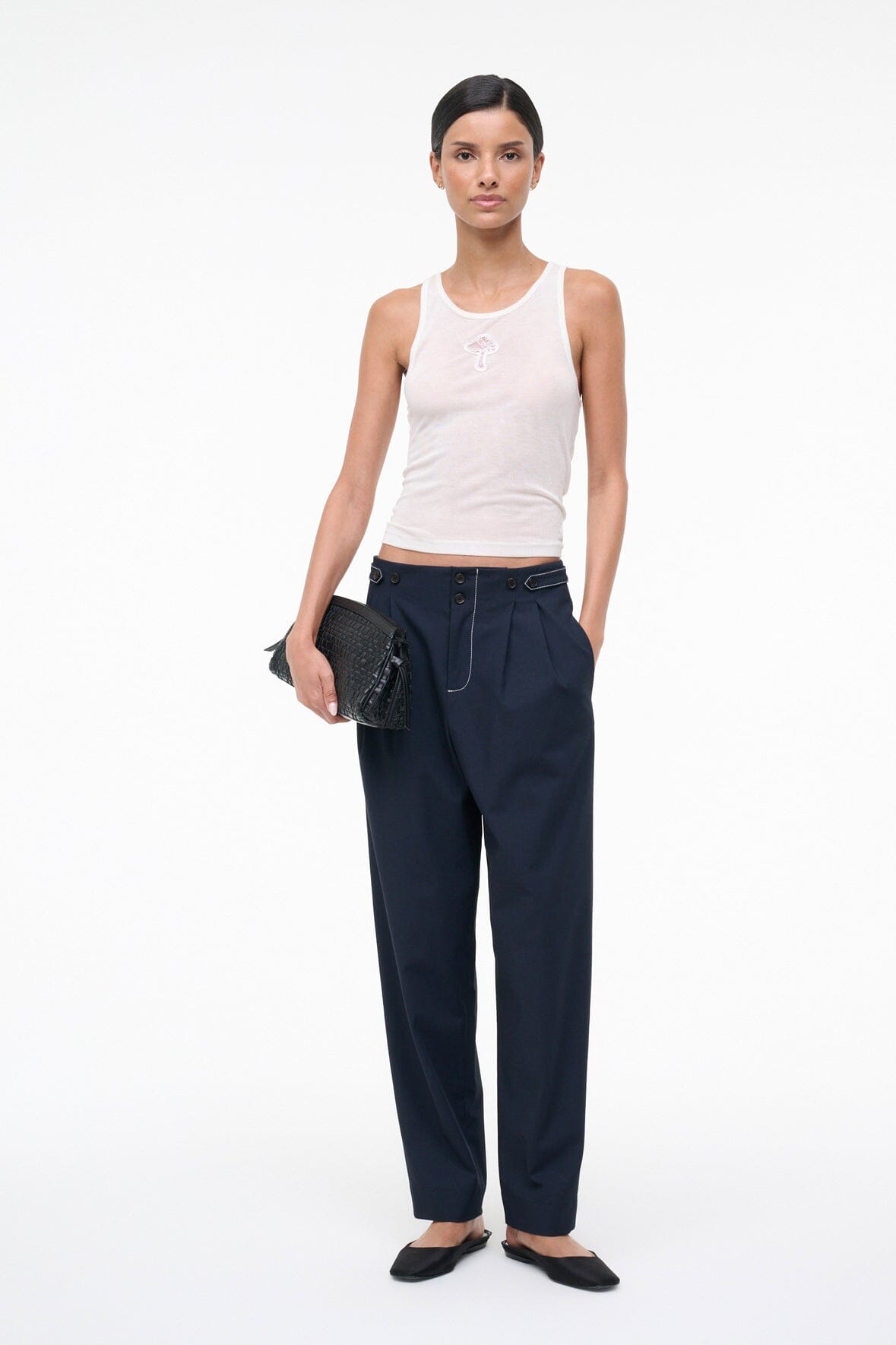 Tailored high-waist straight leg trouser crafted from stretch suiting for all-day comfort. Features double front pleats and refined button detailing for a polished, sophisticated look.