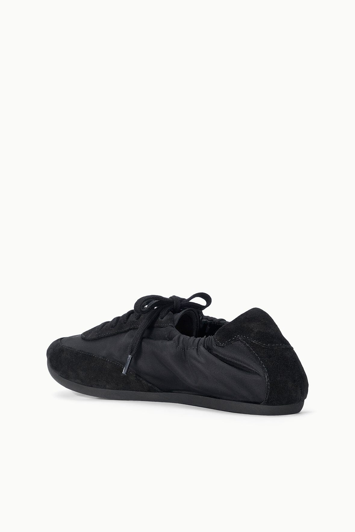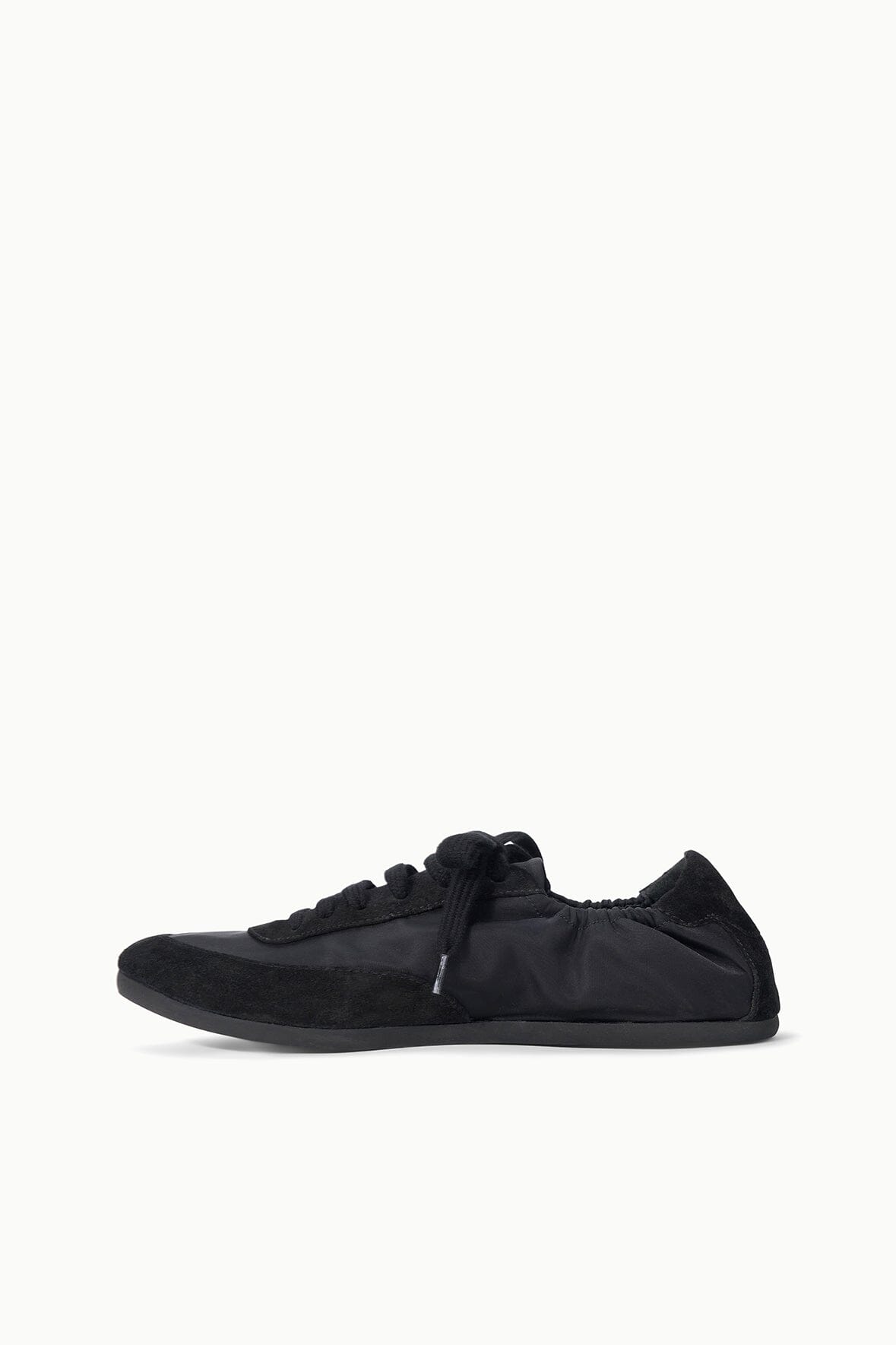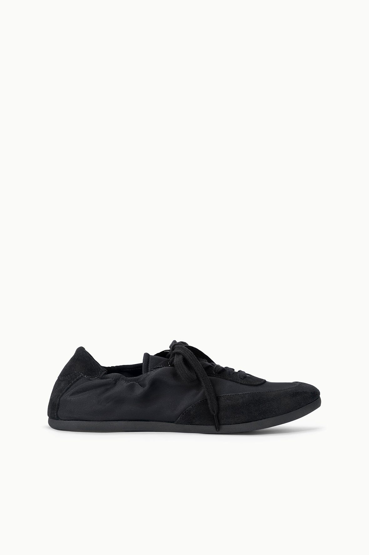 The Joey is a ruched sporty ballet flat crafted from a nylon and suede combination. It features a rounded toe, center front laces and a flat sole.