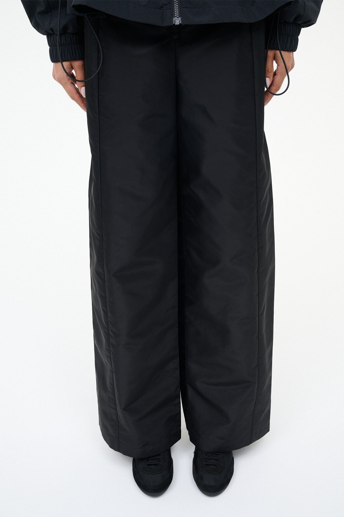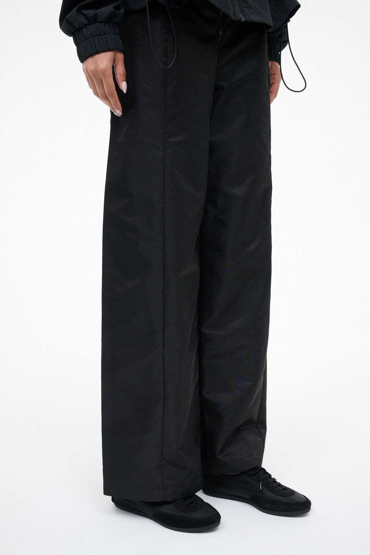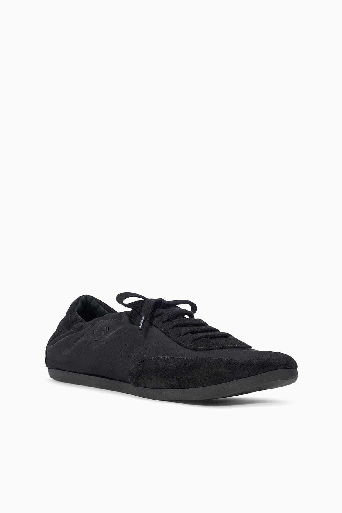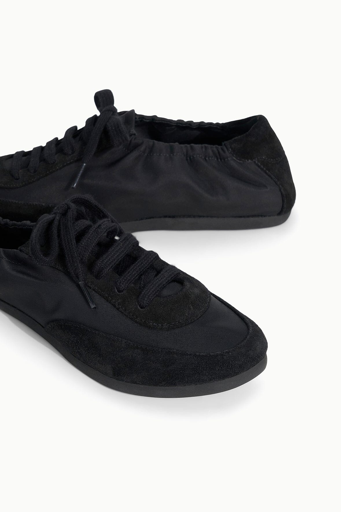The Joey is a ruched sporty ballet flat crafted from a nylon and suede combination. It features a rounded toe, center front laces and a flat sole.