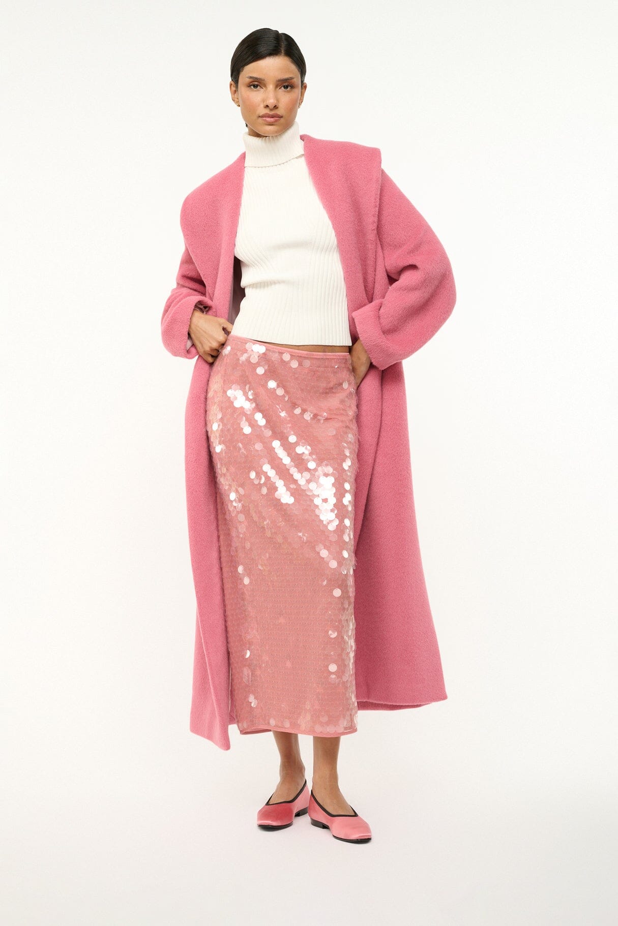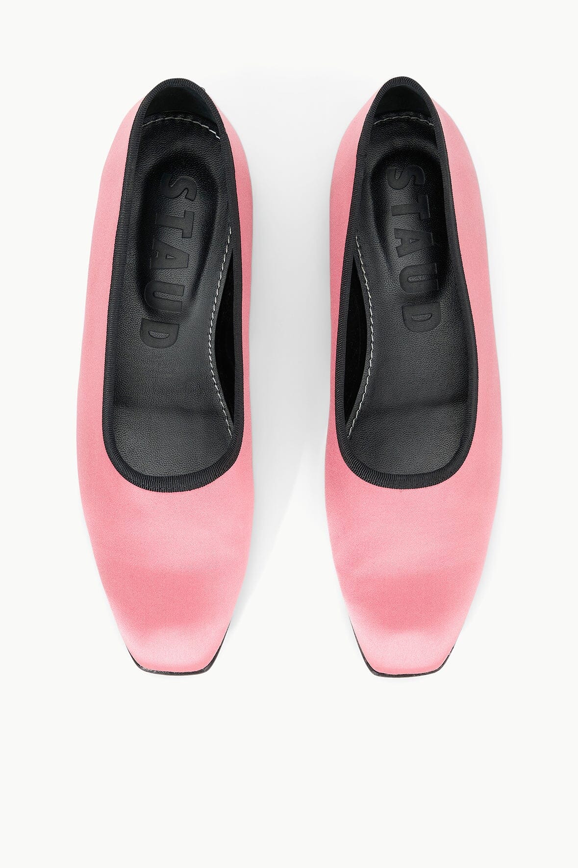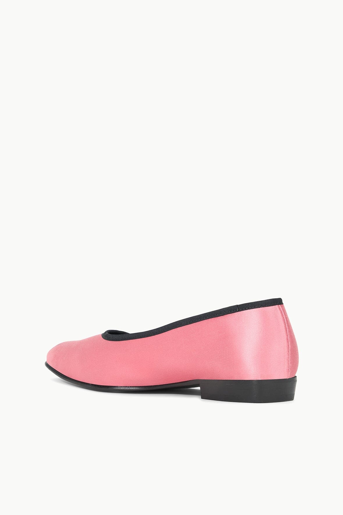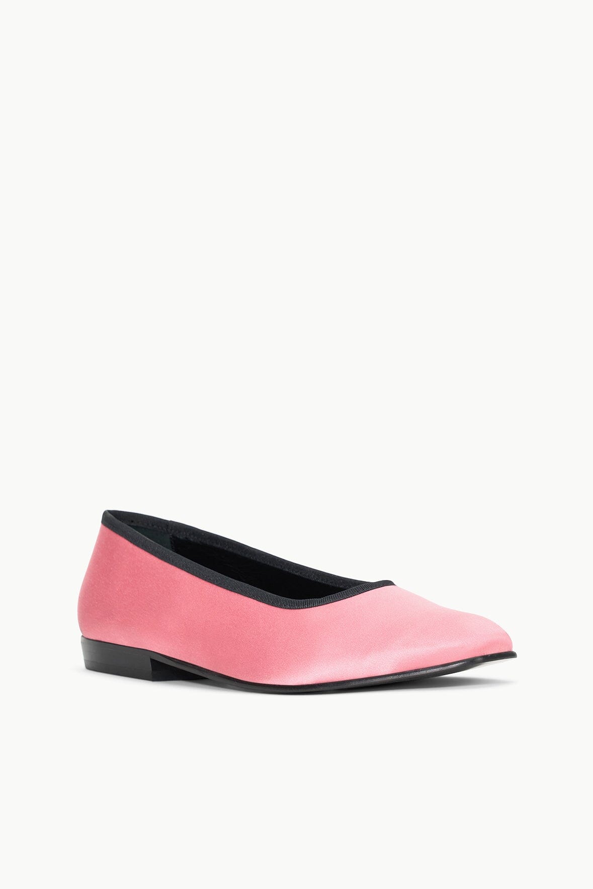 The Keith Ballet Flat is a satin flat with a contrasting grosgrain trim featuring an elongated squared off toe.
