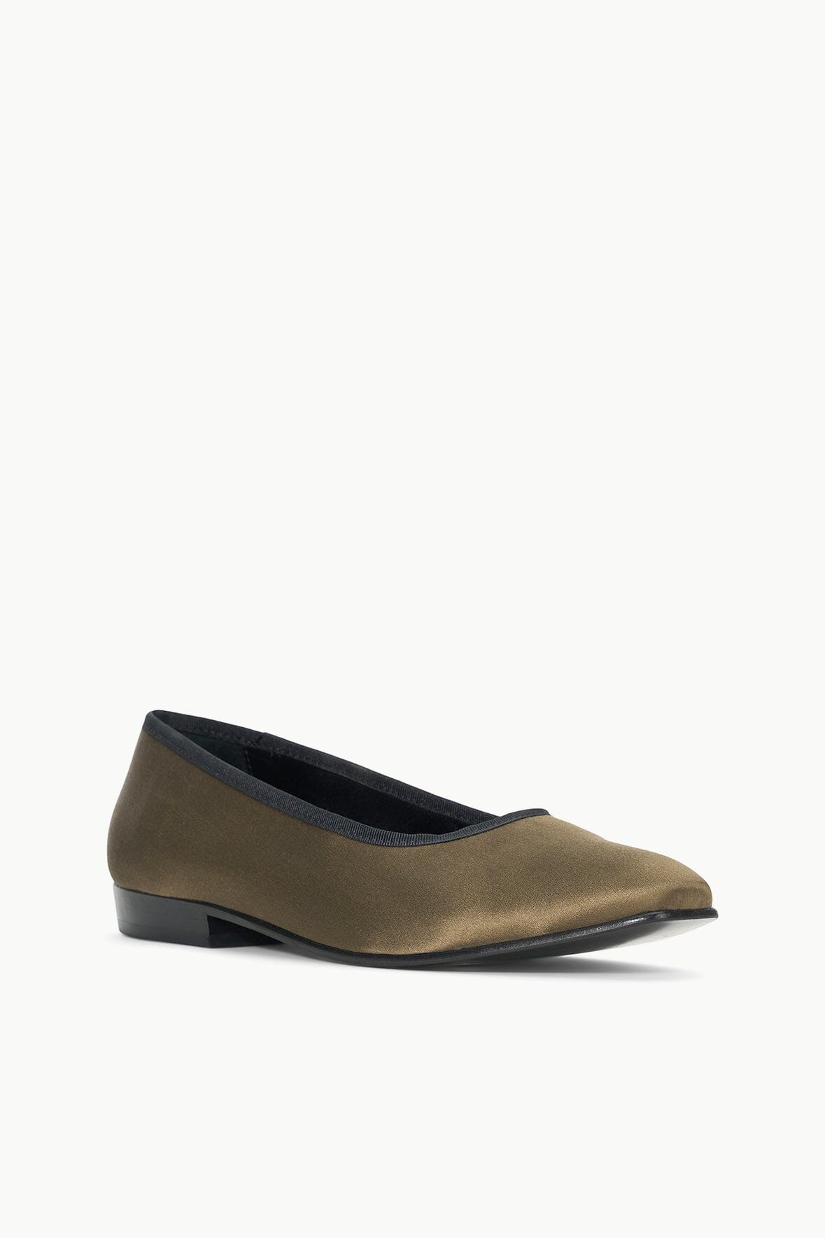 The Keith Ballet Flat is a satin flat with a contrasting grosgrain trim featuring an elongated squared off toe.