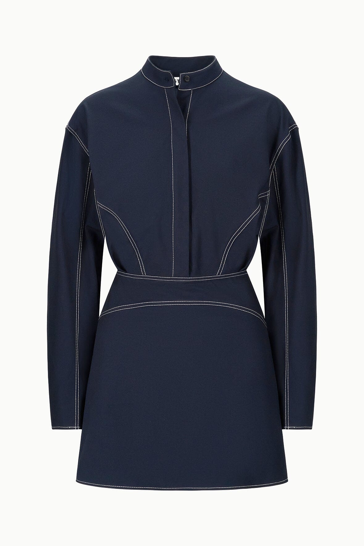 Tailored mini dress in stretch suiting with a crisp collar and long sleeves. Curved seam details follow your silhouette for a flattering fit, with contrast stitching detail for added visual interest.