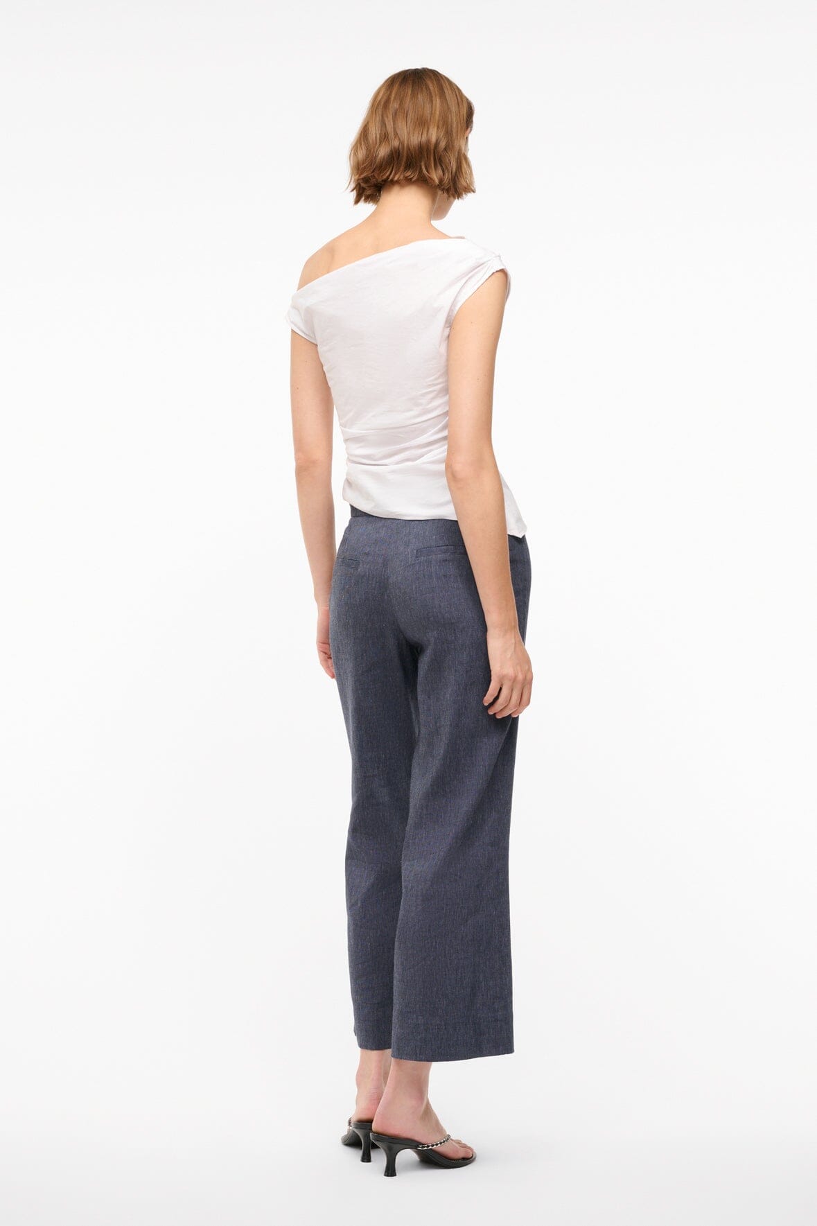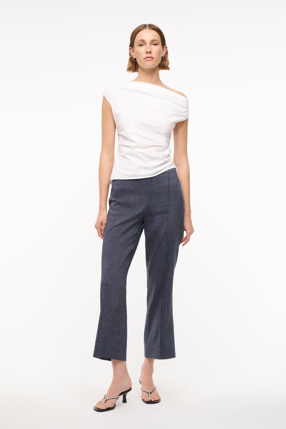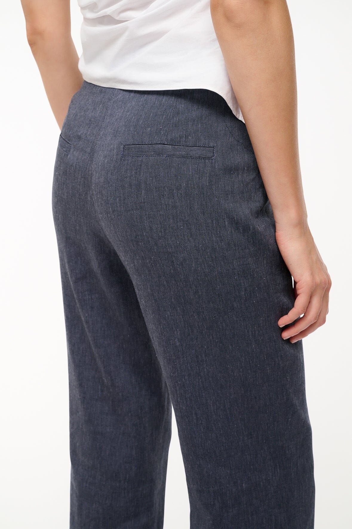 An ankle length pant made out of a stretch linen fabric with princess seams at the front and a center back zipper.