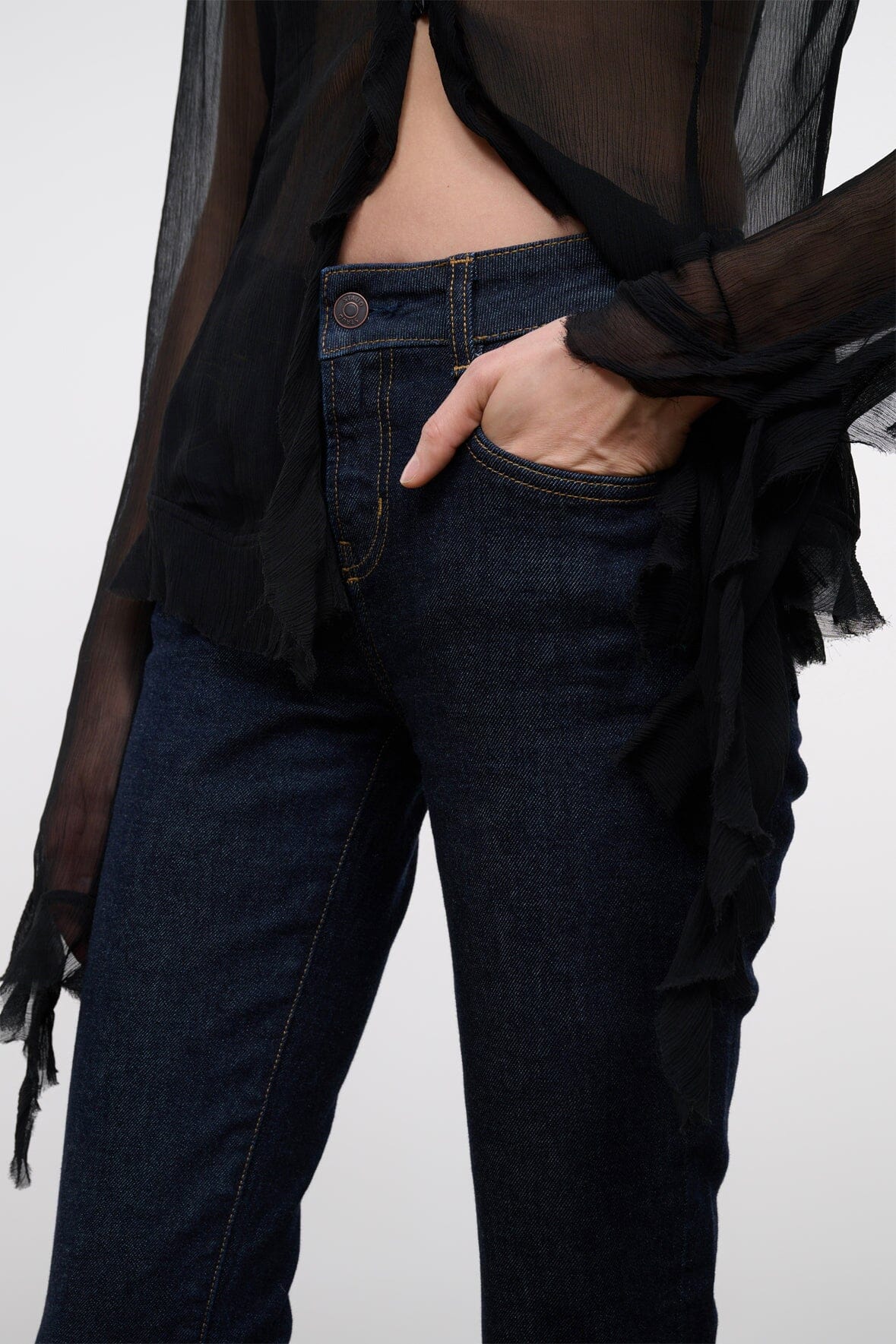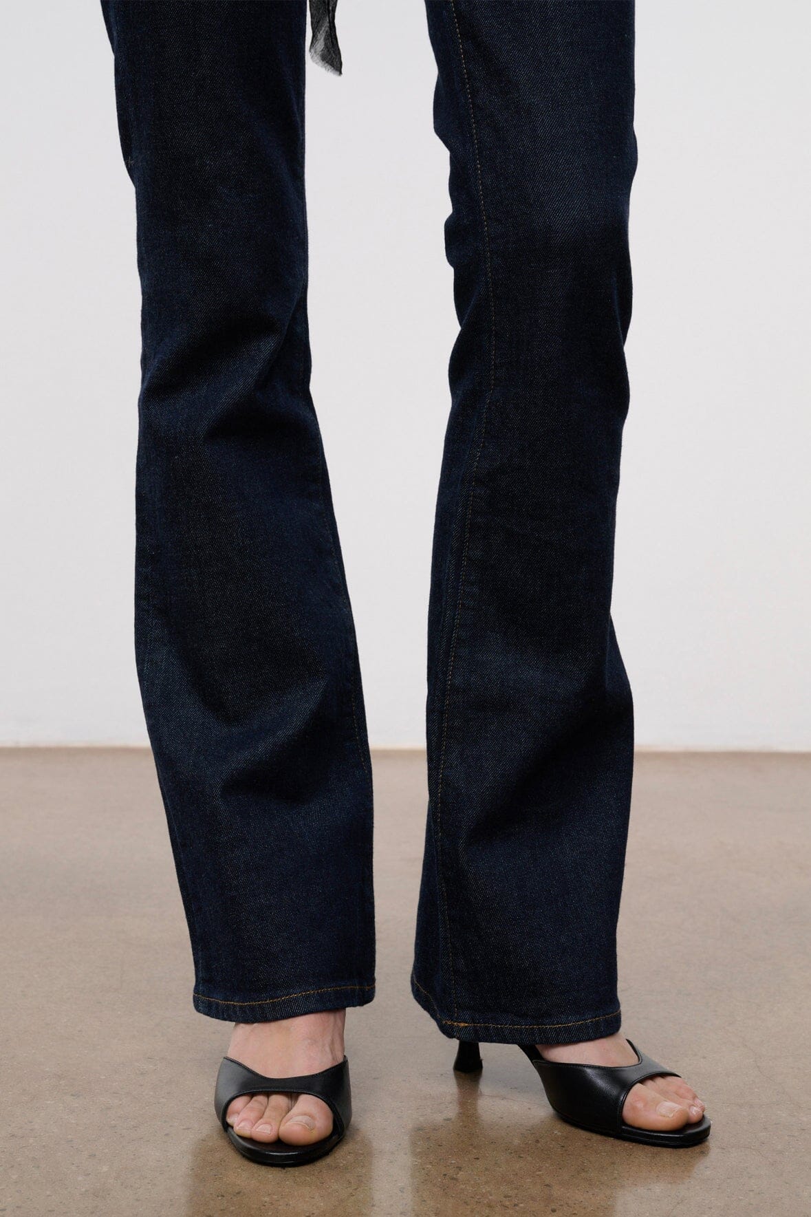 The Kyle Jean is a flattering, ‘90s-inspired silhouette with a low-rise waist and cinching V-shaped yoke at the back. Cut from denim with a hint of stretch, its shape contours the hips and thighs, then falls to a dramatically flared leg. Complete with antique-finish hardware and logo-embroidered zip fly.