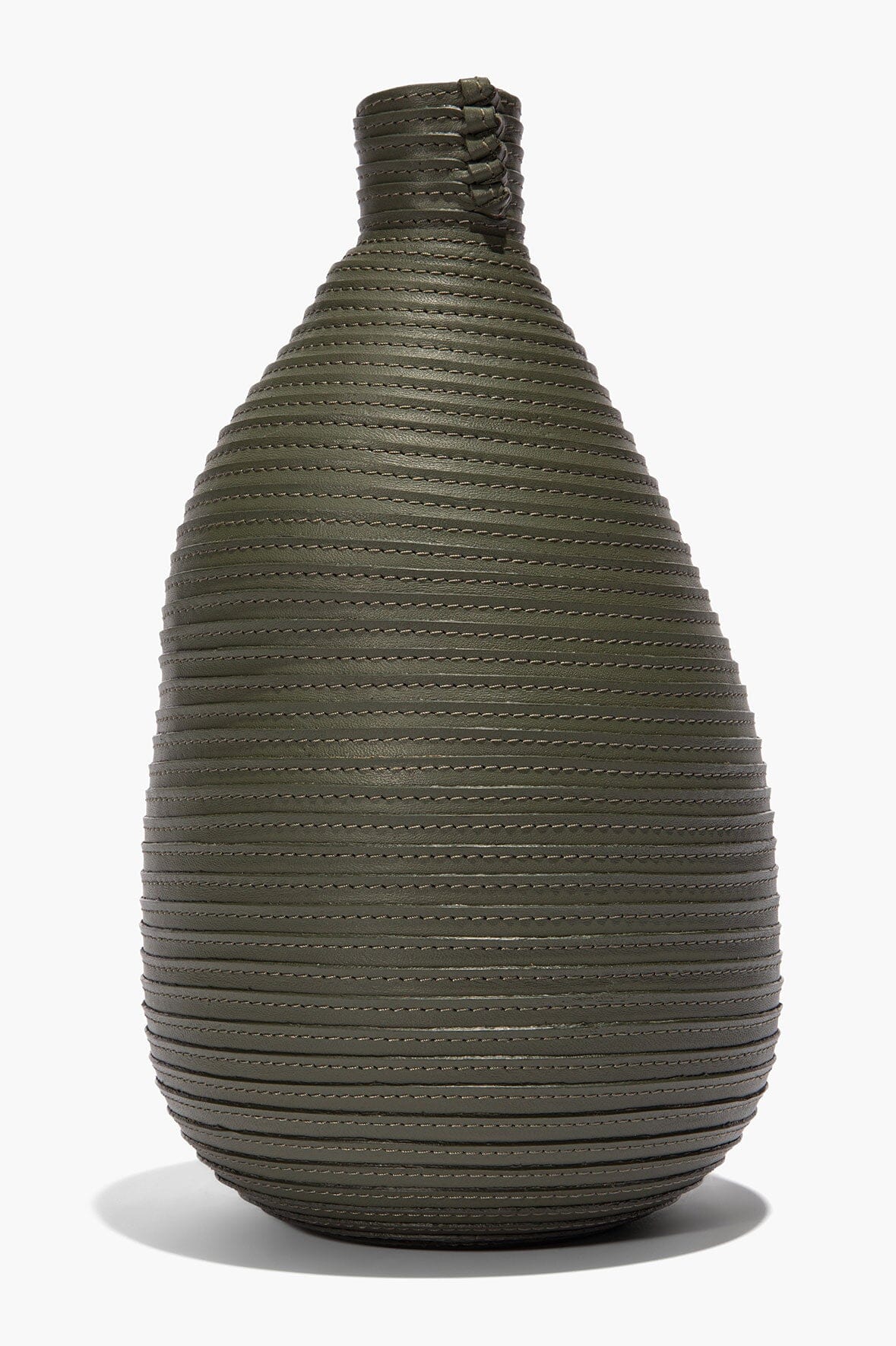 Large in scale, this statement vase is wrapped in moss leather, its rounded silhouette built from continuous layers that create depth through repetition. Equal parts elemental and sculptural.