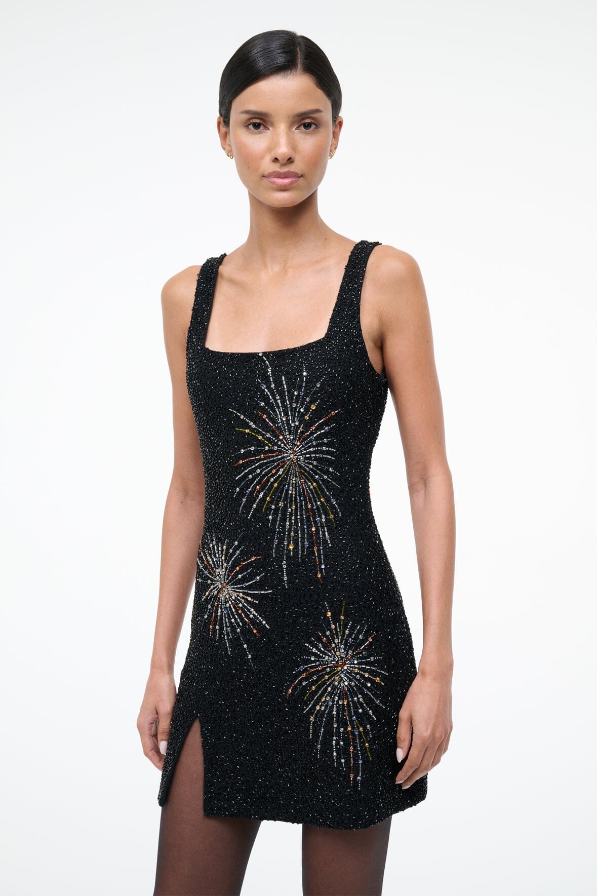 Our classic beaded mini dress gets a festive firework pattern update for the season. This style offers slight stretch and has a hidden side zipper.