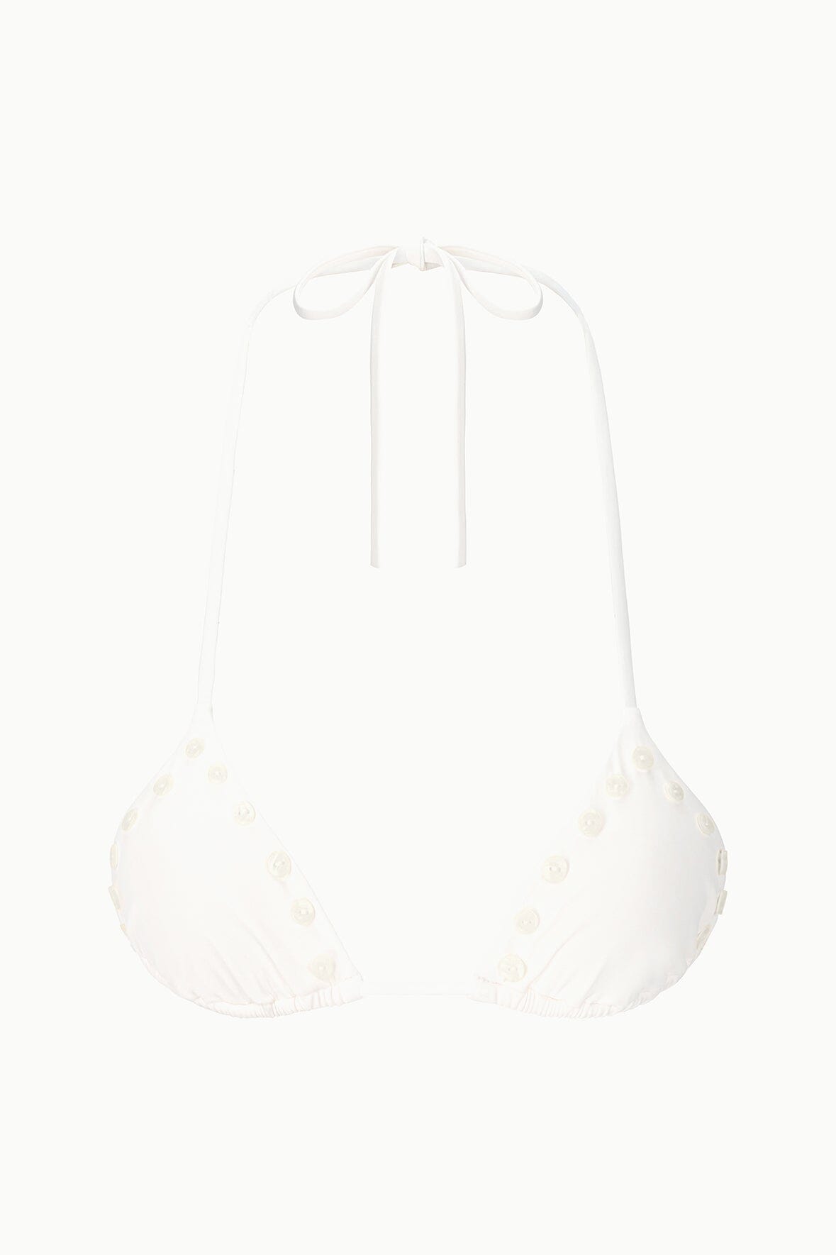 The Lido Bikini Top features a classic tie halter neckline and adjustable back tie, finished with subtle tonal button detail trim. This string bikini delivers timeless style with modern touches.