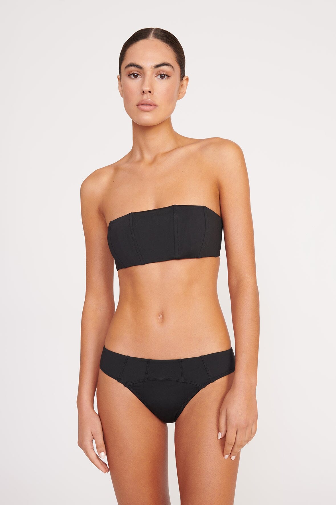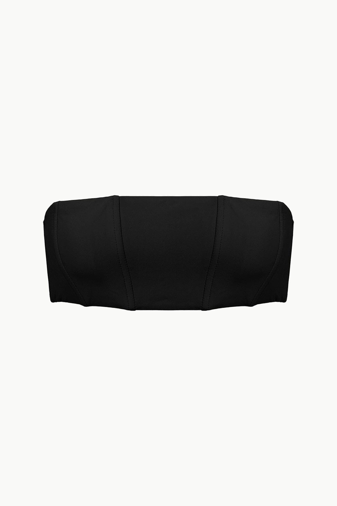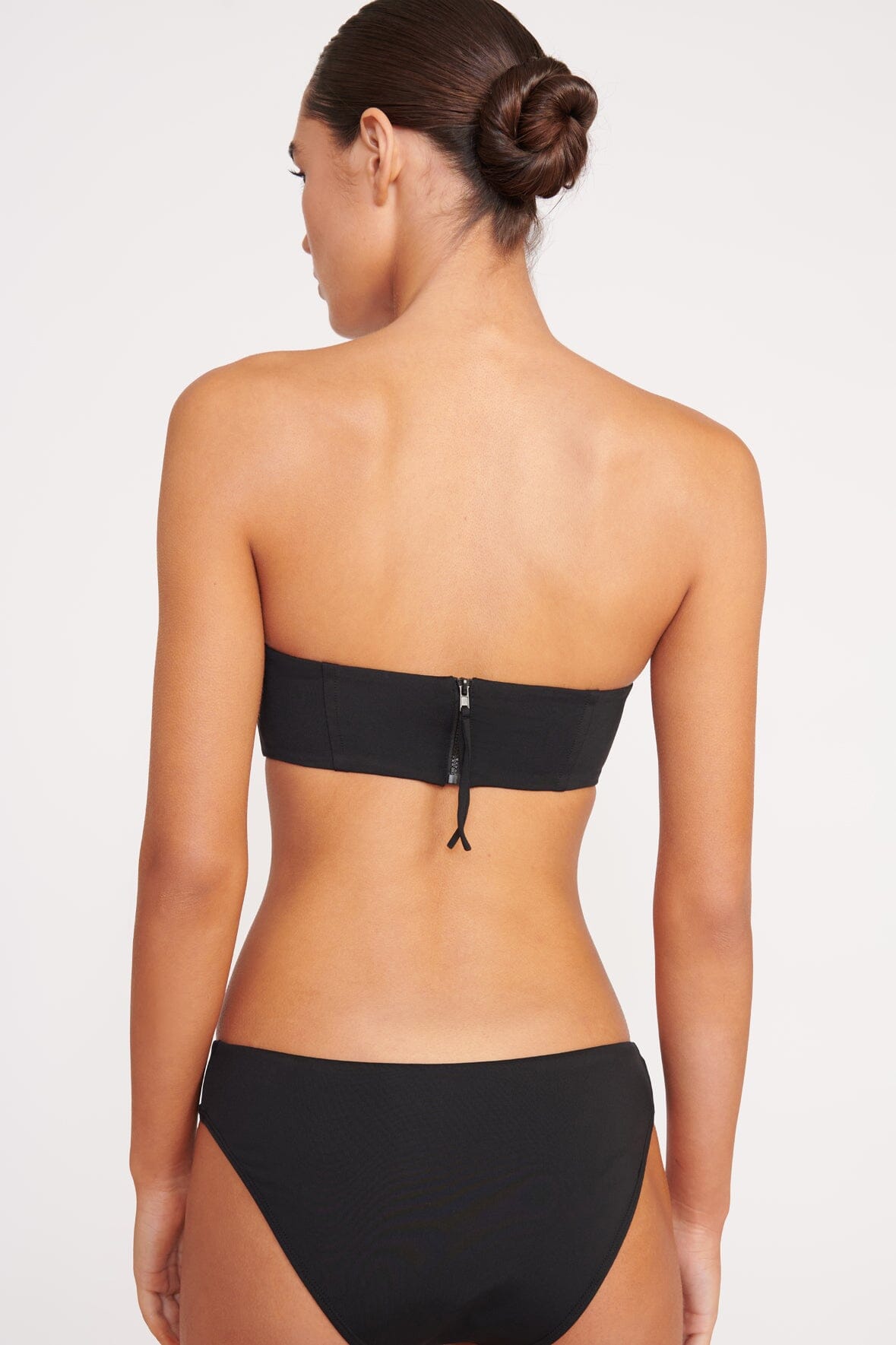 The Mala Bikini Top is a strapless bandeau bikini top with a back zip closure. This style features boning throughout the chest for a structured, corset-inspired look.