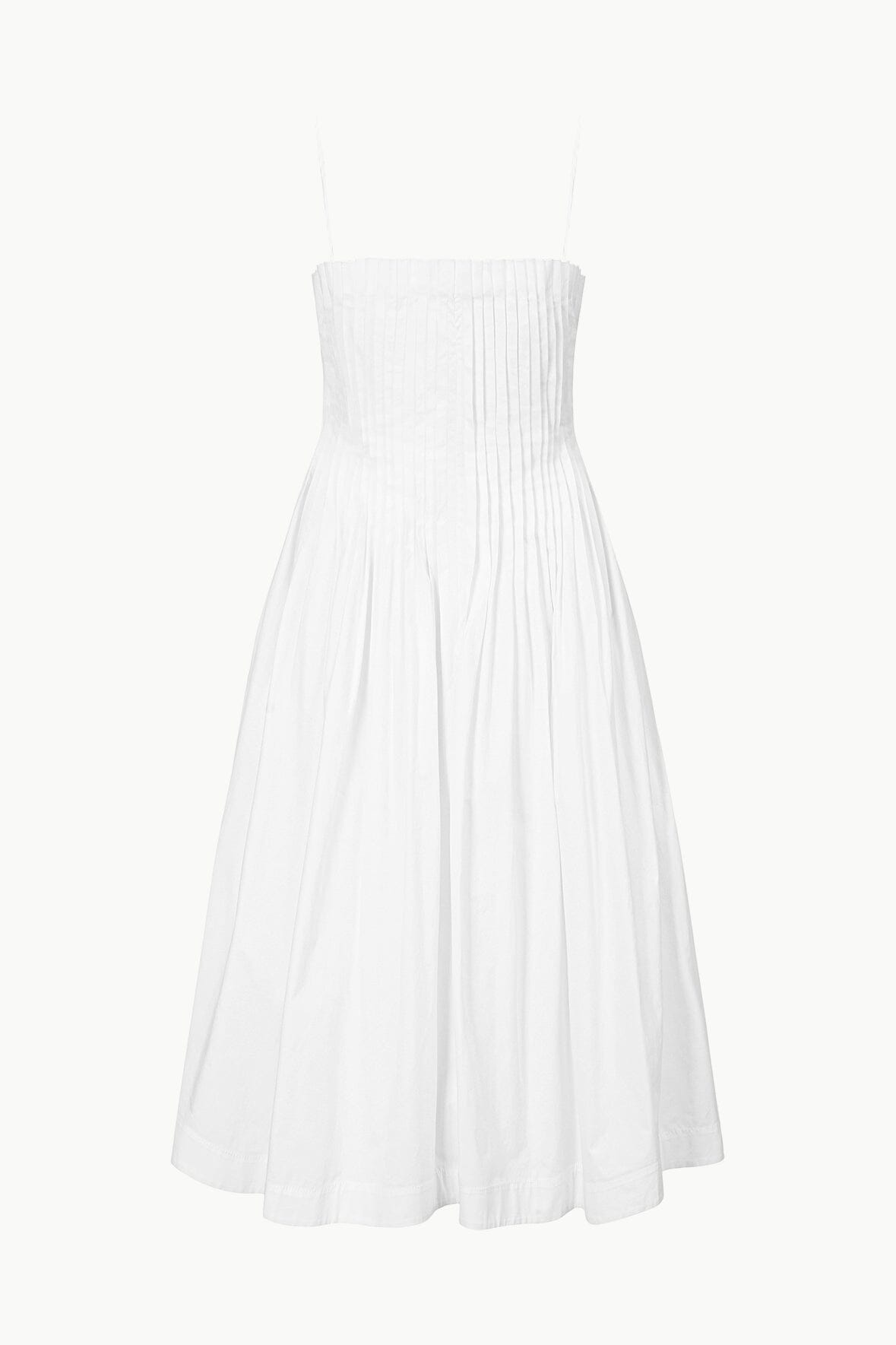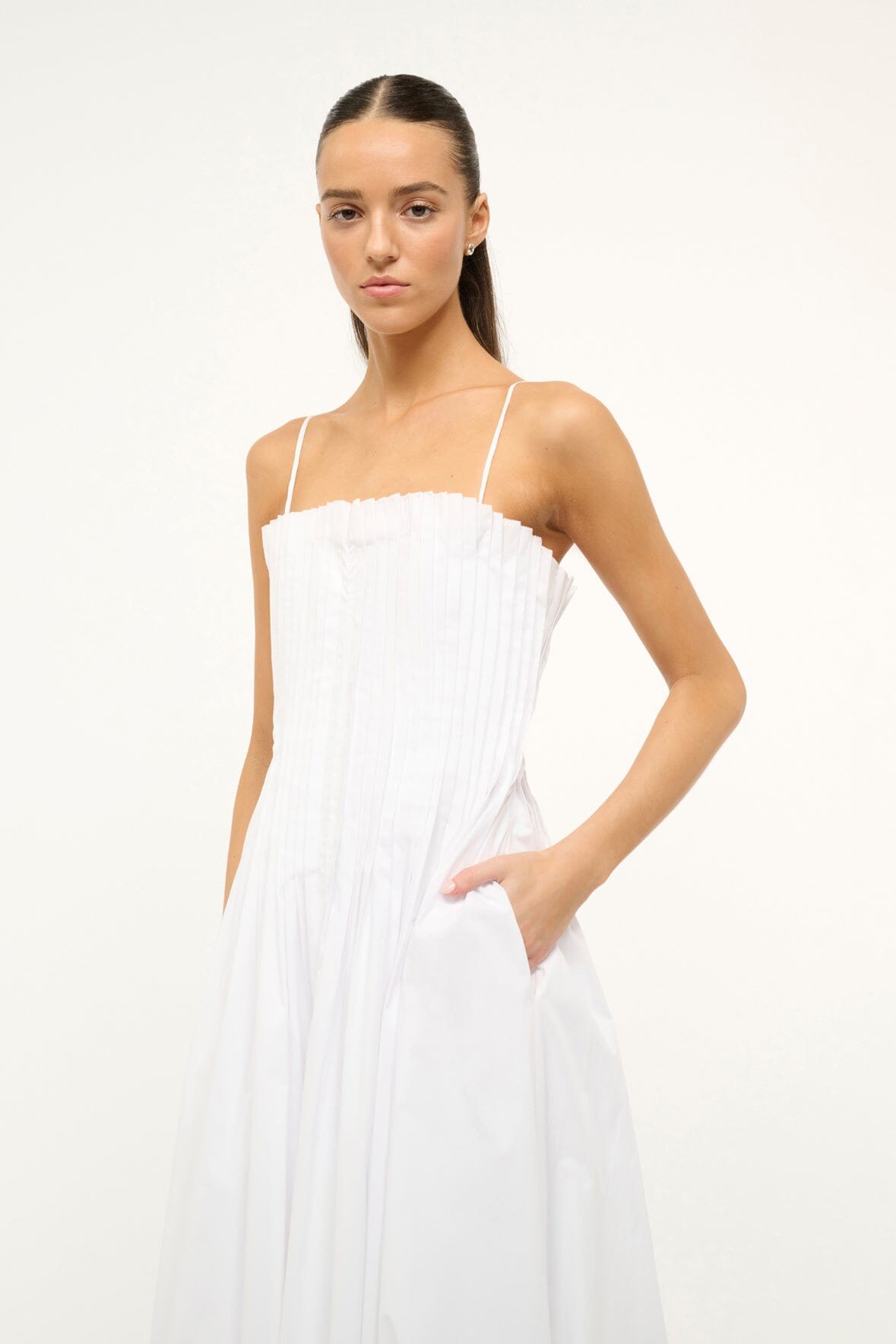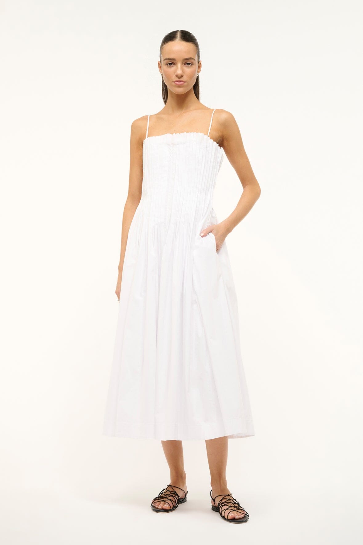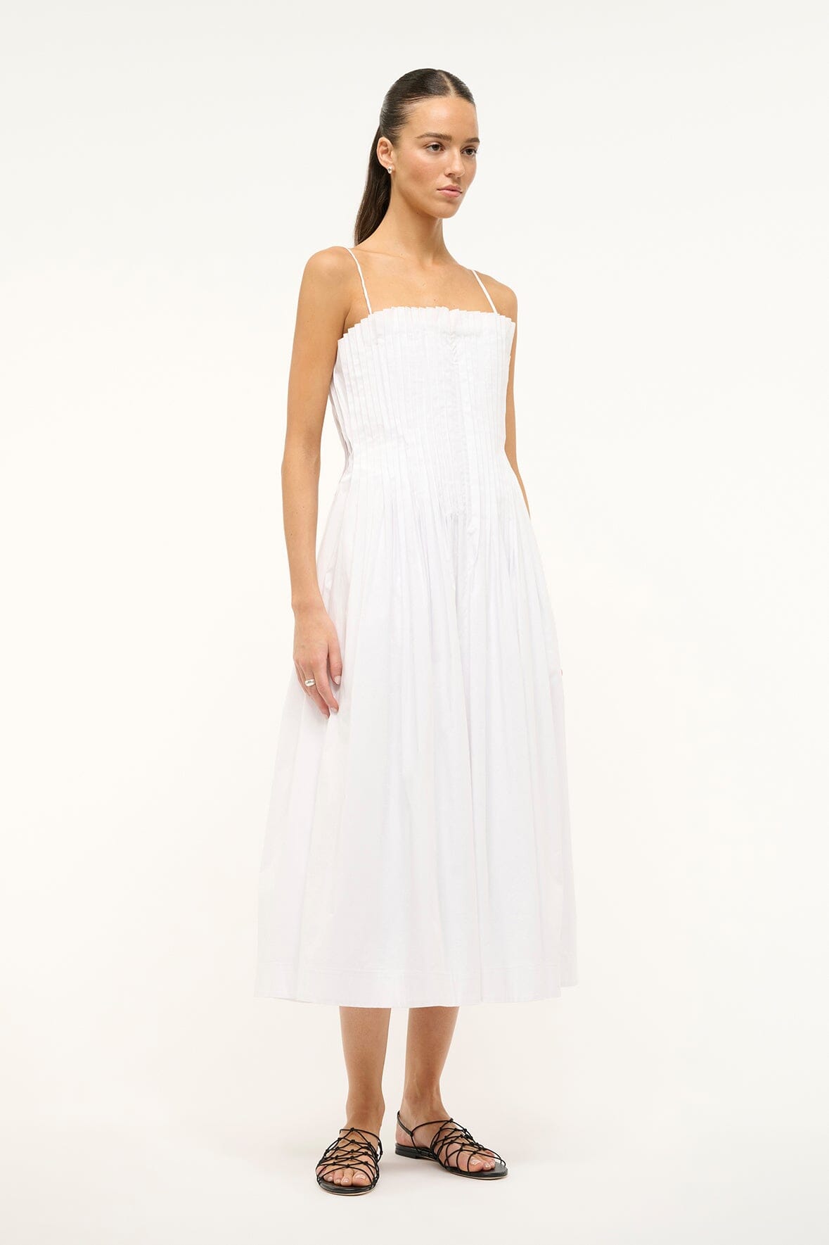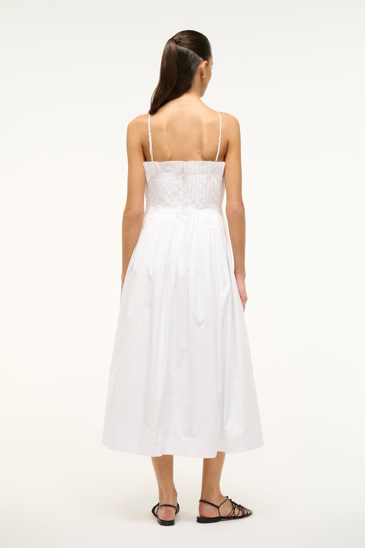 A midi-length dress with spaghetti straps, the Midi Bella features a fully pintucked bodice and v-shaped waistline. This style has an interior corset for added structure and is made out of our stretchy cotton poplin fabric.