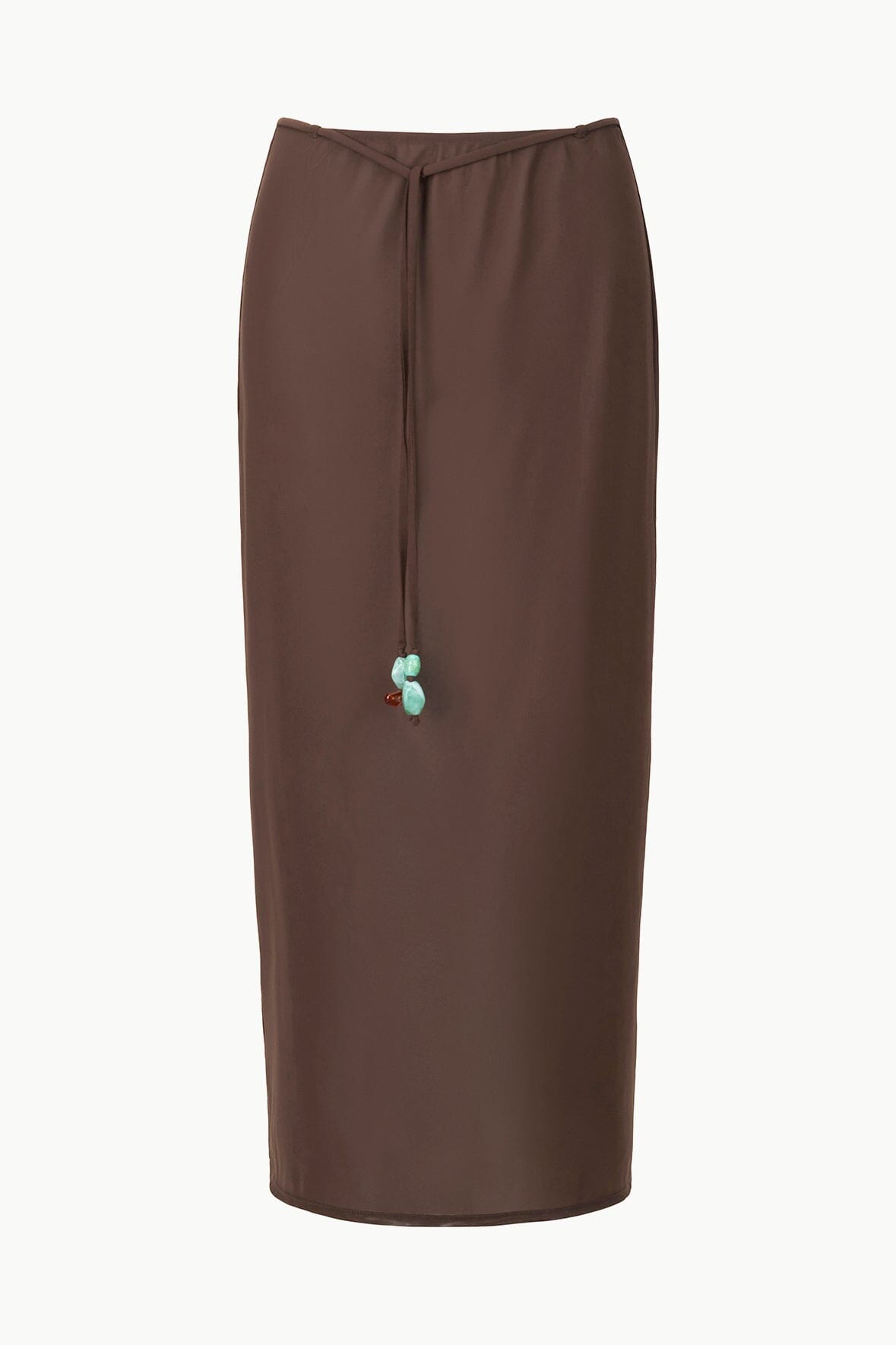 The Milena is a chic ankle length swim cover-up skirt in our power mesh, with a drawstring waist and beaded detailing on the ties.