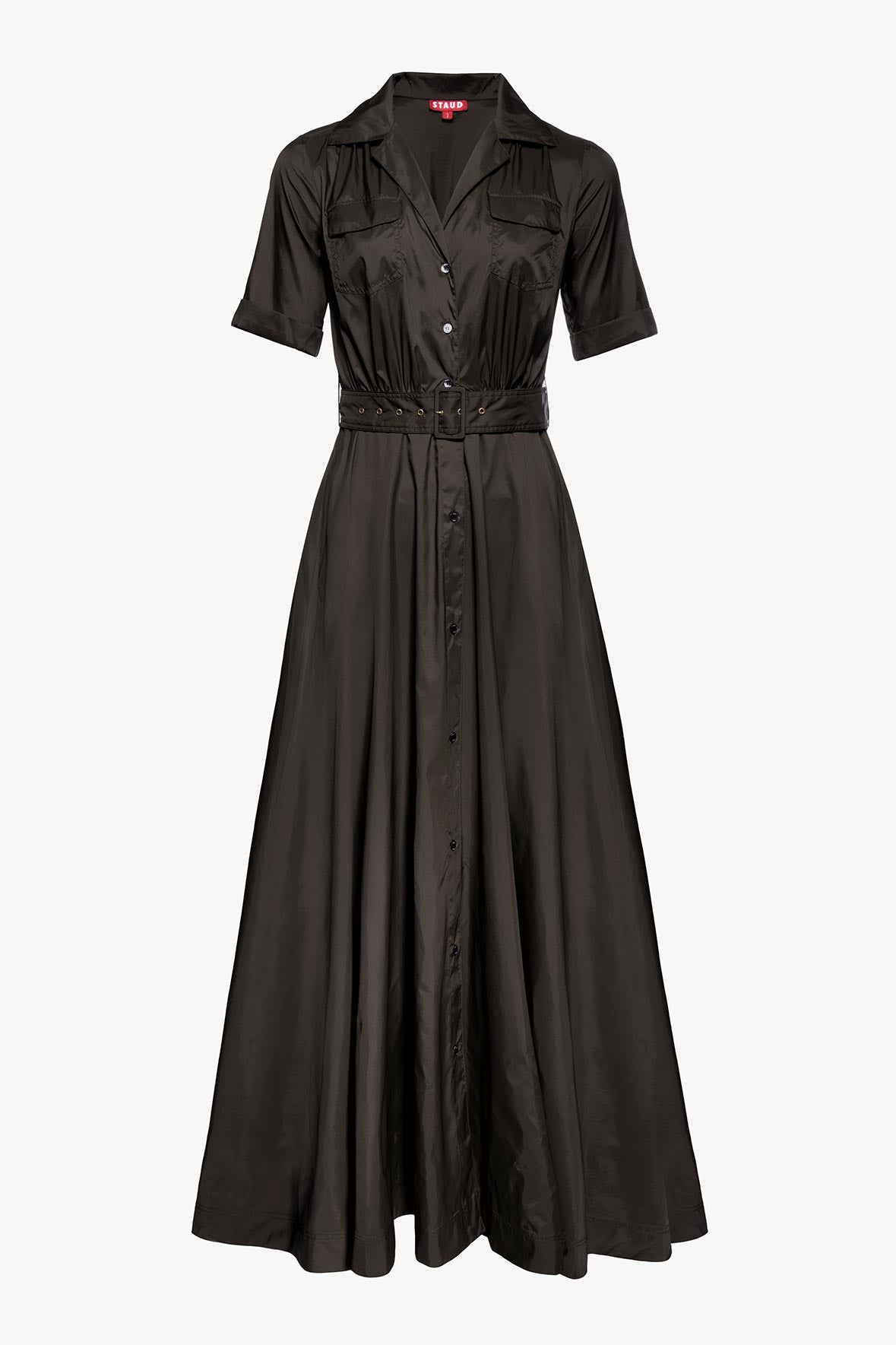 The Millie is a full length dress made out of our sustainable recycled tissue nylon. This dress features two front pockets, a button down front and matching belt.