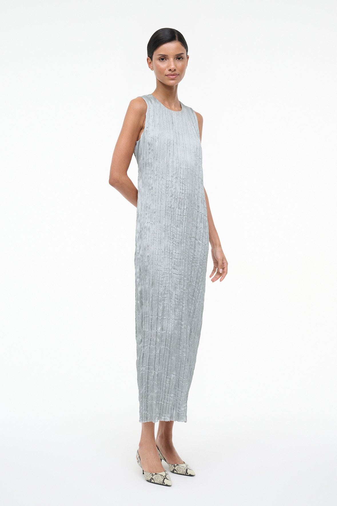 The Mizu is a plisse midi length column dress with a removable waist tie. It can be layered over the Nami Pant for a coordinated set or dressed up with a heel for a night out.