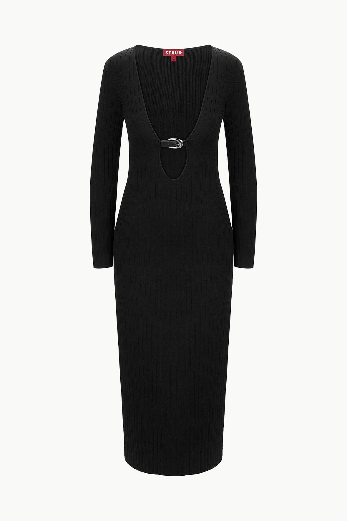 A long sleeve, fitted knit dress, the Murphy features a low cut neckline with buckle detail at the chest and long sleeves.