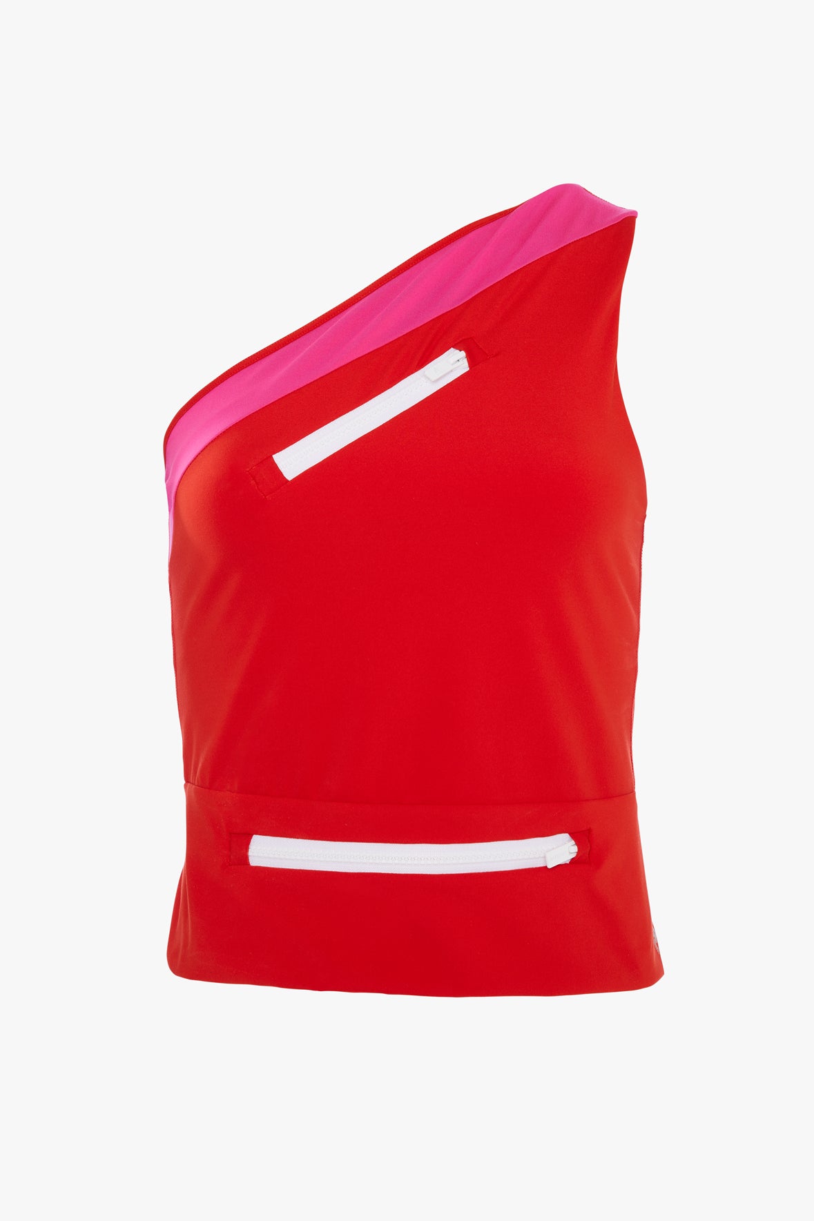 A one-shoulder top with zip-front chest pocket constructed out of NB DRYx fast-drying technology. The NB x STAUD Zip Top freatures a drop-in utility waist pouch, a soft jersey inner shelf bra with power mesh, and reflective back logo.