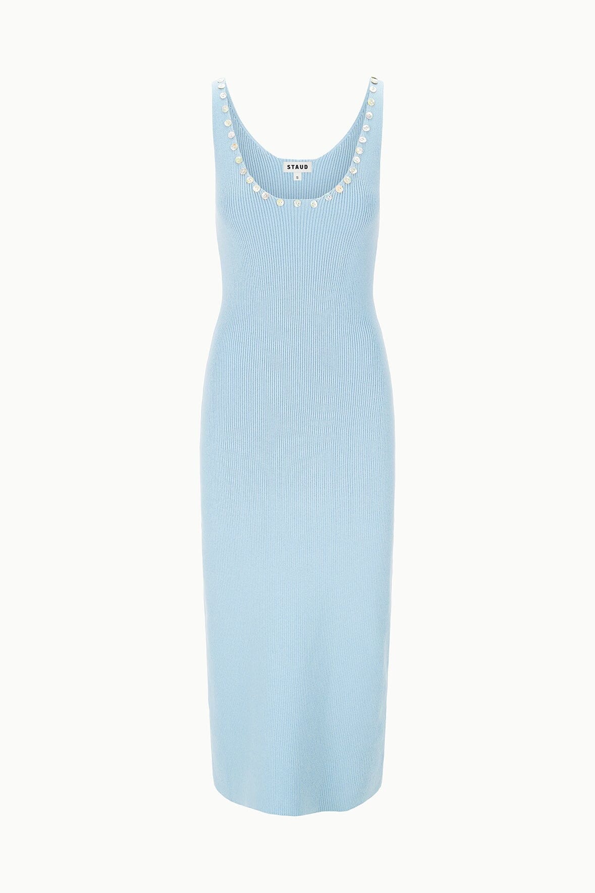 A sophisticated midi dress crafted from a compact merino wool and cotton blend for breathable comfort. The Neva Dress features an elegant neckline adorned with iridescent mother of pearl buttons that catch the light.