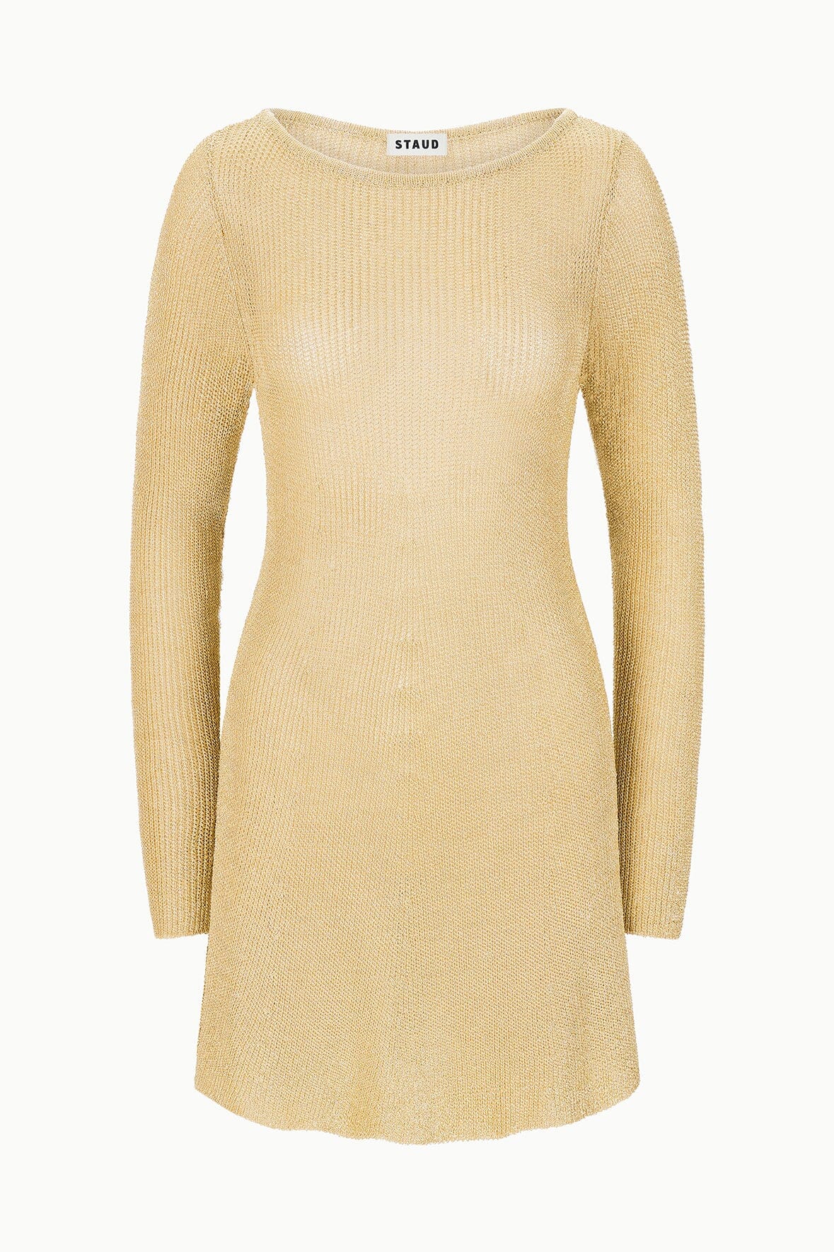 The Nikitta Mini Dress in gold metallic knit delivers effortless elegance with its long sleeve silhouette. This easy-to-wear piece combines luxe shimmer with relaxed sophistication.