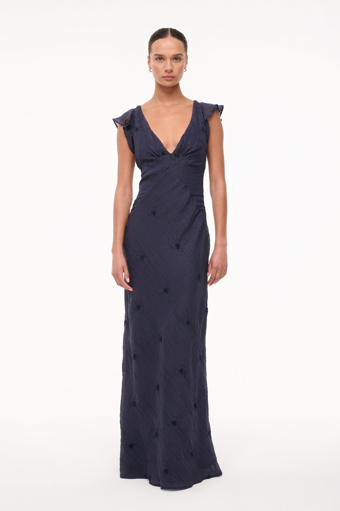 The Nori is a maxi length dress with a v-neckline, empire waist and flutter sleeves. The Nori is fully lined throughout the bodice and skirt.