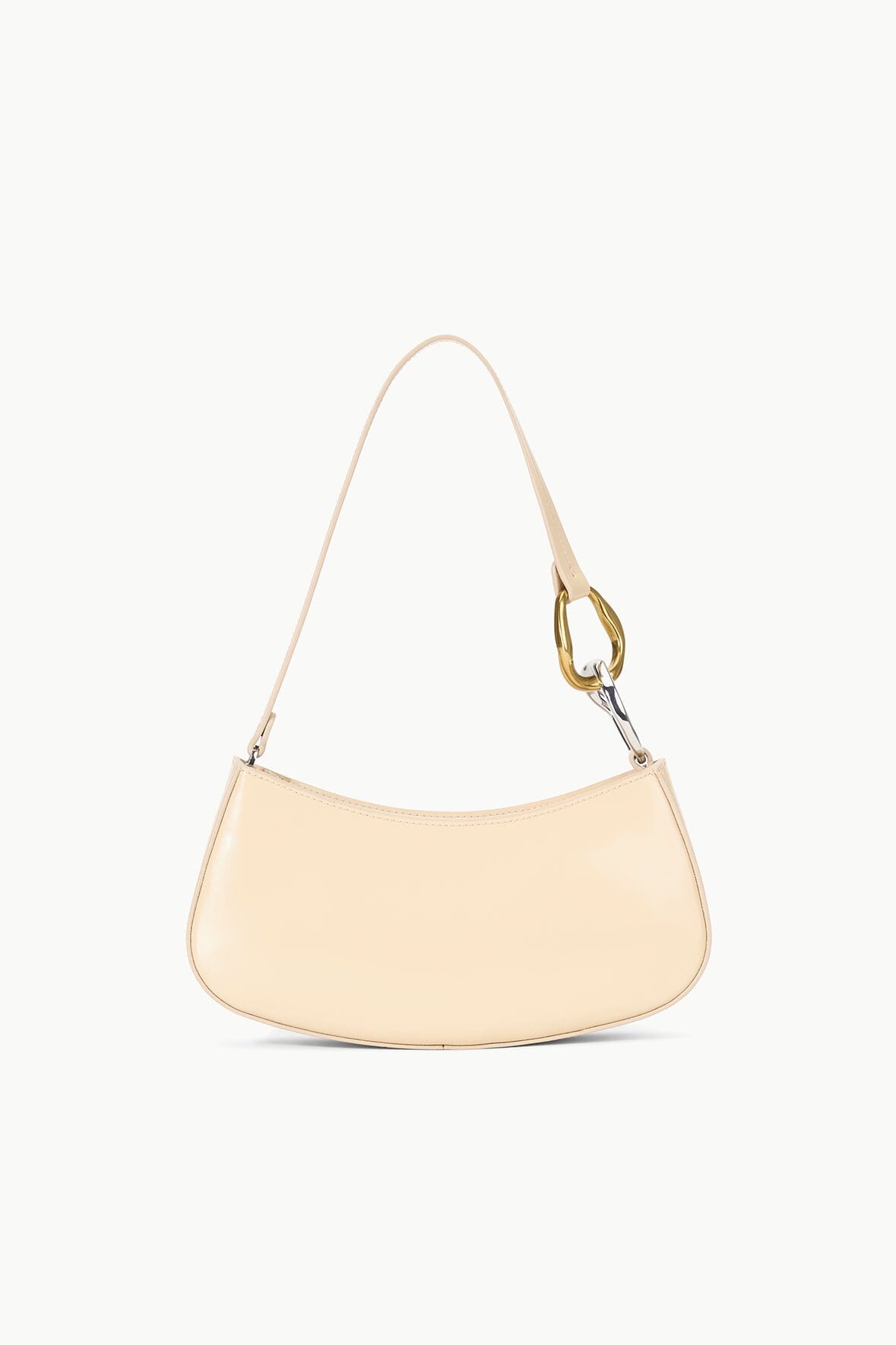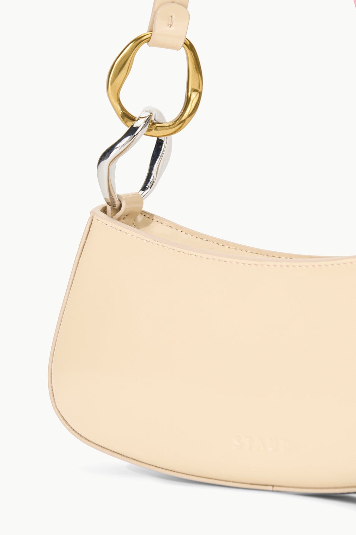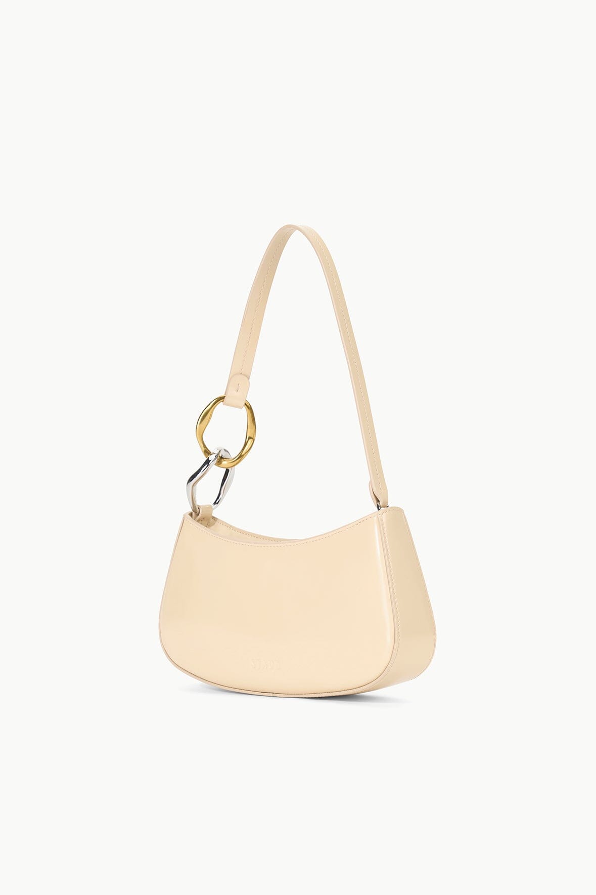 The Ollie Bag is a mini shoulder bag made out of polished leather. This style features mixed metal hardware on the strap and a zip closure.