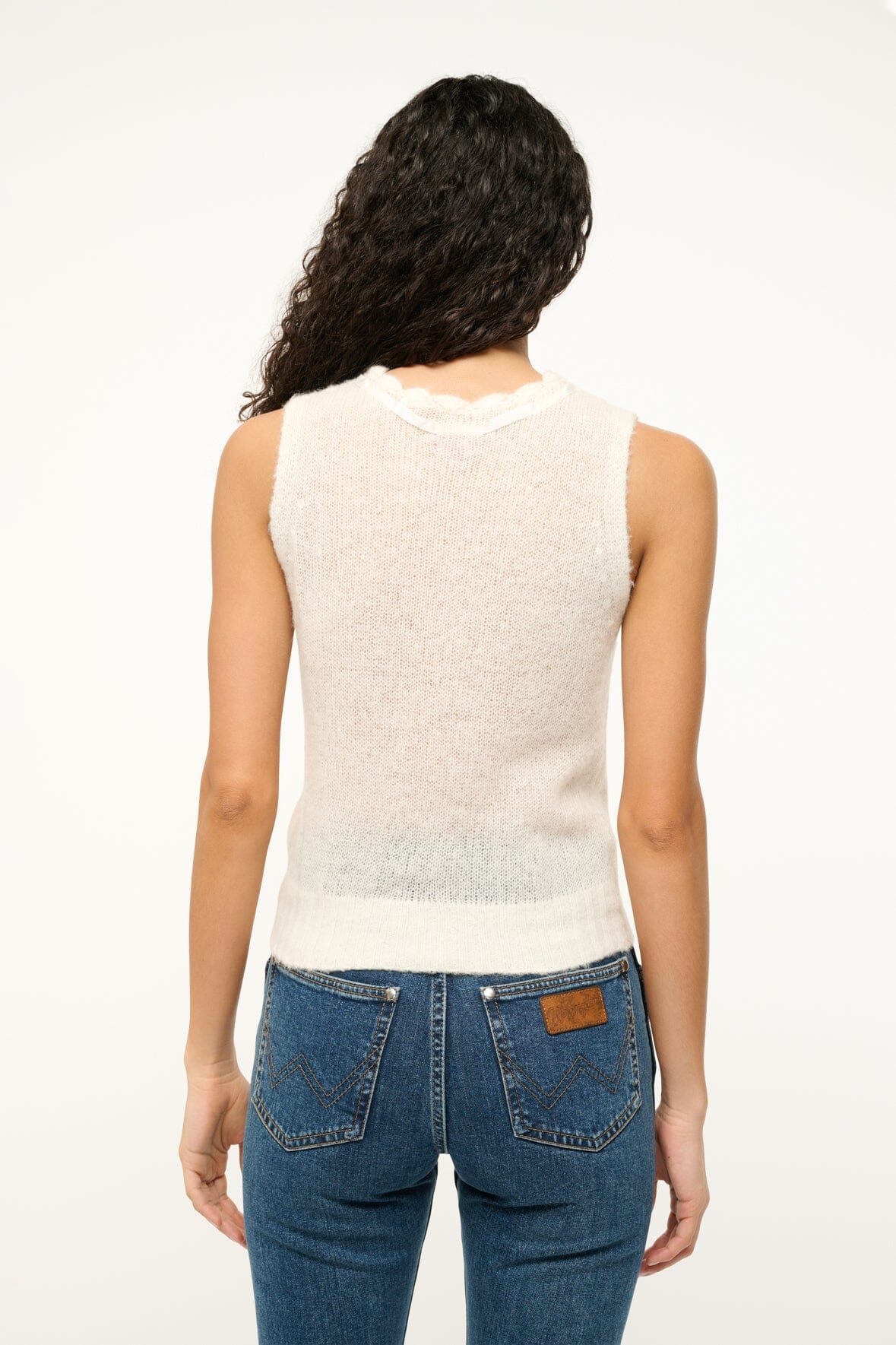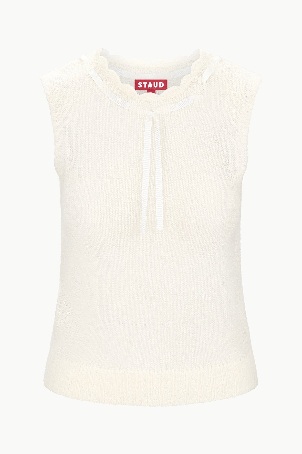 A sheer fuzzy knit tank made from a fluffy alpaca wool blend, the Penelope Top features a ribbon tie detail at the neck